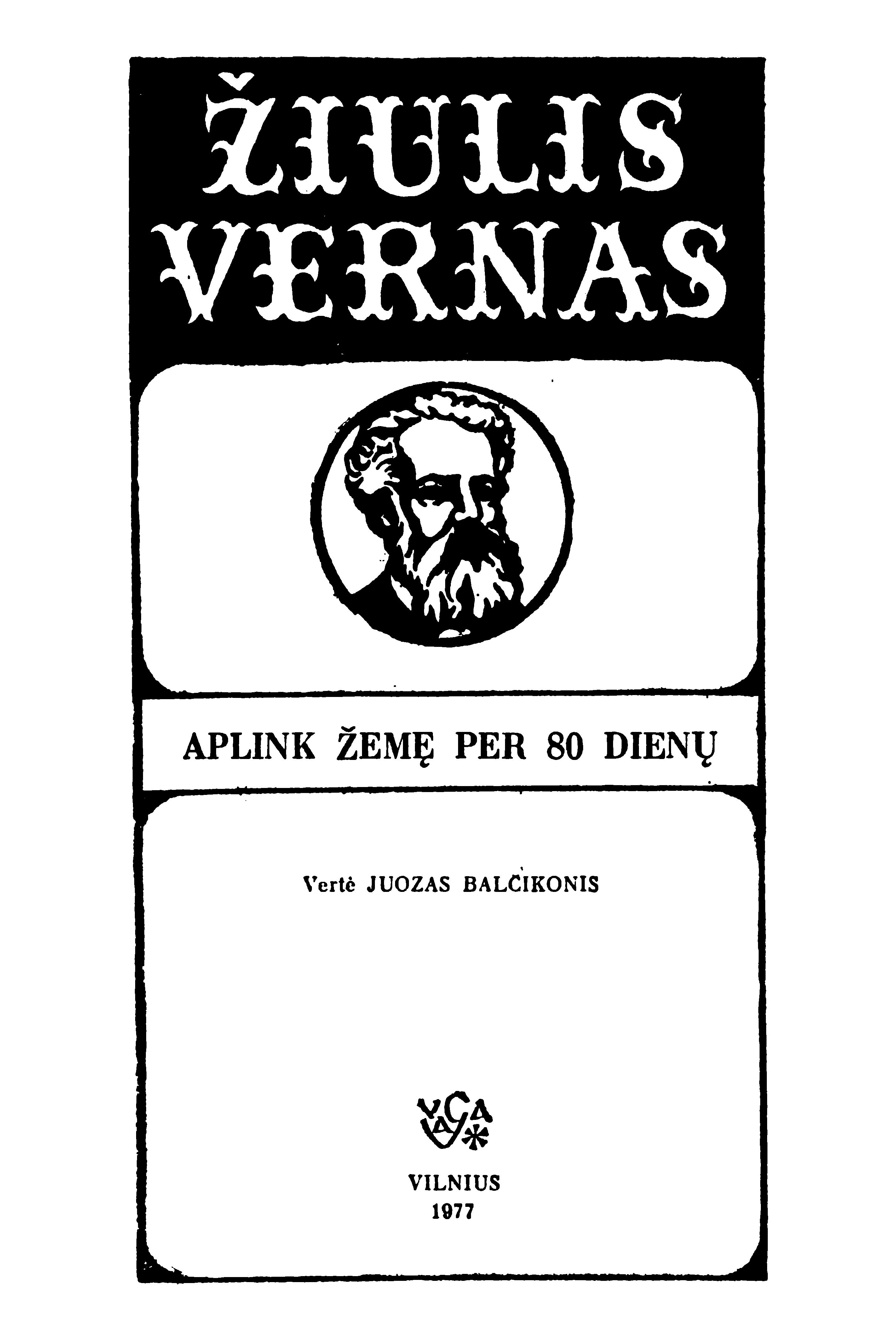 | Antraštė | Aplink Žemę per 80 dienų / Žiulis Vernas; vertė Juozas Balčikonis. – 2-asis leidimas. – Vilnius: Vaga, 1977. – 182, [2] p. [lt] |