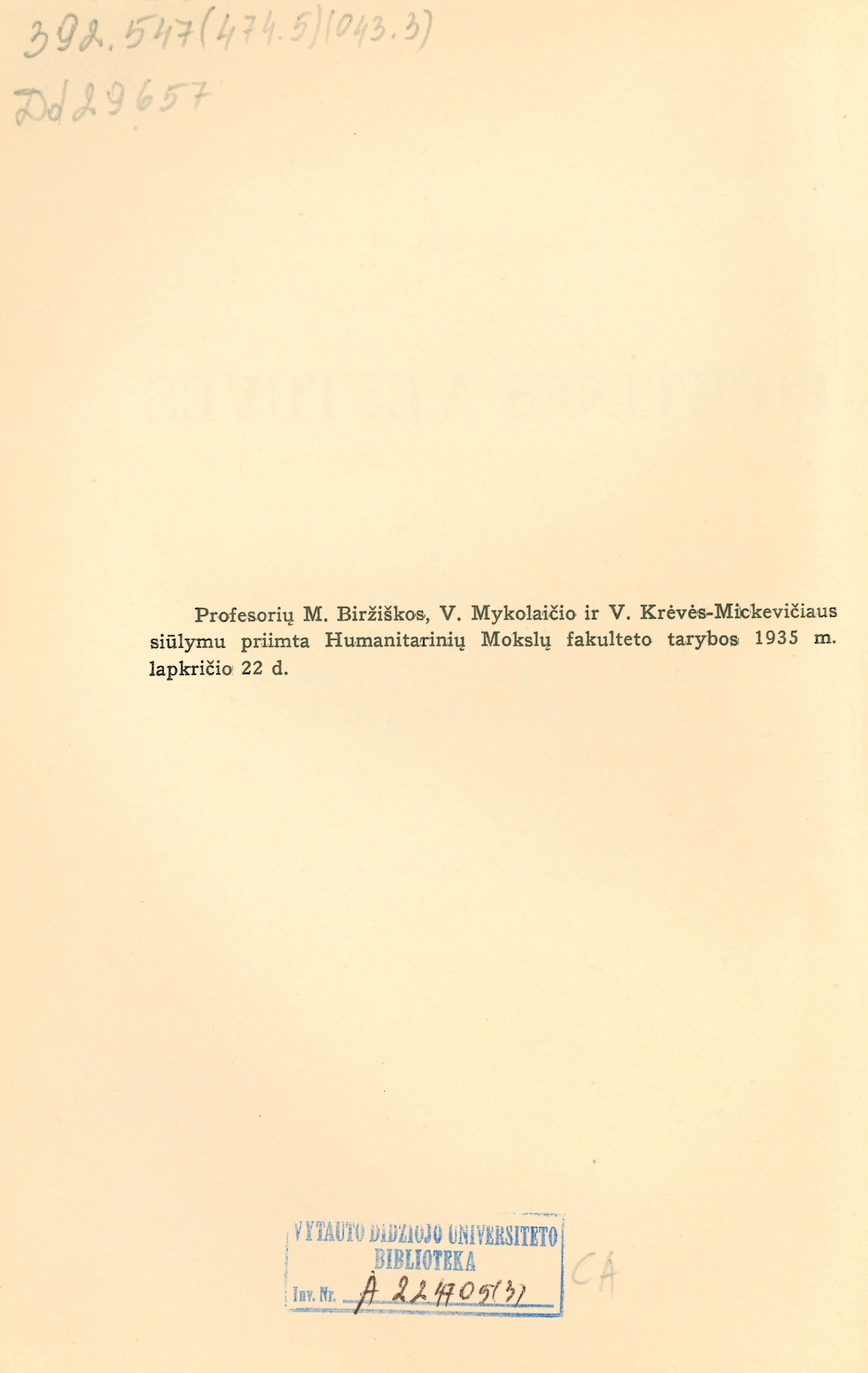 Turinys: Baldauskas Juozas. Pirktinės vestuvės (p. 3-123); Вишинский Павел / Višinskis Povilas. Антропологическая характеристика жмудинов (p. 124-178); Perkowski Józef. Resztki dawnych wierzeń i kultów na Żmudzi (p. 179-190); Baldauskas Juozas. Mokslas ar autoreklama (p. 191-197); Krėvė-Mickevičius Vincas. Mūsų tautosaka ir gyvenimas (p. 198-228). [lt]