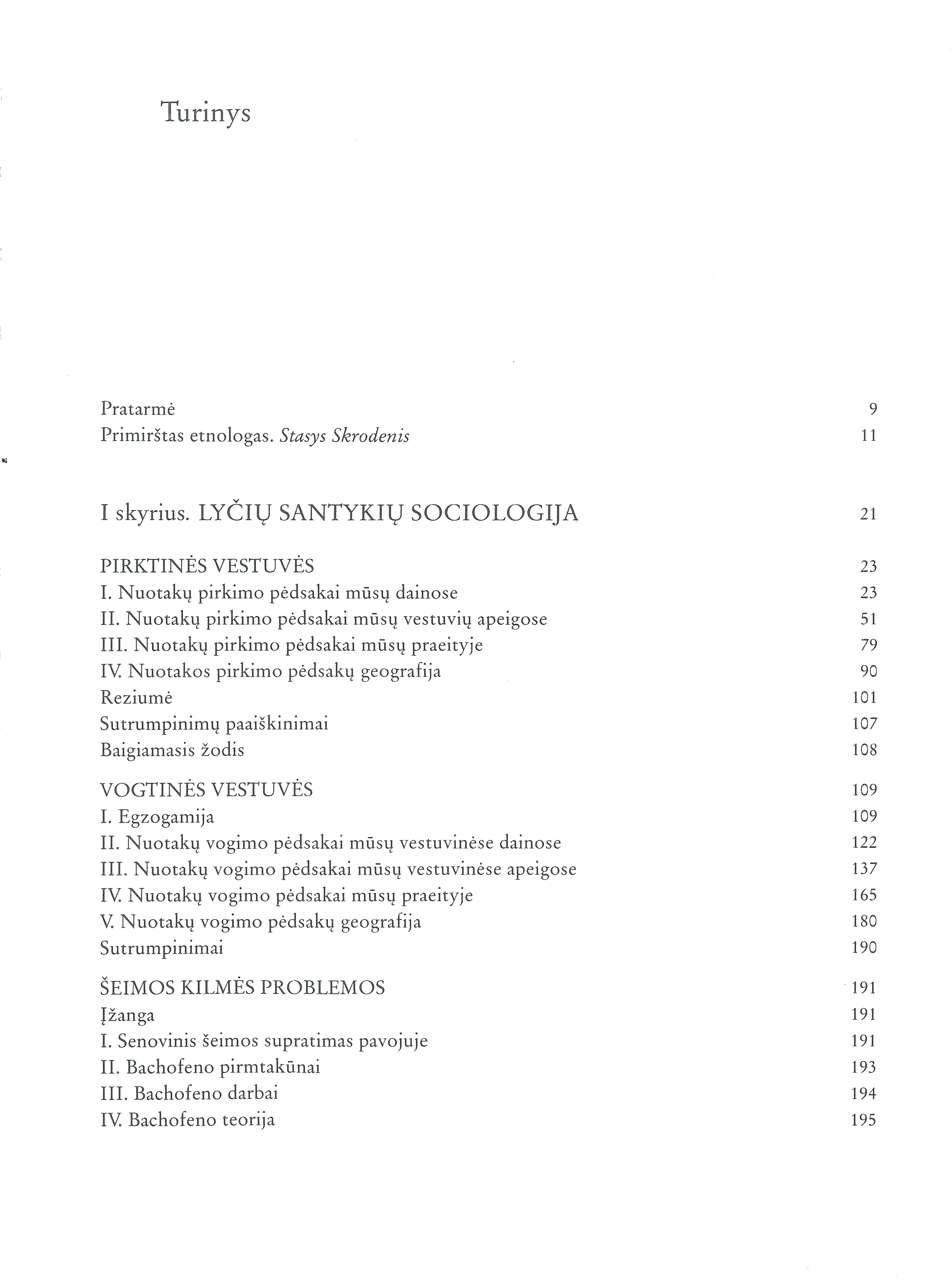 | Turinys: Studijos - Pirktinės vestuvės (1935); Vogtinės vestuvės (1940); Lyčių santykių sociologija (1932-1933). Straipsniai - Vaikai, pavainikiai, moterystė (1935); Ekonominiai sumetimai mūsų vestuvinėse dainose (1932); Darbštumas - lytinės atrankos faktorius (1934); Egzogamijos problema mūsų dainose (1936); Darbo dainos (1932); Dainų berneliai (1933); Siratėlių dalia (1938); Kelios pastabos dėl demonologijos (1938); Mūsų dainų erotika (1935); Mūsų patarlės (1940); Krivūlė (1935); Dvasios atsiradimas (1931); Lyties įtaka religijai (1931); Kaip kinta dievai (1931); Dievai ir moterys (1931); Iš kur tas prima aprilis (1940); Joninės - vasaros ir derliaus šventė (1940); Kalėdos ir jų papročiai (1937); Vincas Krėvė - tautosakininkas (1936); „Kalevalai“ šimtas metų (1935); Tautosaka ir erotika (1934); Mokslas ar autoreklama (1935); Pasquino pėdsakai Lietuvoje (1937); Fr. Šilerio gyvenimo bruožai (1934); Retas jubiliejus (1934); Apie formalinį metodą (1929); Straipsniai „Lietuviškojoje enciklopedijoje“ (1933-1940); Rasizmas (1934); Rasizmas ir imperializmas (1935); Darbas, linkmė, organizavimas (1929). [lt] | |