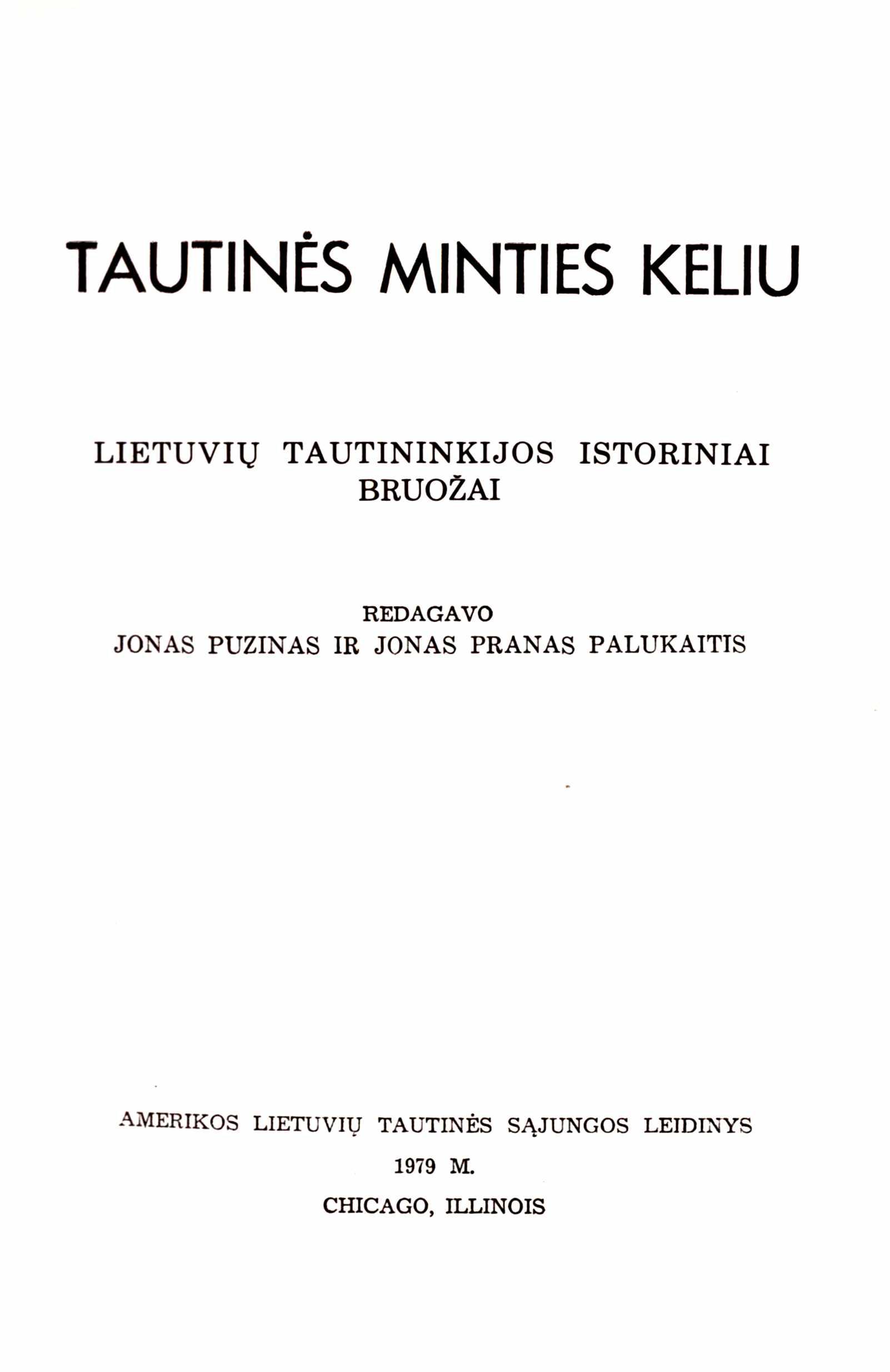 | Yra dalis | Tautinės minties keliu : lietuvių tautininkijos istoriniai bruožai. – Chicago: Amerikos lietuvių tautinė sąjunga, 1979, p. 71-159 |