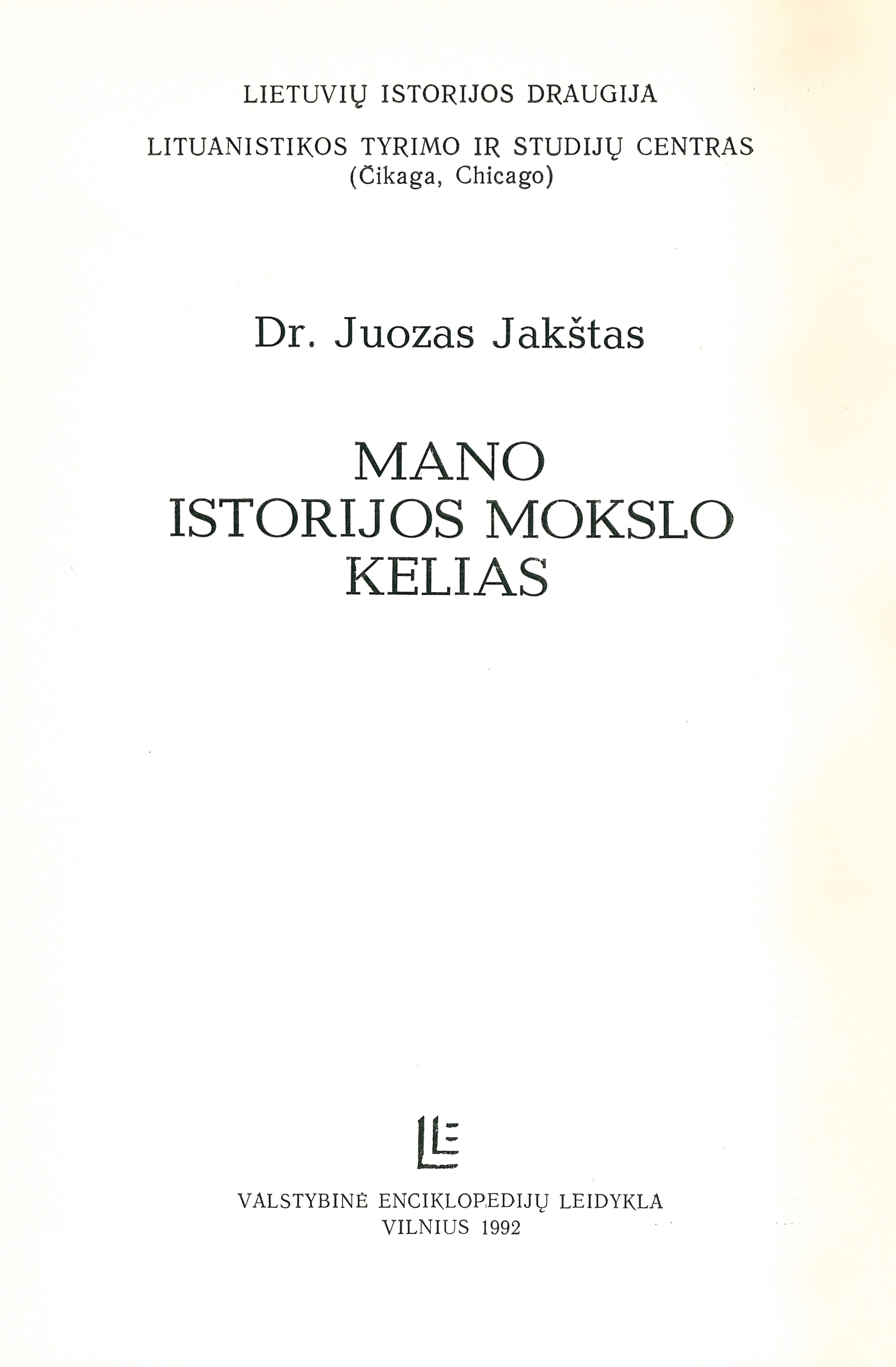 Antraštė Mano istorijos mokslo kelias / Juozas Jakštas. – Vilnius : Valstybinė enciklopedijų leidykla, 1992. – 46 p. [lt]