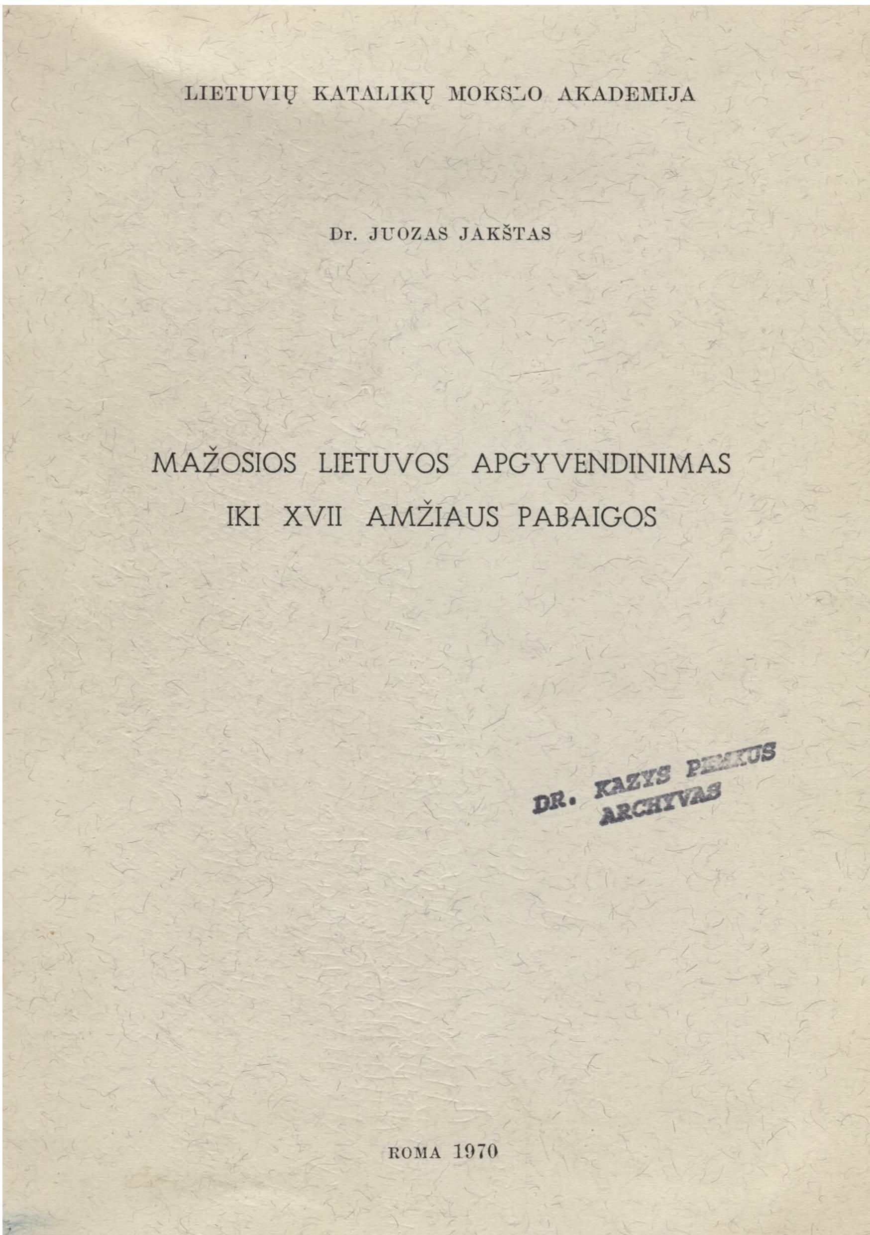 | Mažosios Lietuvos apgyvendinimas iki XVII amžiaus pabaigos / Juozas Jakštas. – Roma: [Lietuvių katalikų mokslo akademija], 1970. – 126 p. [lt] | |
