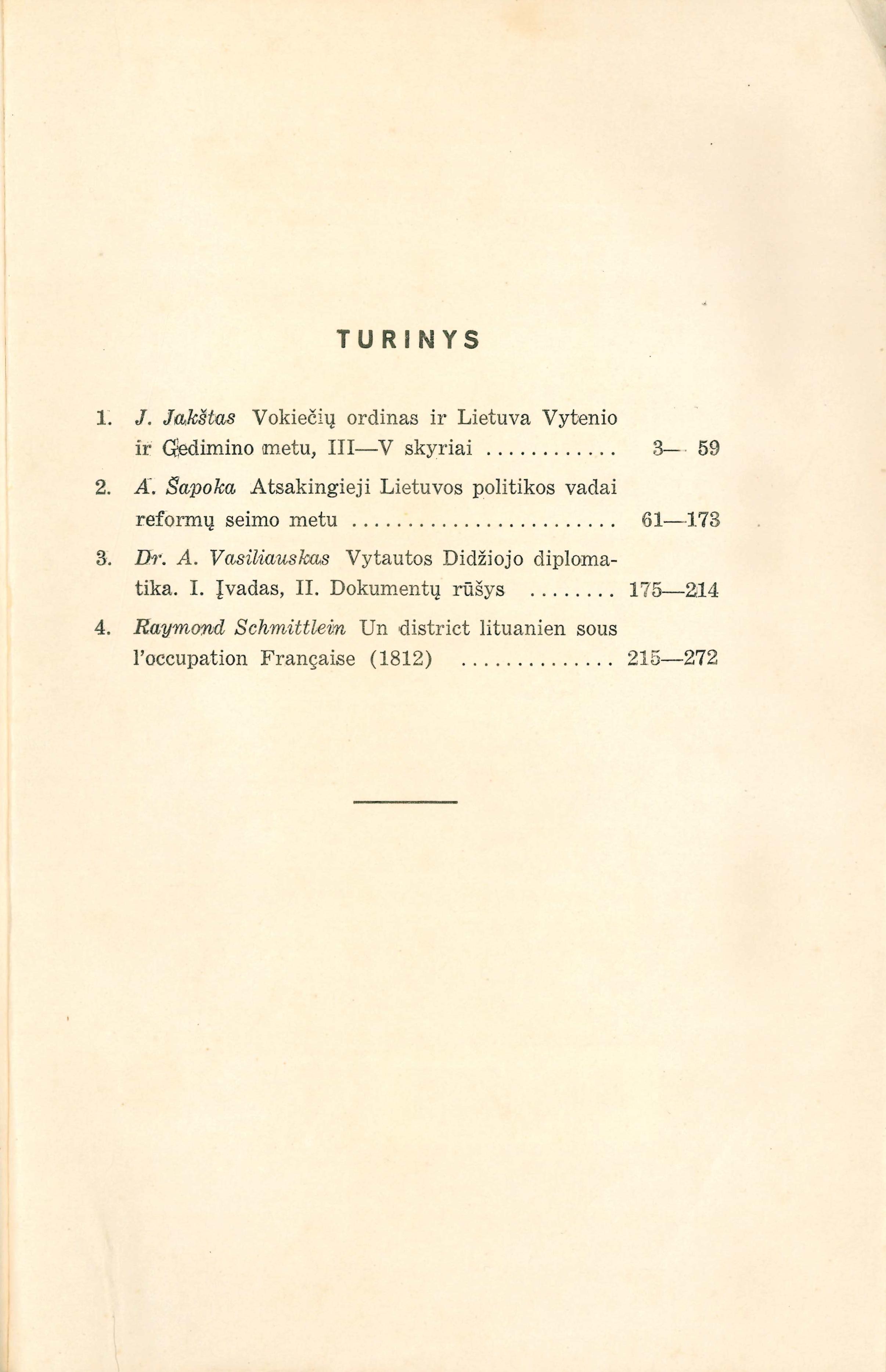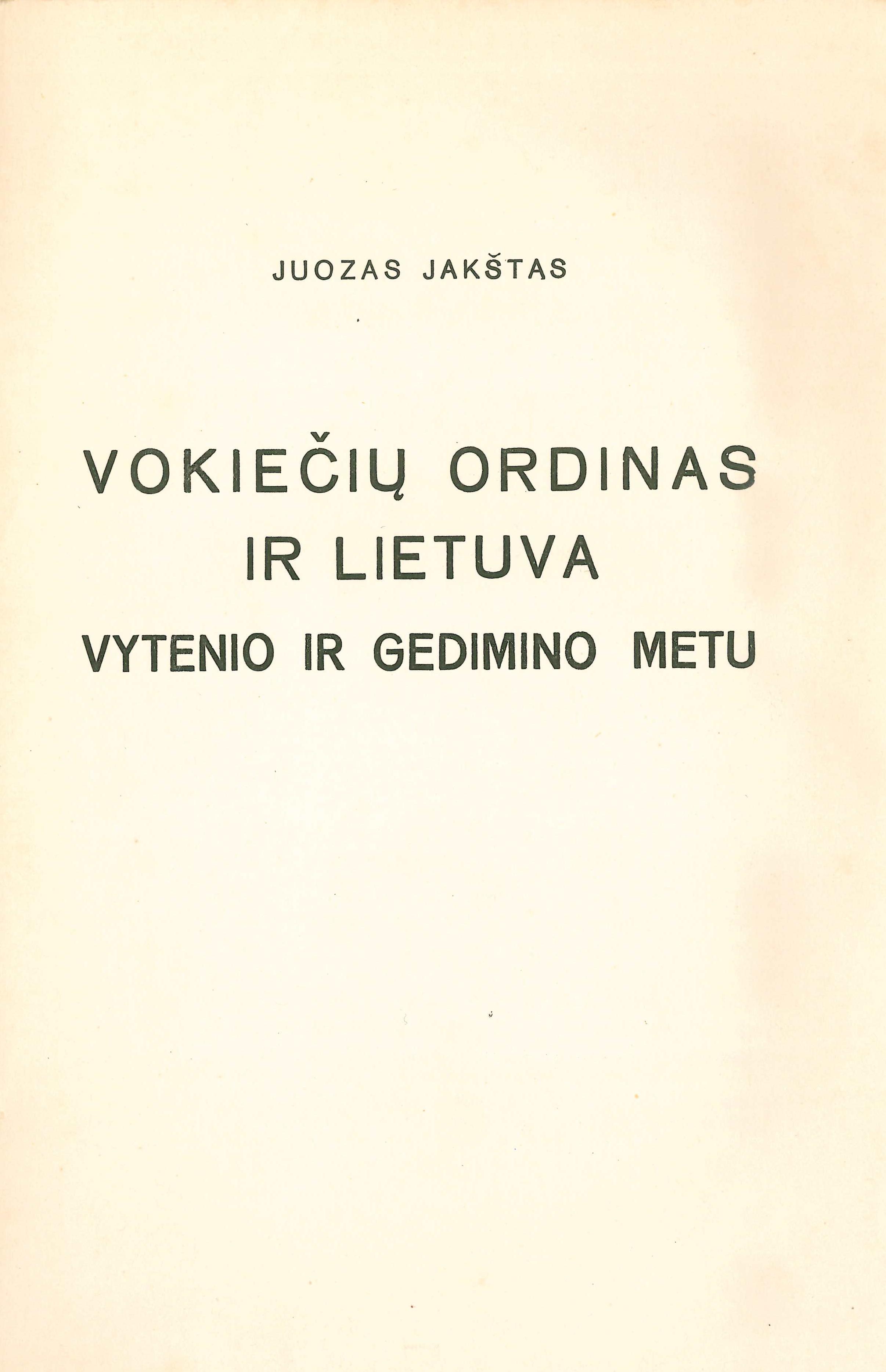 Antraštė Vokiečių ordinas ir Lietuva Vytenio ir Gedimino metu. In: Senovė. T. 1 (1935), p. 125–156; Senovė. T. 2 (1936), p. 3–59. [lt]