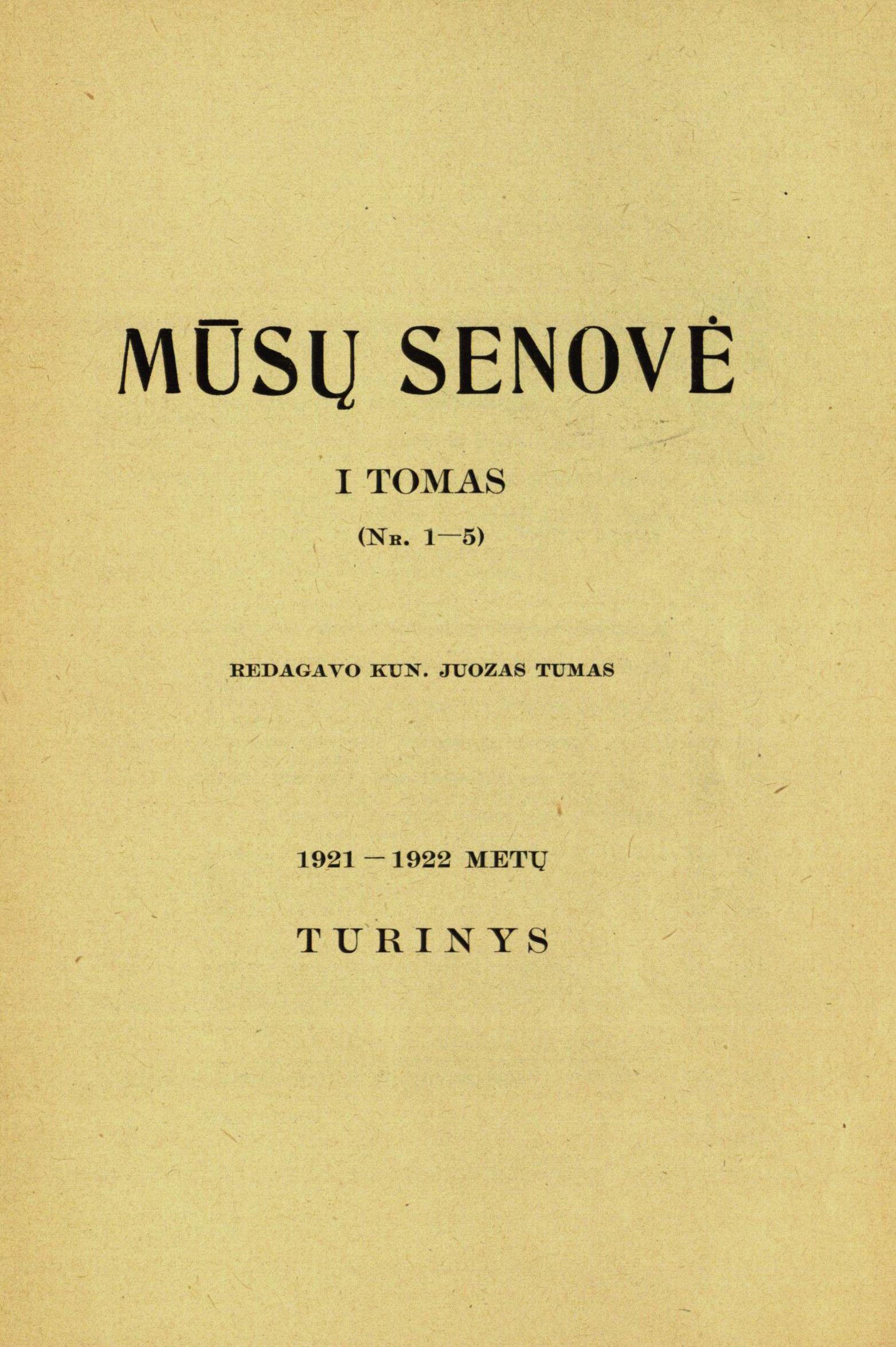 Mūsų senovė : žurnalas Lietuvos istorijos medžiagai rinkti. T. 1, Nr. 1-5 / redaktorius Juozas Tumas. – Kaunas ; Tilžė : Švietimo ministerija, 1921-1922.