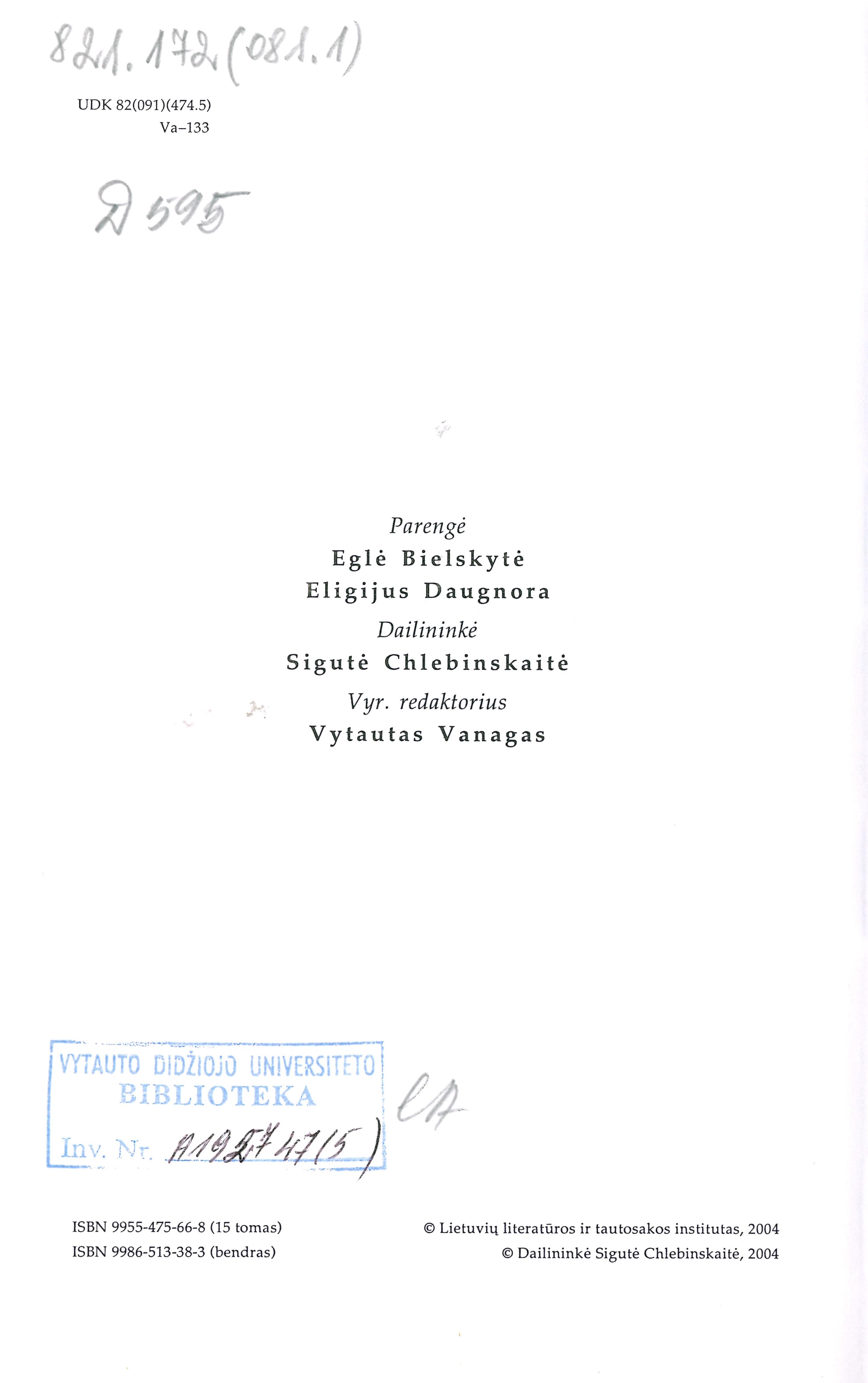 T. 15 : Literatūros istorija, 1899-1929 / parengė Eglė Bielskytė, Eligijus Daugnora. – Vilnius, 2004.