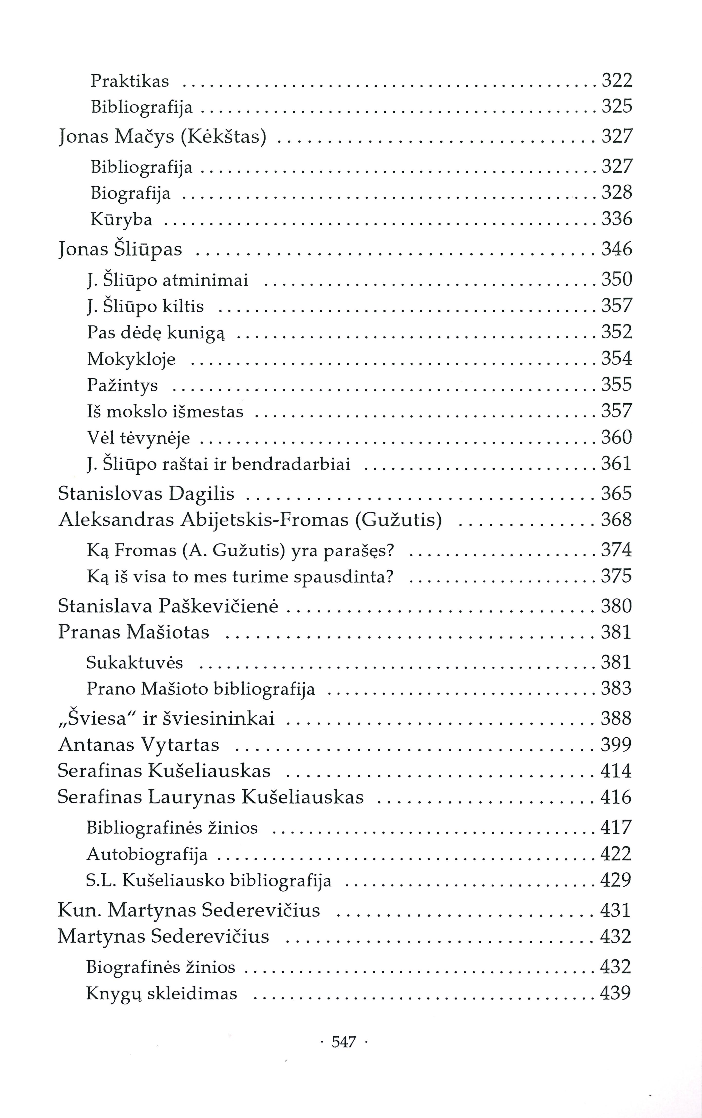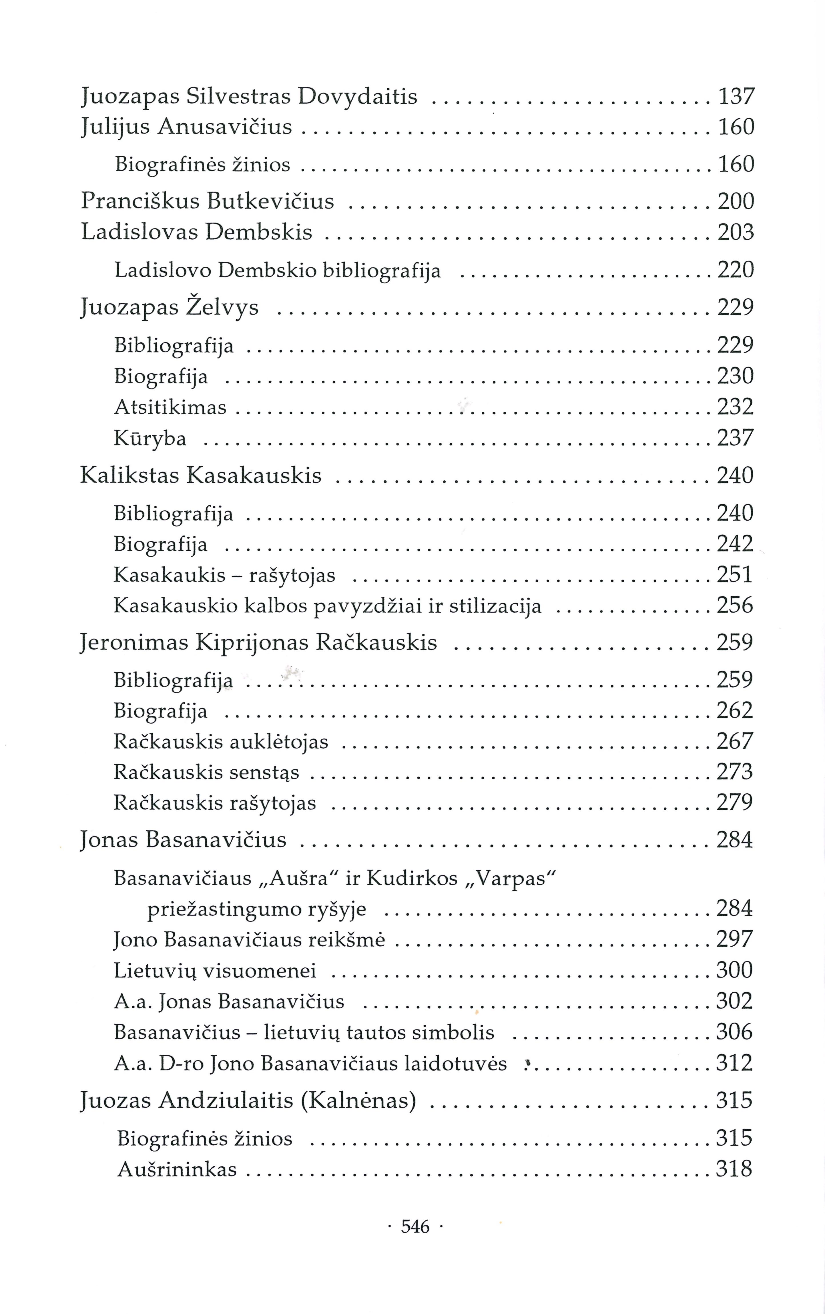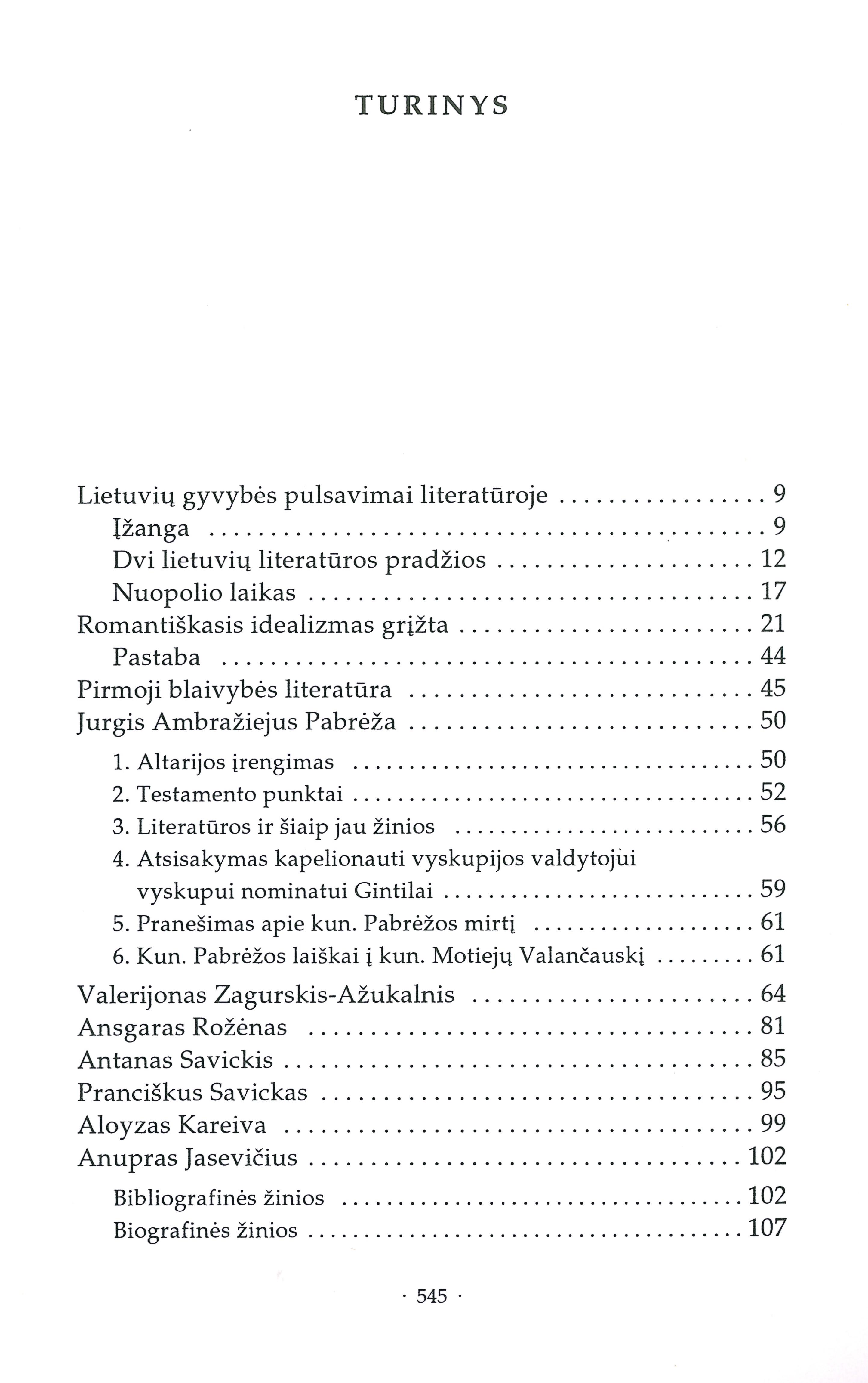 parengė Eglė Bielskytė ir Eligijus Daugnora. Turinys: Lietuvių gyvybės pulsavimai literatūroje (1923); Romantiškasis idealizmas grįžta (1927); Pirmoji blaivybės literatūra (1926); Jurgis Ambražiejus Pabrėža (1900); Valerijonas Zagurskis-Ažukalnis (1929); Ansgaras Rožėnas (1929); Antanas Savickis (1929); Pranciškus Savickas (1929); Aloyzas Kareiva (1929); Anupras Jasevičius (1899; 1929); Juozapas Silvestras Dovydaitis (1929); Julijus Anusavičius (1929); Pranciškus Butkevičius (1929); Ladislovas Dembskis (1929); Juozapas Želvys (1907); Kalikstas Kasakauskis (1926); Jeronimas Kiprijonas Račkauskis (1926); Jonas Basanavičius (1923; 1927); Juozas Andziulaitis (Kalnėnas) (1926); Jonas Mačys (Kėkštas) (1929); Jonas Šliūpas (1919); Stanislovas Dagilis (1923); Aleksandras Abijetskis-Fromas (Gužutis) (1929); Stanislava Paškevičienė (1929); Pranas Mašiotas (1923); „Šviesa" ir šviesininkai (1923); Antanas Vytartas (1924); Serafinas Kušeliauskas (1915; 1924); Kun. Martynas Sederevičius (1924; 1929)