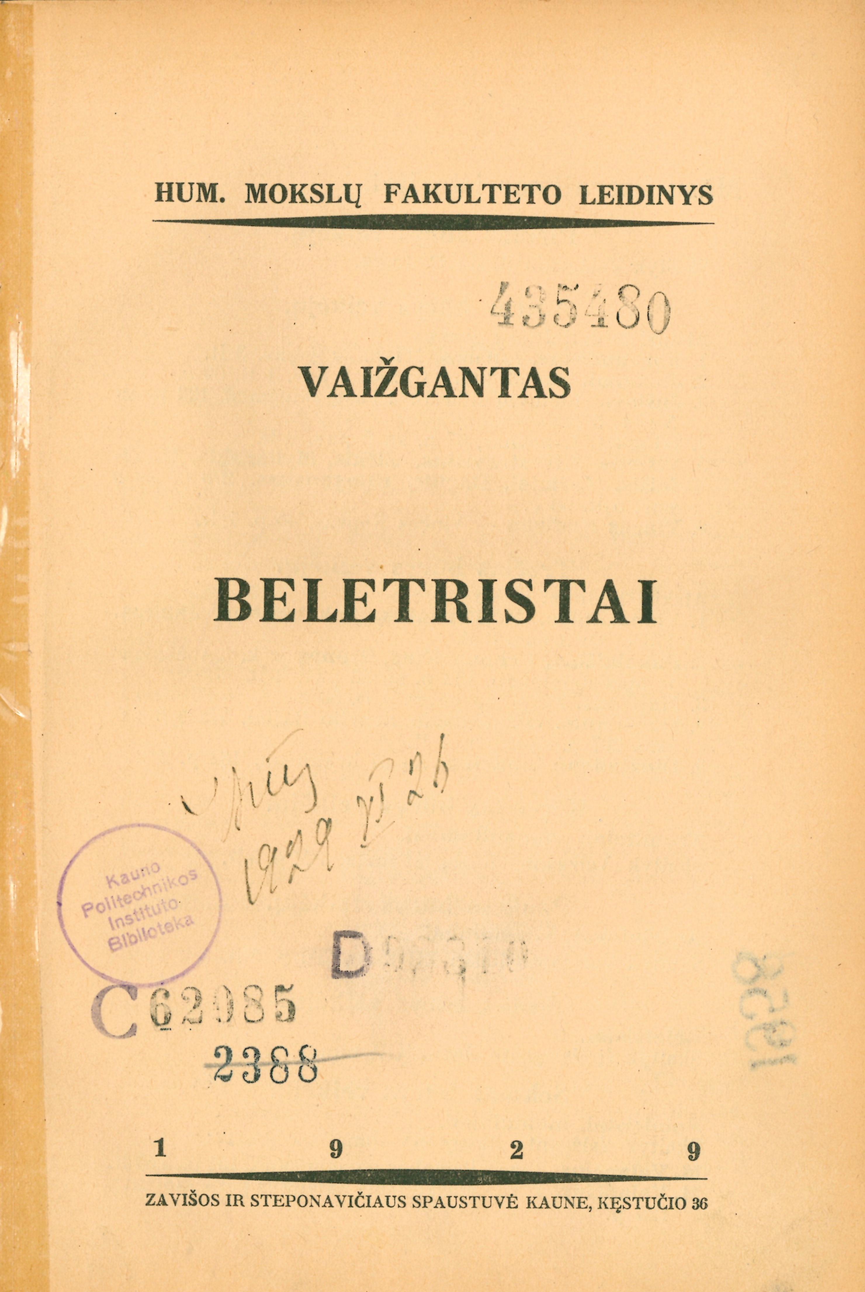 Published Kaunas: Humanitarinių mokslų fakulteto leidinys, 1929