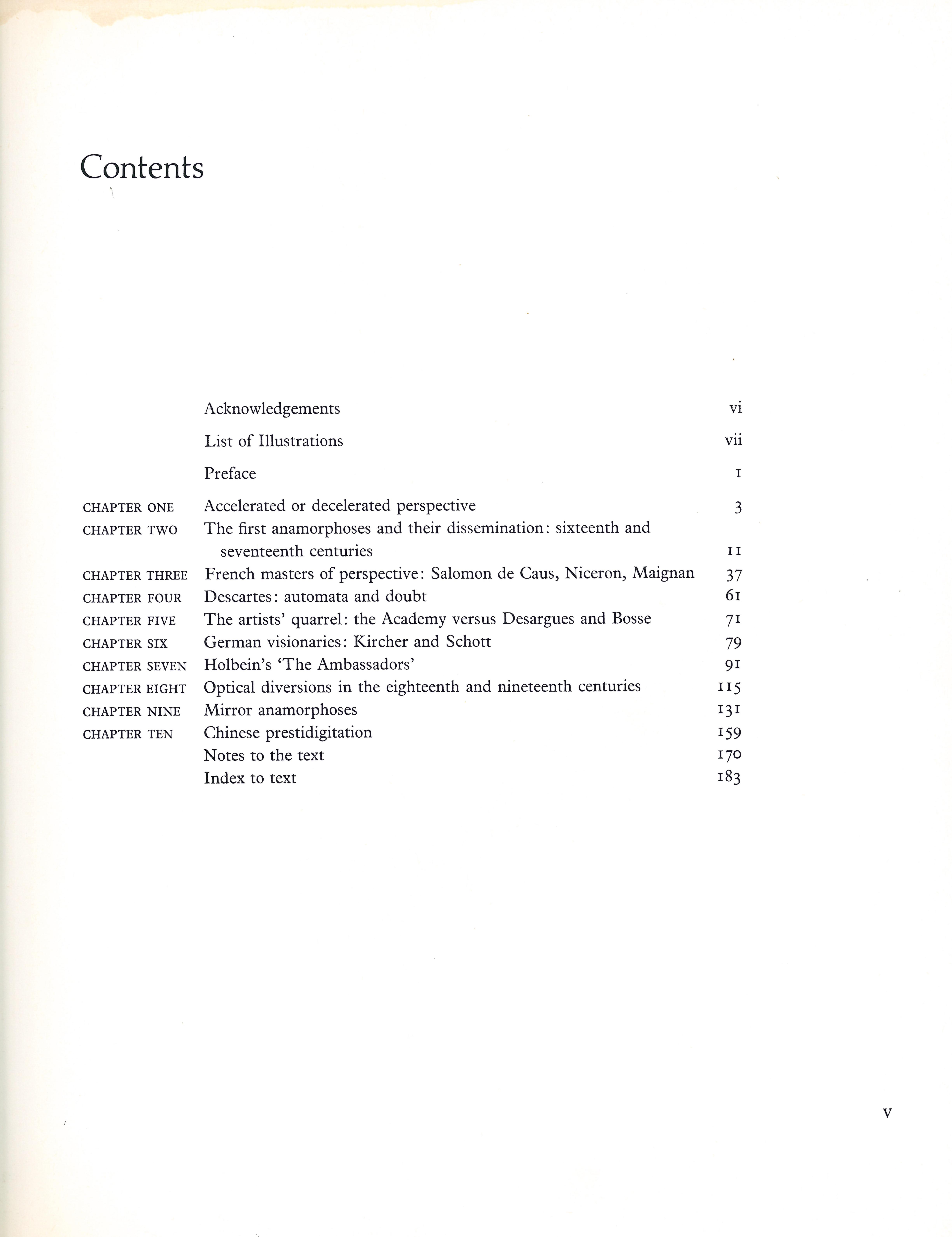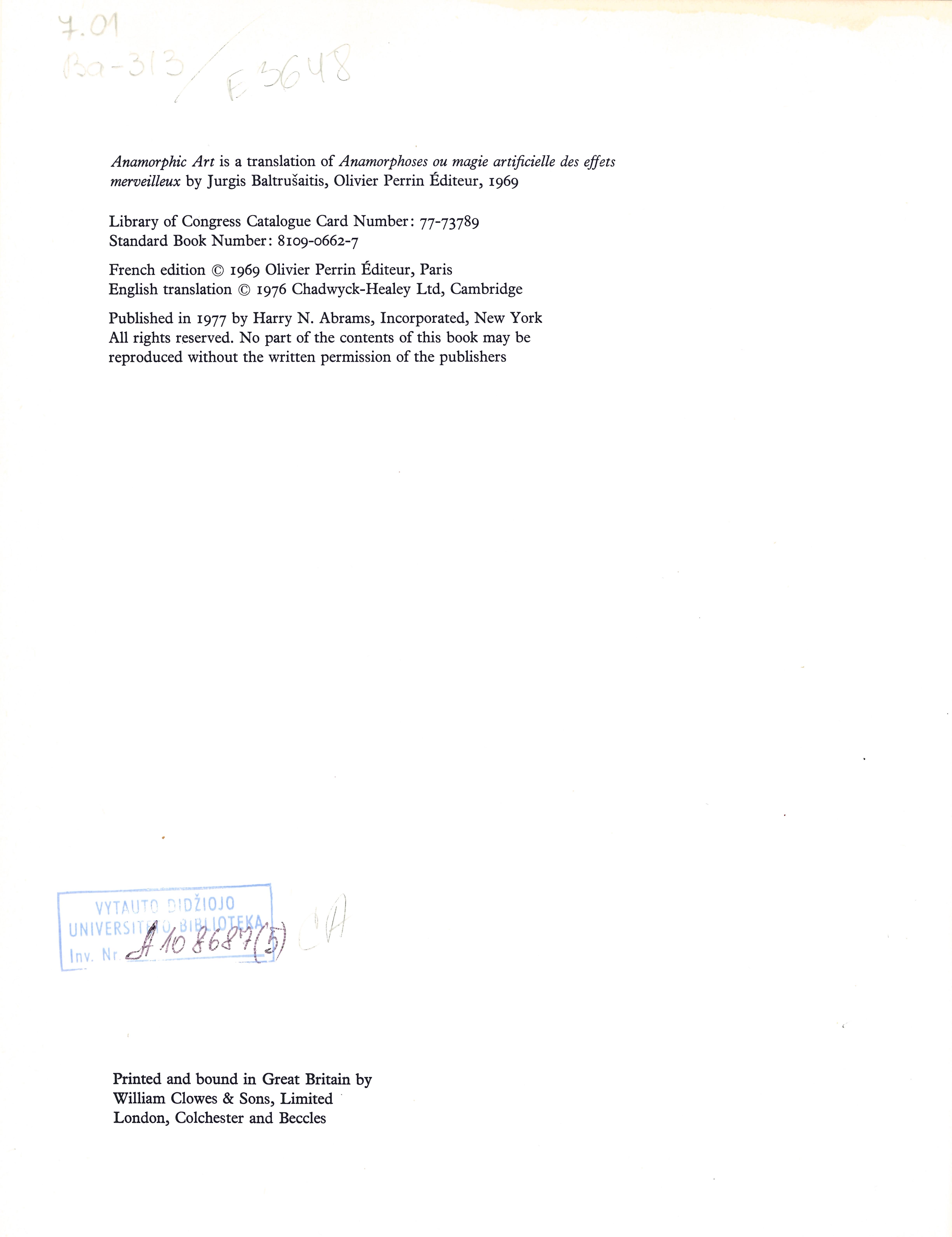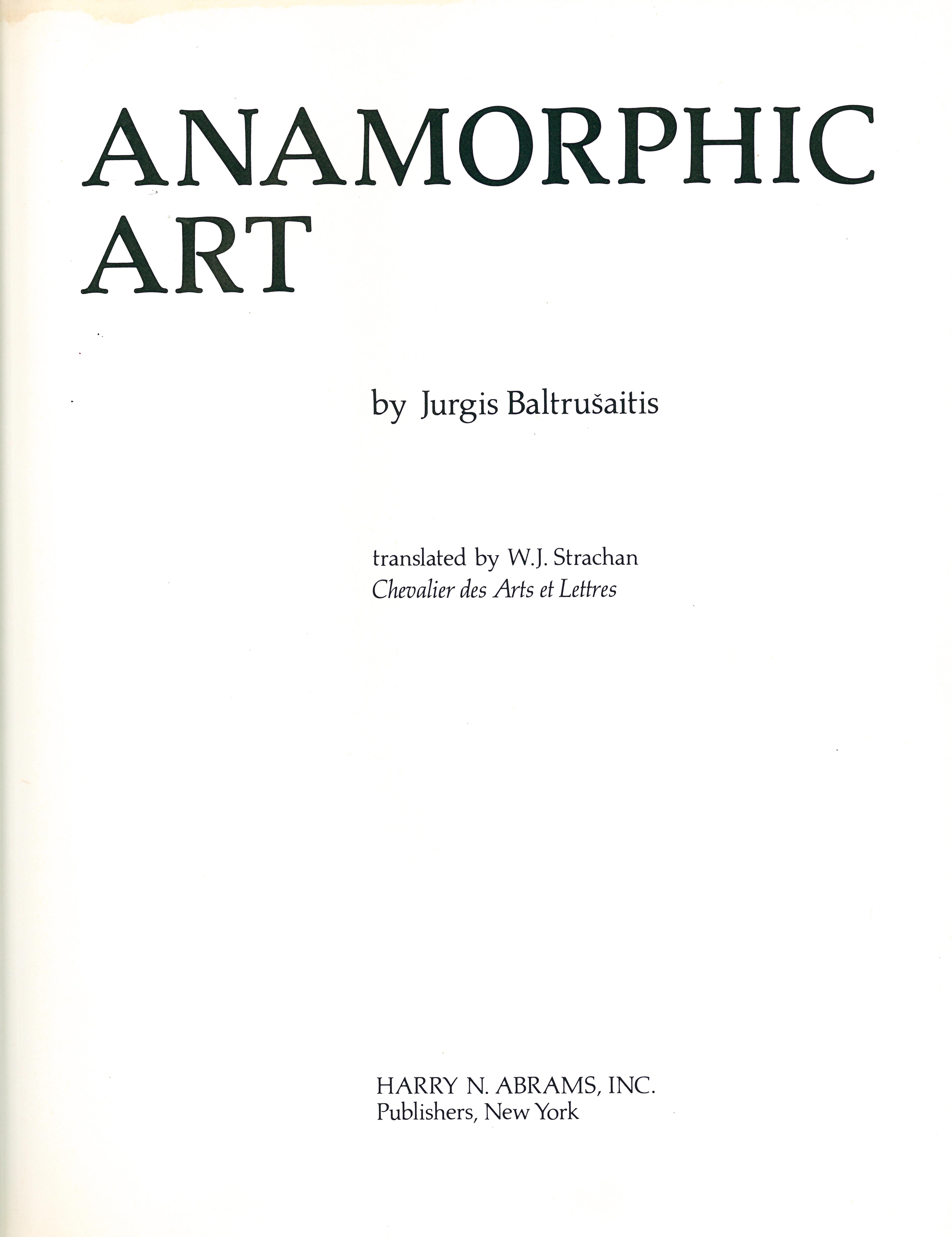 Anamorphic art / by Jurgis Baltrušaitis ; translated by W. J. Strachan. – New York (N.Y.) : Abrams, 1977. – viii, 184 p. : iliustr. – ISBN 0810906627.