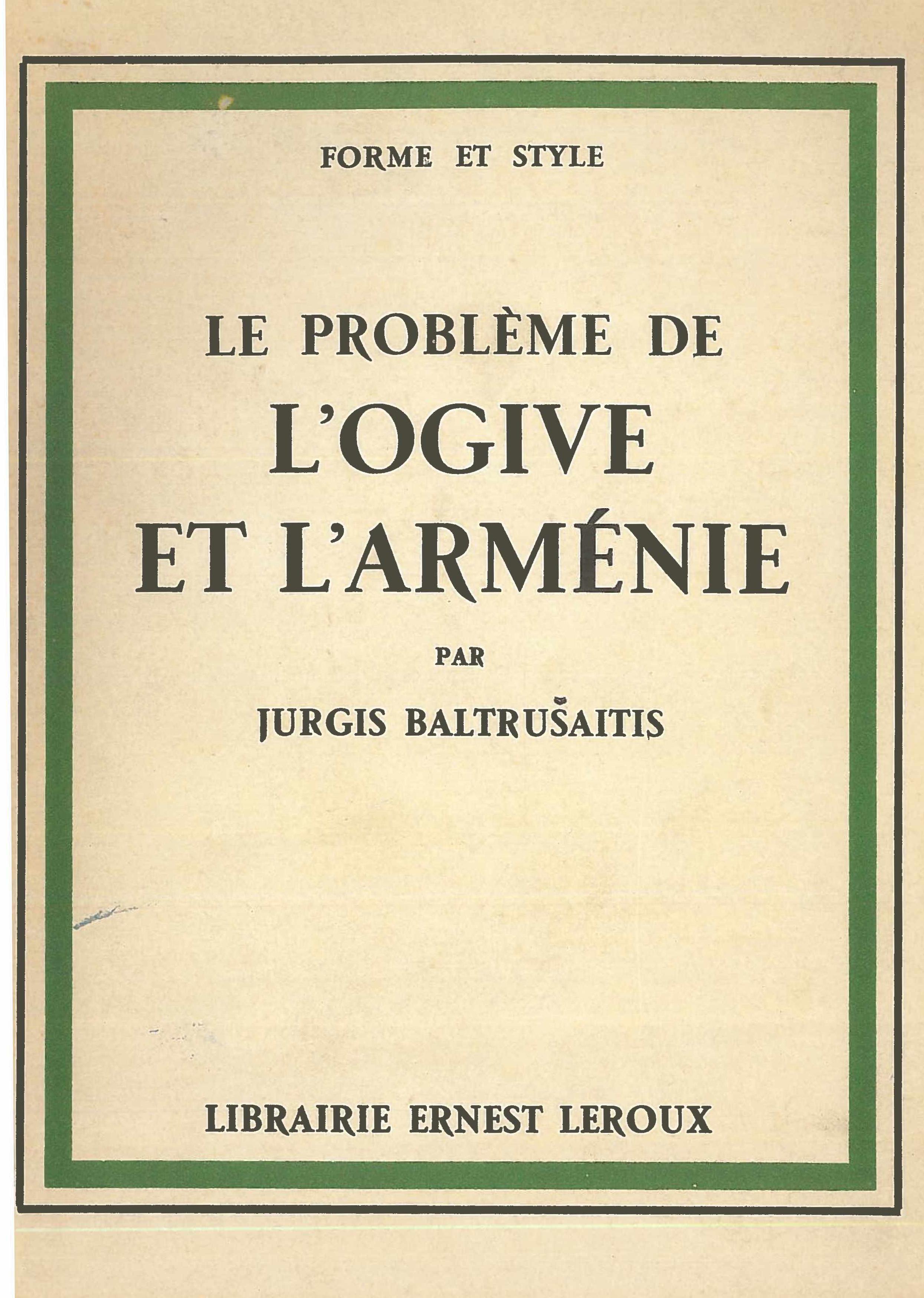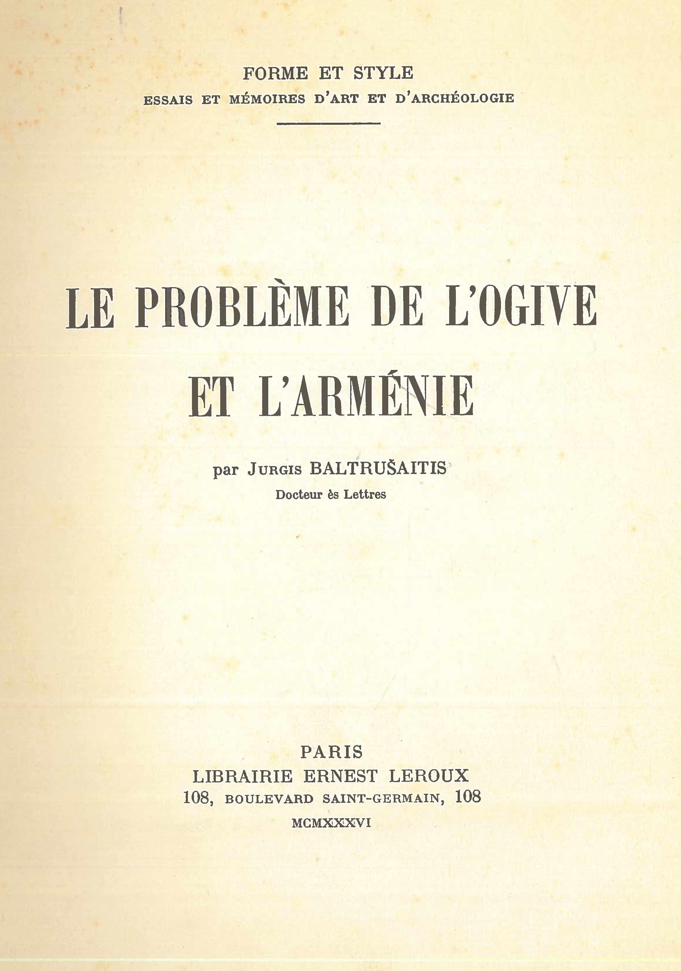 | Antraštė | Le problème de l'ogive et l'Arménie / Jurgis Baltrušaitis. – Paris: Leroux, 1936. – 76 p. [fr] |