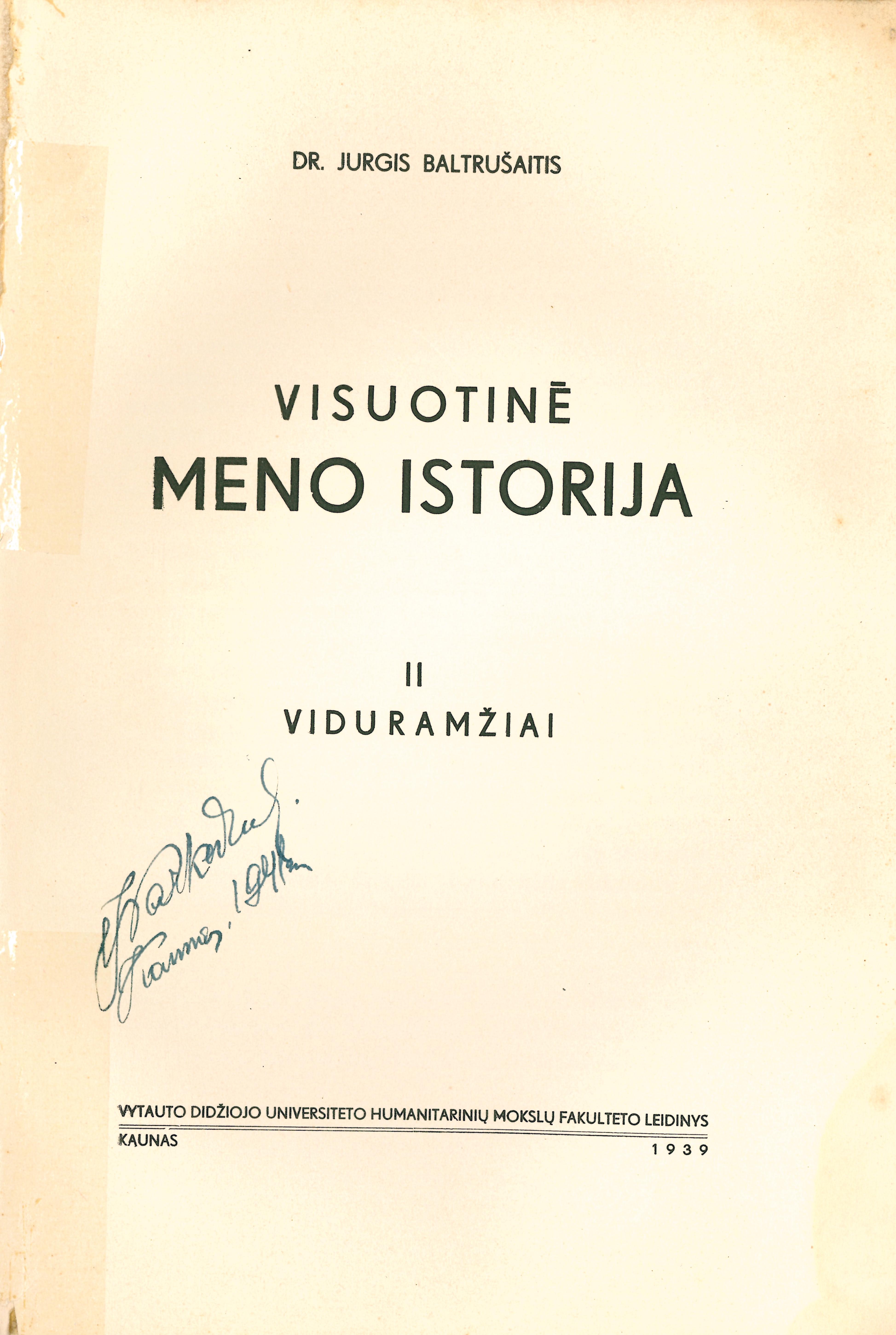 Antraštė Visuotinė meno istorija. T. 2: Viduramžiai / Jurgis Baltrušaitis. – Kaunas: [VDU Humanitarinių mokslų fakultetas], 1939. – 340, LXXX p. (Humanitarinių mokslų fakulteto raštai, kn. 14) [lt]