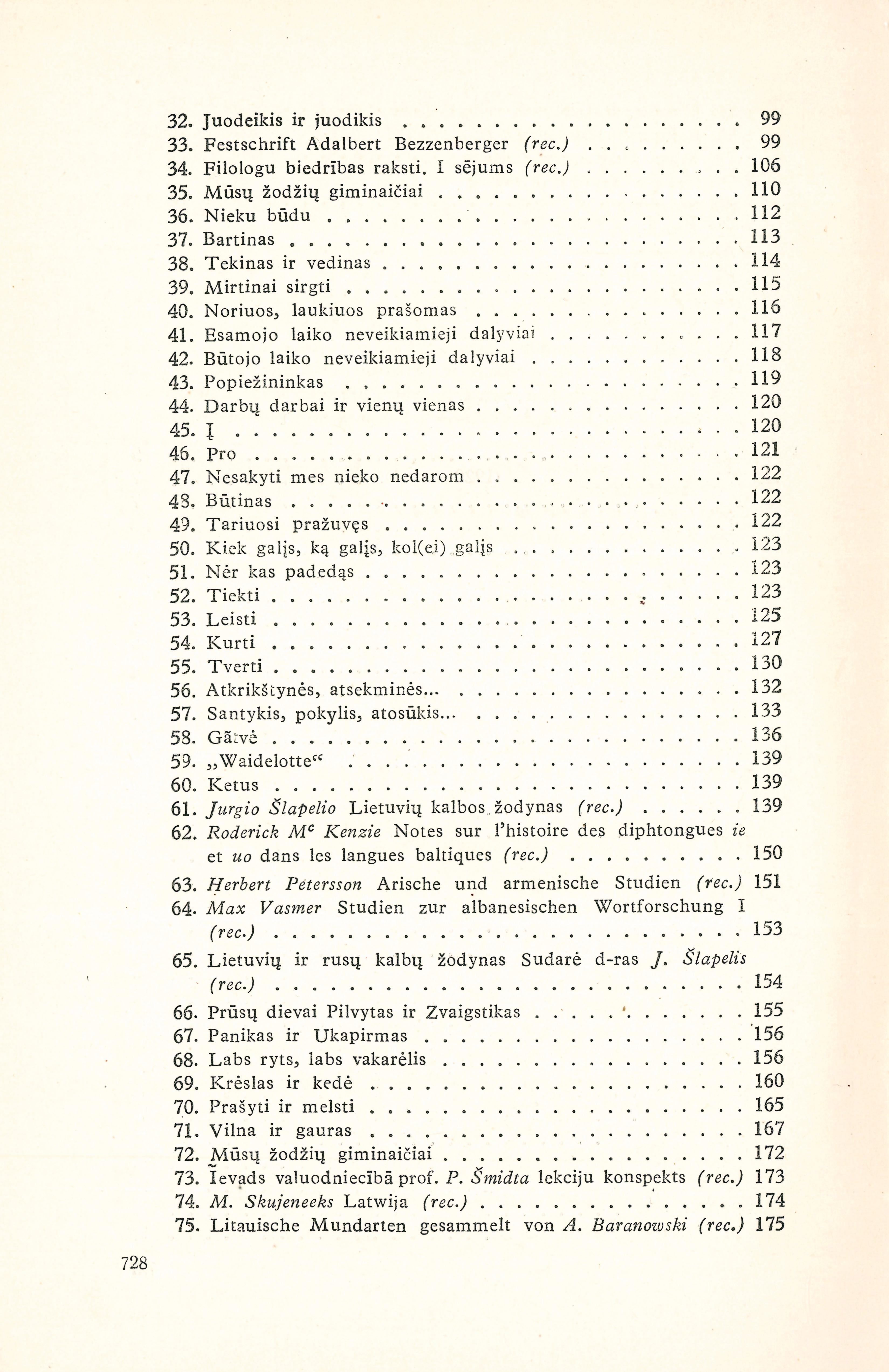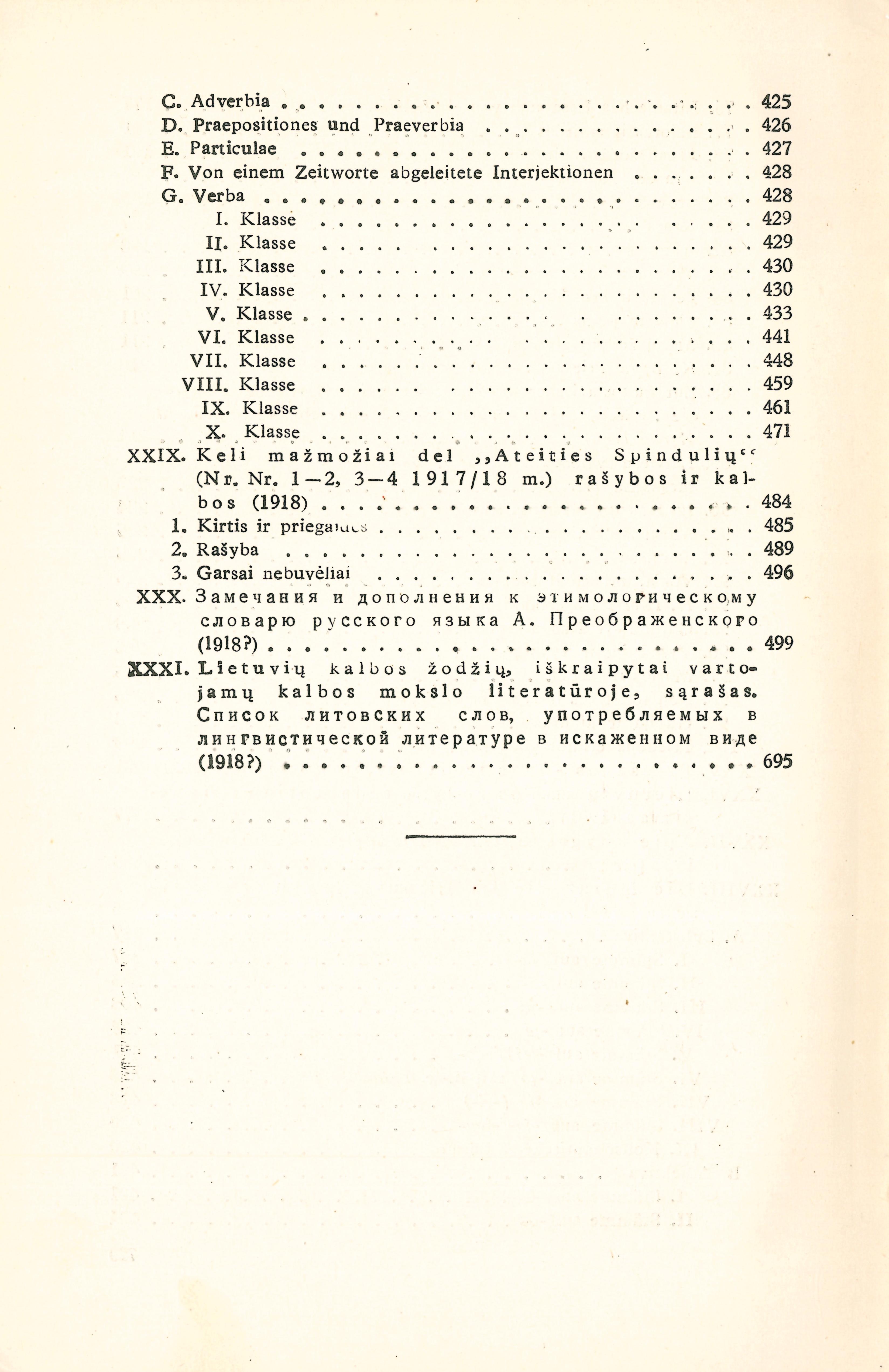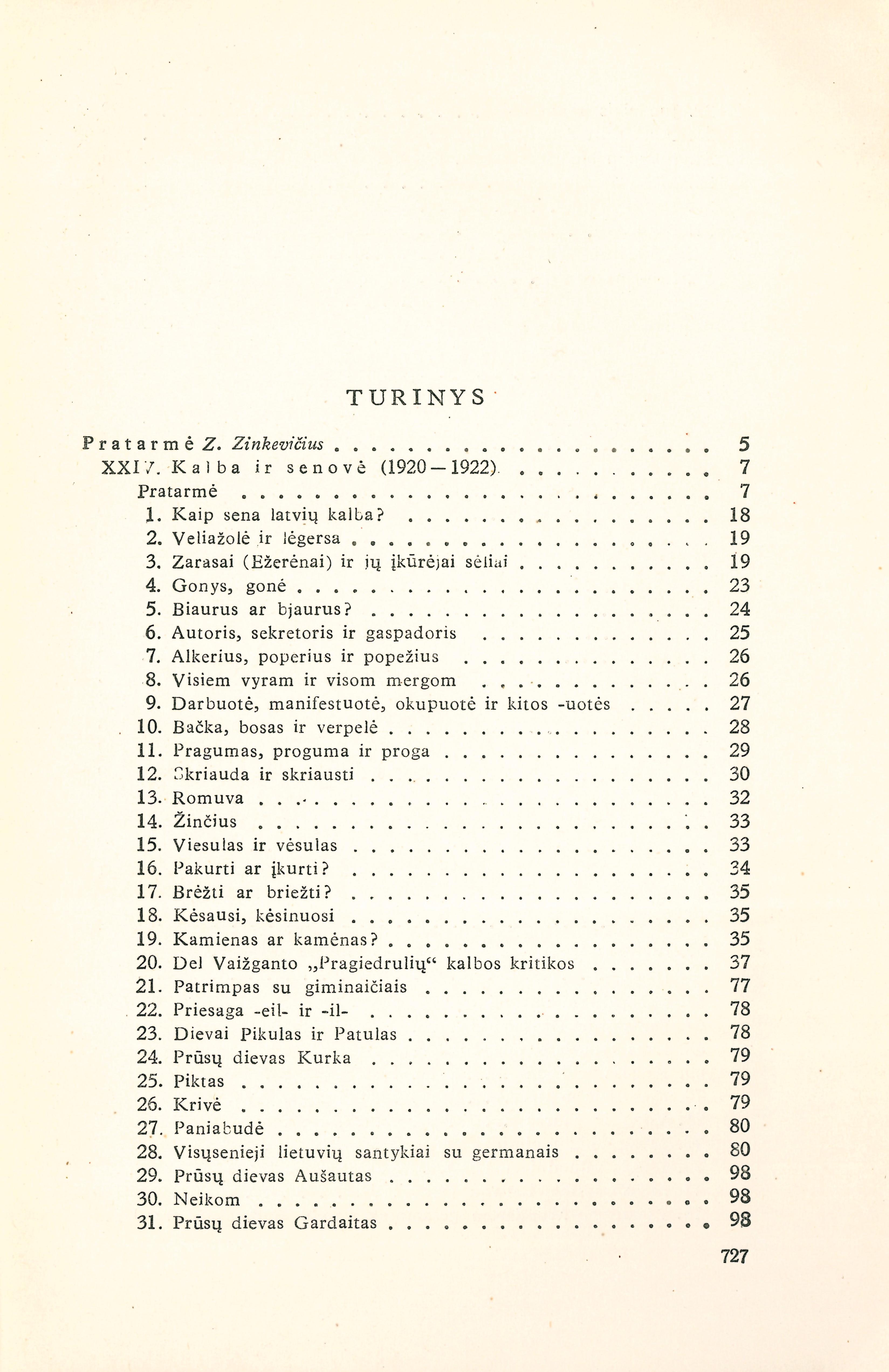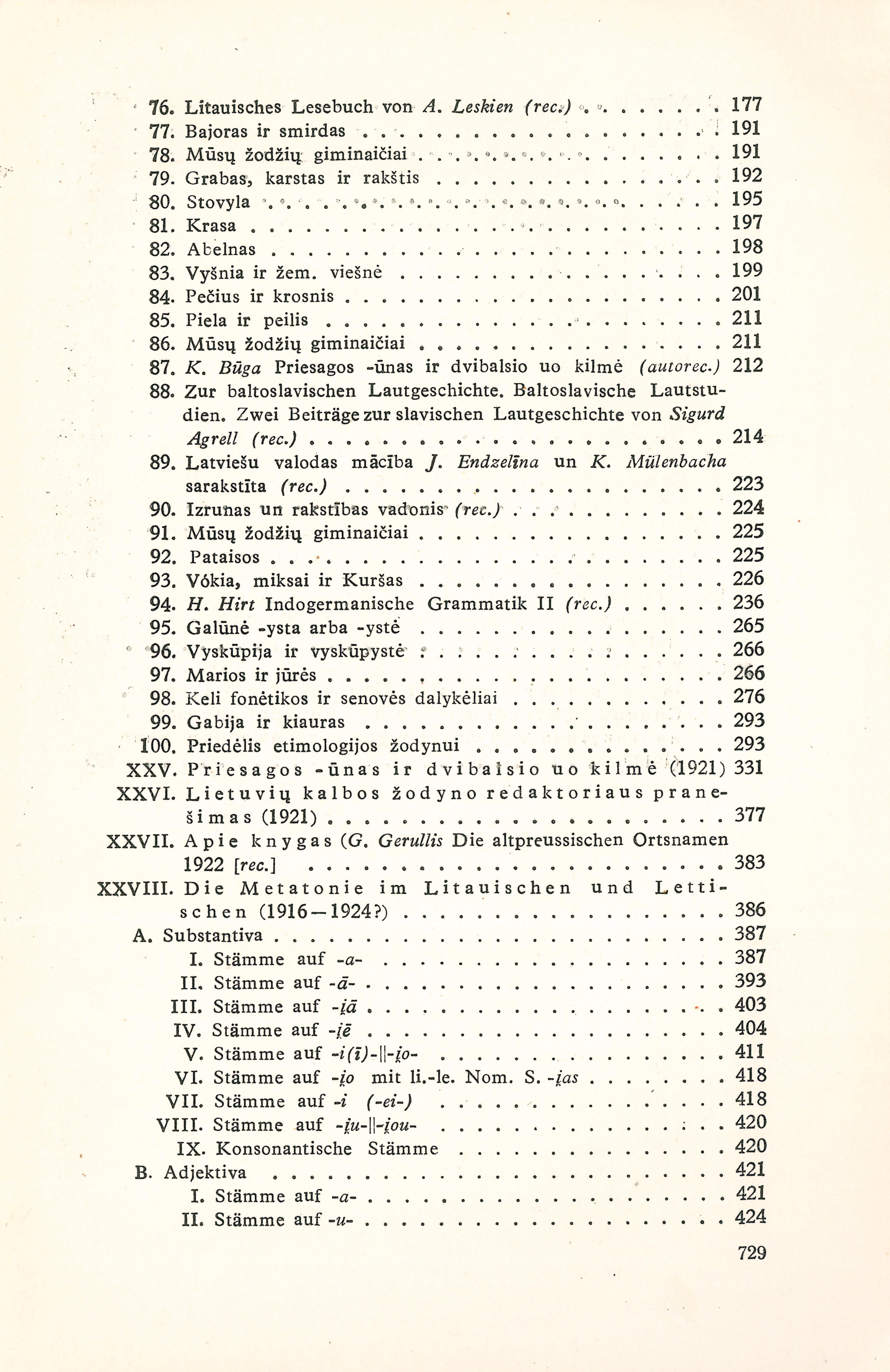 | Turinys: Kalba ir senovė (1920–1922); Priesagos –ūnas ir dvibalsio uo kilmė (1921); Lietuvių kalbos žodyno redaktoriaus pranešimas (1921); Apie knygas (G. Gerullis Die altpreussischen Ortsnamen 1922); Die Metatonie im Litauischen und Lettischen (1916–1924?); Keli mažmožiai del ,,Ateities Spindulių'“ rašybos ir kalbos (1918); 3амечани я и дополнения к этимологическому словарю русского языка А. Преображенского (1918?); Lietuvių kalbos žodžių, iškraipytai vartojamų kalbos mokslo literatūroje, sąrašas. Список литовских слов, употребляемых в лингвистической литературе в искаженном виде (1918) [lt] | |