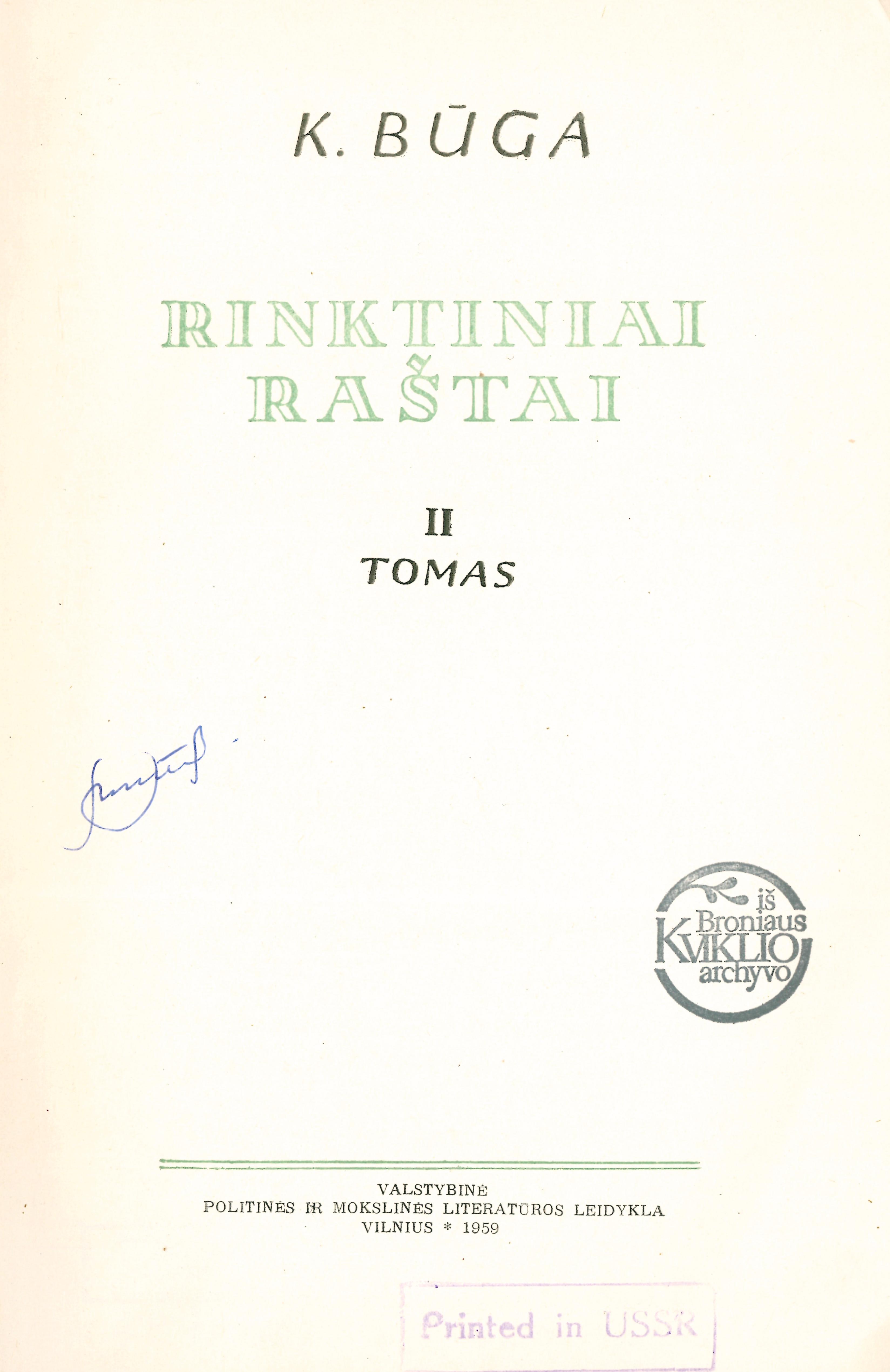 | Antraštė | Rinktiniai raštai / K. Būga; [sudarė Z. Zinkevičius]. T. 2. – Vilnius : Valstybinė politinės ir mokslinės literatūros leidykla, 1959. – 729 p. [lt] |