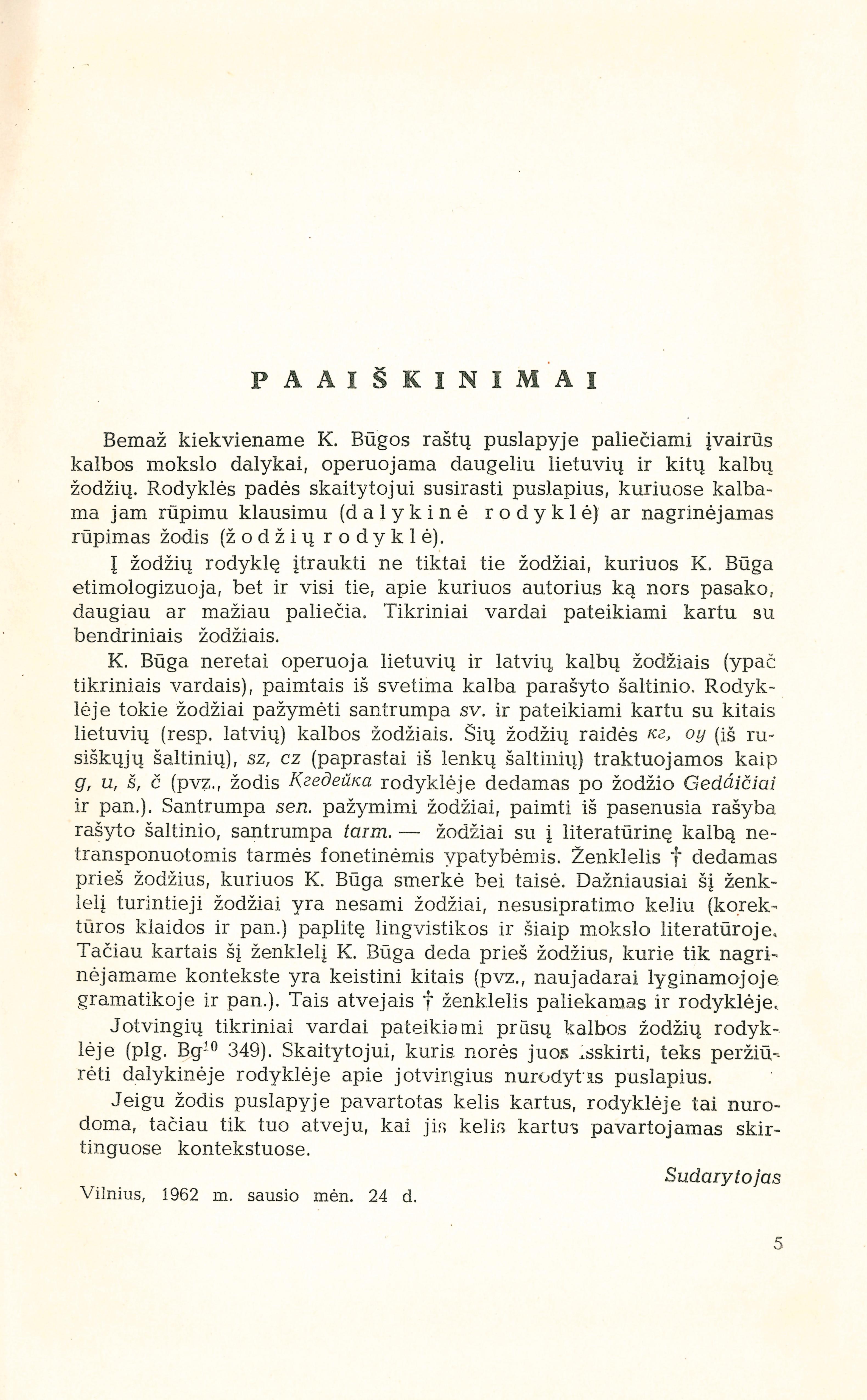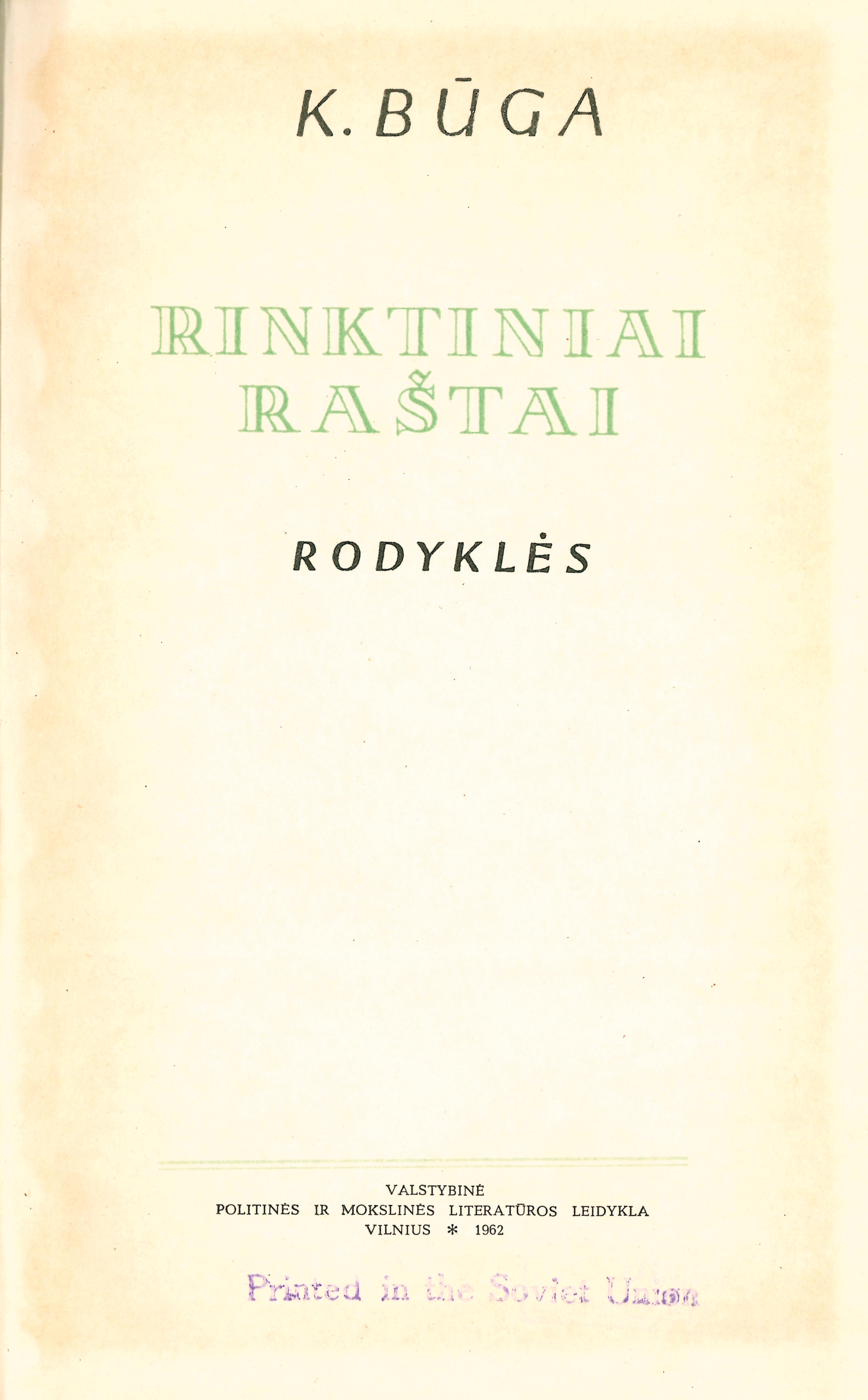 | Rinktiniai raštai. T. 4: Rodyklės / K. Būga; [sudarė Z. Zinkevičius]. T. 4. – Vilnius: Valstybinė politinės ir mokslinės literatūros leidykla, 1962. – 397 p. [lt] | |