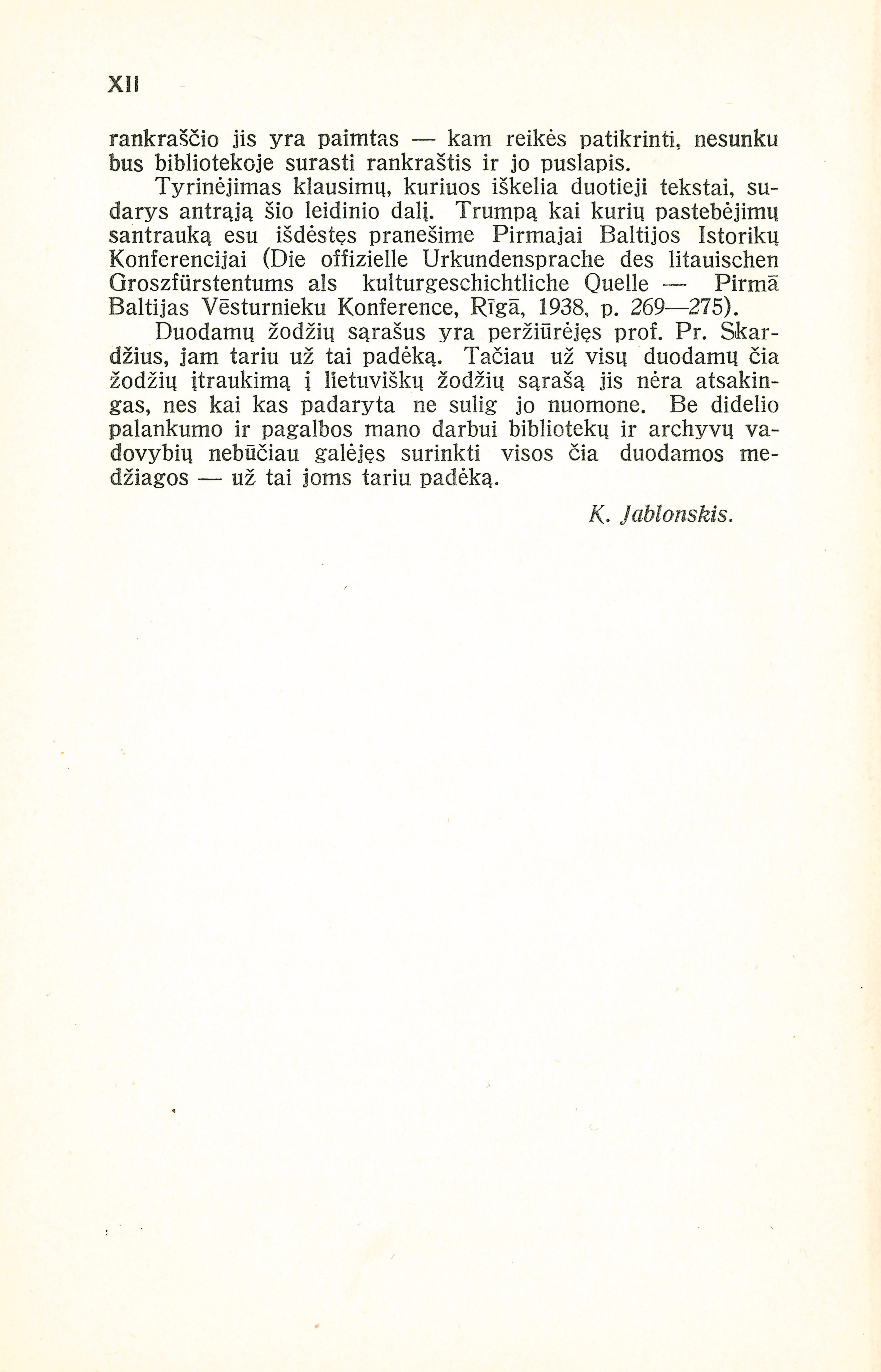 Antraštė Lietuviški žodžiai senosios Lietuvos raštinių kalboje. D. 1: Tekstai / [parengė] K. Jablonskis. – Kaunas: Lietuvos istorijos draugija, 1941. – XV, 376 p. [lt]