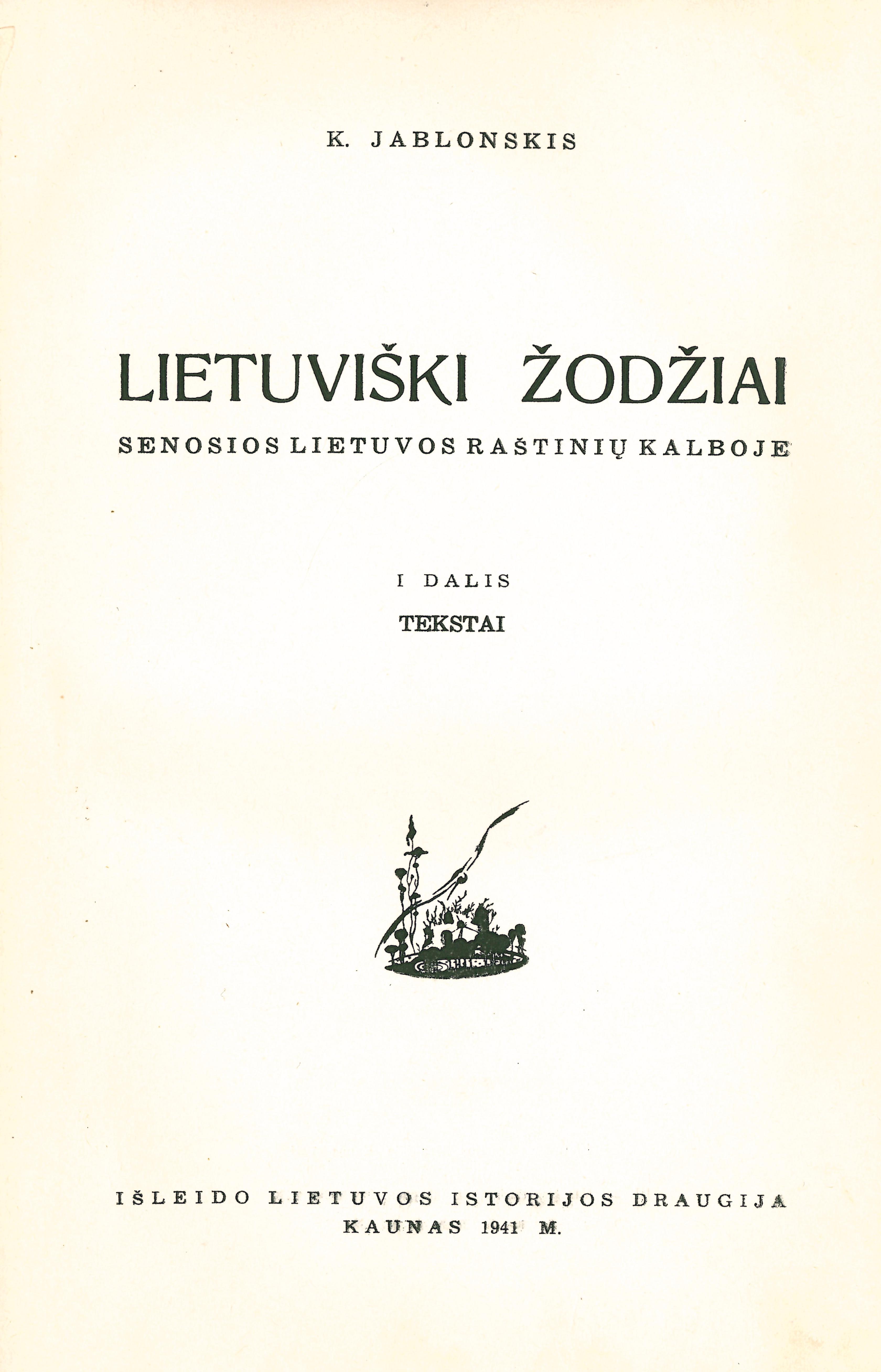 Lietuviški žodžiai senosios Lietuvos raštinių kalboje. D. 1: Tekstai / [parengė] K. Jablonskis. – Kaunas: Lietuvos istorijos draugija, 1941. – XV, 376 p. [lt]