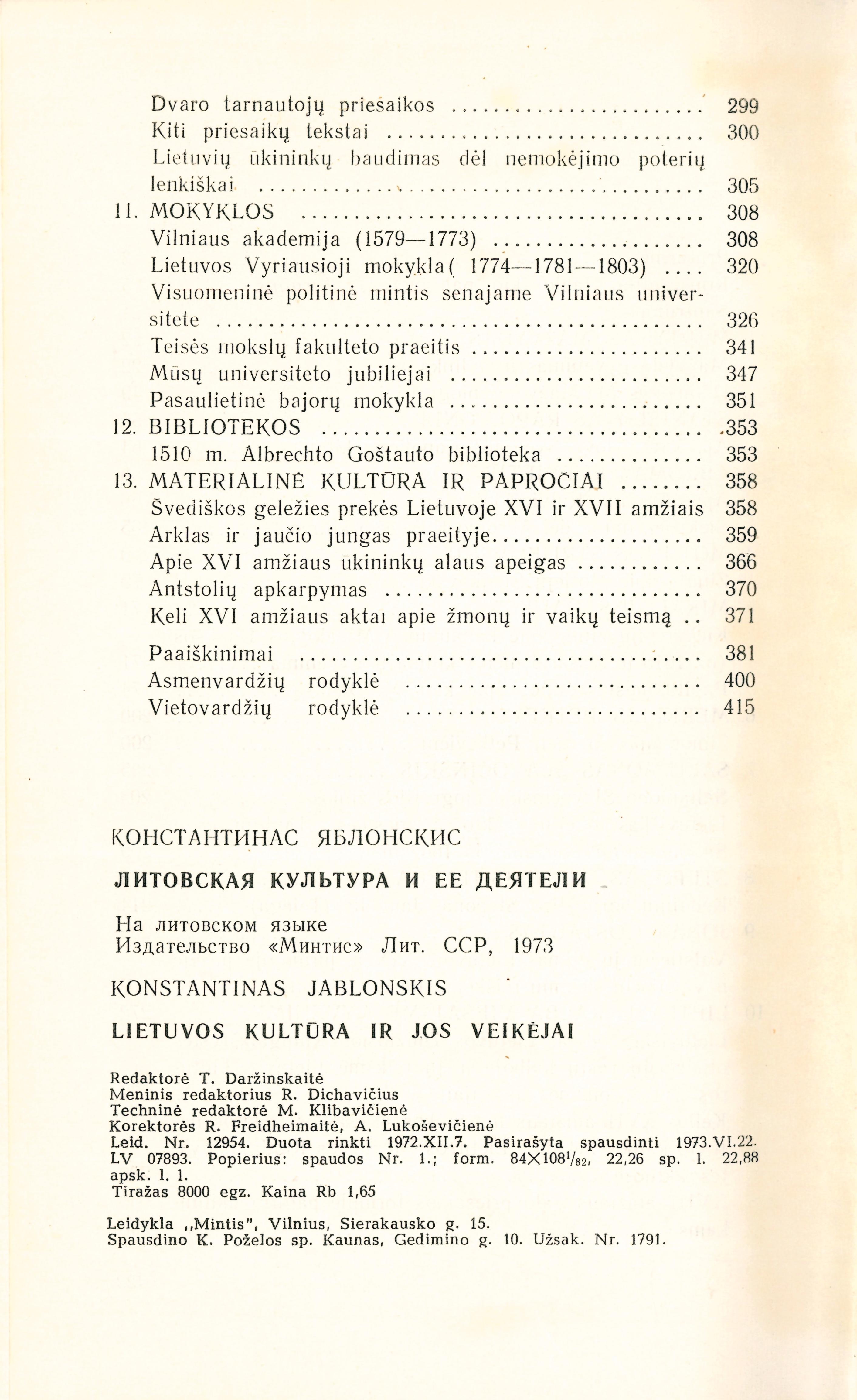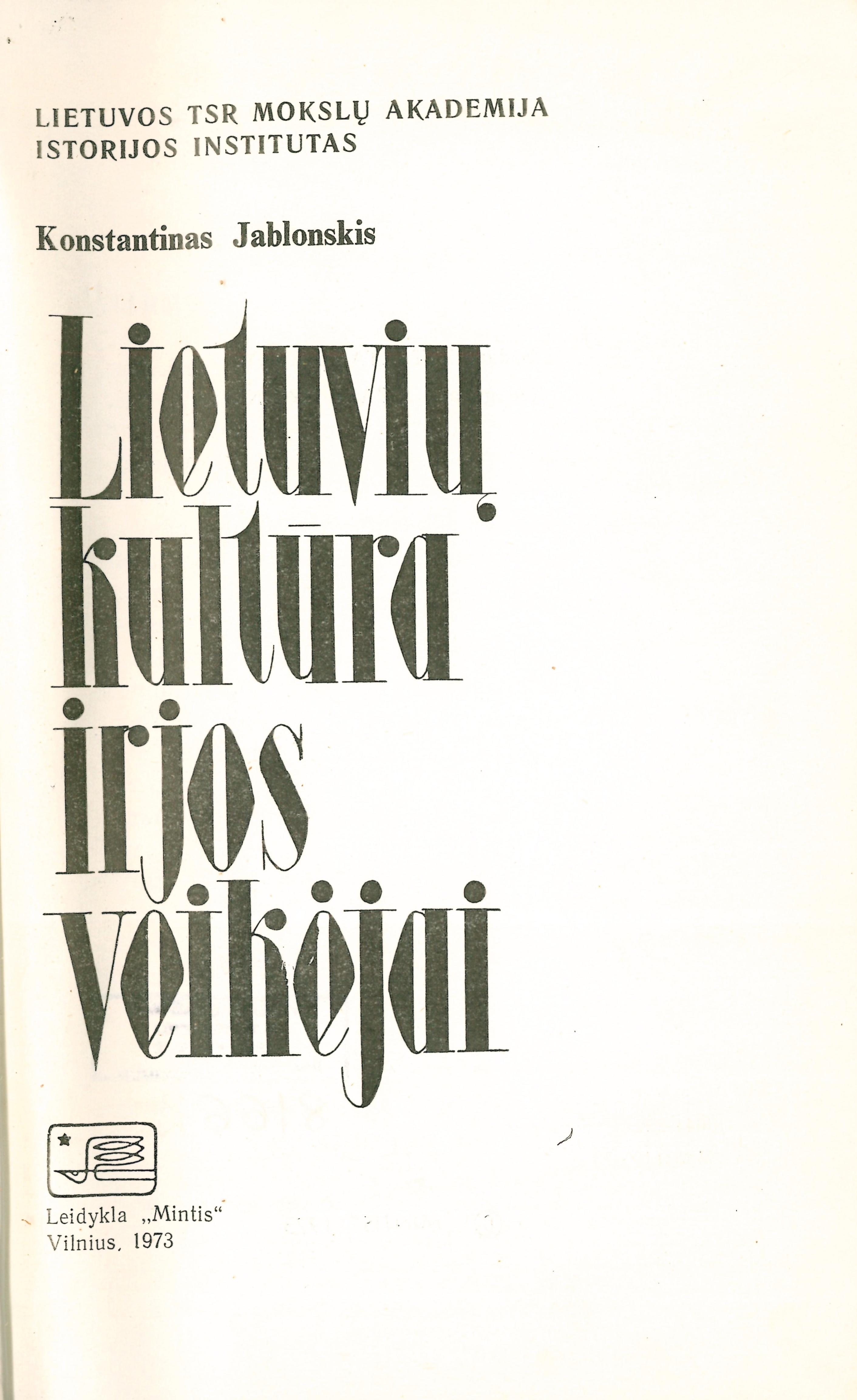 | Antraštė | Lietuvių kultūra ir jos veikėjai / Konstantinas Jablonskis; sudarė Vytautas Merkys; redagavo Juozas Jurginis. – Vilnius: Mintis, 1973. – 423, [2] p. [lt] |