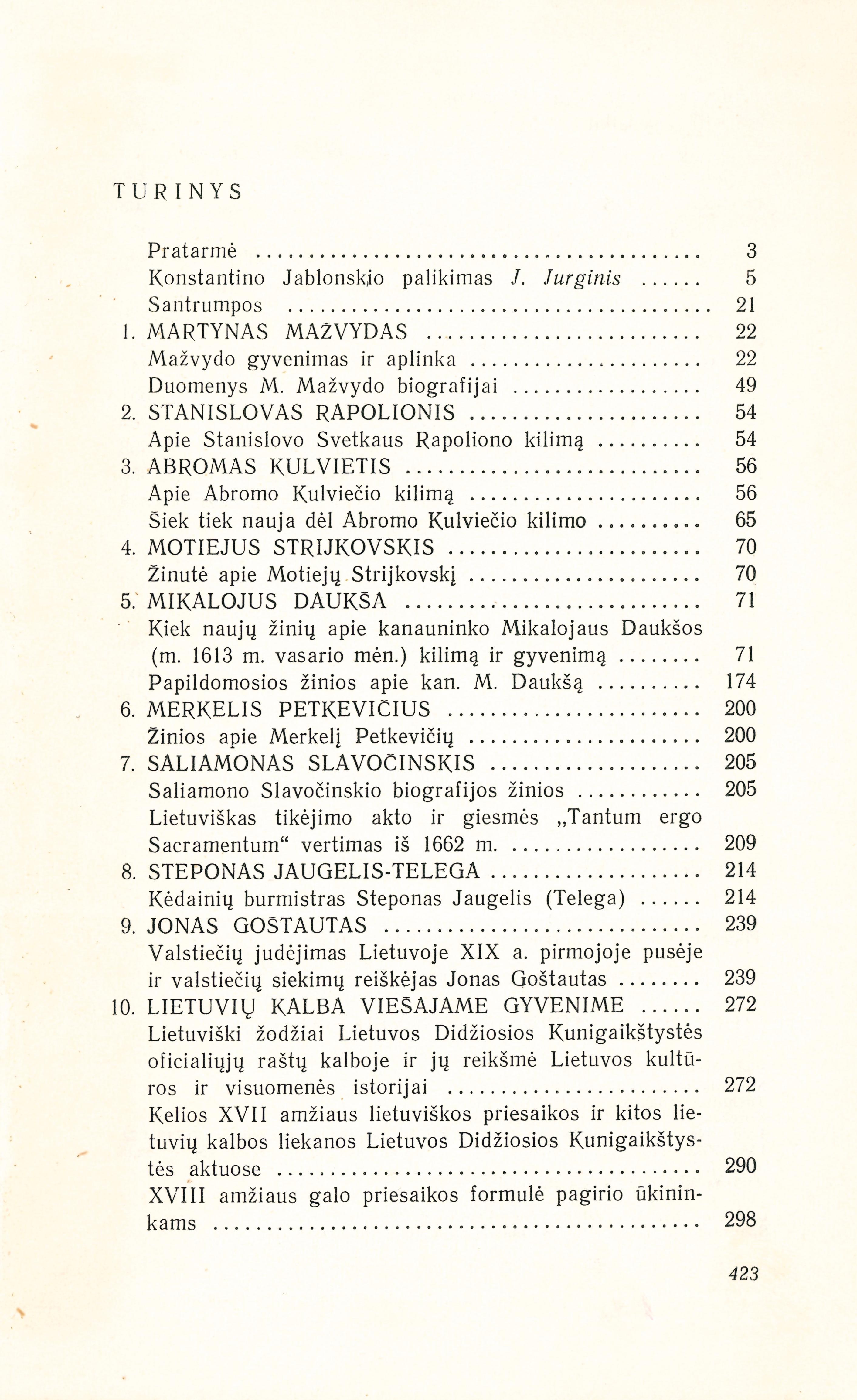 | Turinys: Mažvydo gyvenimas ir aplinka (1947); Duomenys M. Mažvydo biografijai (1956); Apie Stanislovo Svetkaus Rapolionio kilimą (1941); Apie Abromo Kulviečio kilimą (1935); Šiek tiek nauja dėl Abromo Kulviečio kilimo (1946); Motiejus Strijkovskis (1933); Kiek naujų žinių apie kanauninko Mikalojaus Daukšos (m. 1613 m. vasario mėn.) kilimą ir gyvenimą (1931); Papildomosios žinios apie kan. M. Daukšą (1933); Žinios apie Merkelį Petkevičių (1939); Saliamono Slavočinskio biografijos žinios (1958); Lietuviškas tikėjimo akto ir giesmės „Tantum ergo sacramentum“ vertimas iš 1662 m. (1958); Kėdainių burmistras Steponas Jaugelis (Telega) (1933); Valstiečių judėjimas Lietuvoje XIX a. pirmojoje pusėje ir valstiečių siekimų reiškėjas Jonas Goštautas (1957); Lietuviški žodžiai Lietuvos Didžiosios Kunigaikštystės oficialiųjų raštų kalboje ir jų reikšmė Lietuvos kultūros ir visuomenės istorijai (1936); Kelios XVII amžiaus lietuviškos priesaikos ir kitos lietuvių kalbos liekanos Lietuvos Didžiosios Kunigaikštystės aktuose (1937); XVIII amžiaus galo priesaikos formulė pagirio ūkininkams (1933); Dvaro tarnautojų priesaikos (1965); Kiti priesaikų tekstai (1943); Lietuvių ūkininkų baudimas dėl nemokėjimo poterių lenkiškai (1944); Vilniaus akademija (1579–1773) (1956); Lietuvos Vyriausioji mokykla (1774–1781–1803) (1956); Visuomeninė–politinė mintis senajame Vilniaus universitete (1959); Teisės mokslų fakulteto praeitis (1959); Musų universiteto jubiliejai (1959); Pasaulietinė bajorų mokykla (1941); 1510 m. Albrechto Goštauto biblioteka (1961); Švediškos geležies prekės Lietuvoje XVI ir XVII amž. (1937); Arklas ir jaučio jungas praeity (1937); Apie XVI amžiaus ūkininkų alaus apeigas (1933); Antstolių apkarpymas (1933); Keli XVI amžiaus aktai apie žmonų ir vaikų teismą (1933). [lt] | |