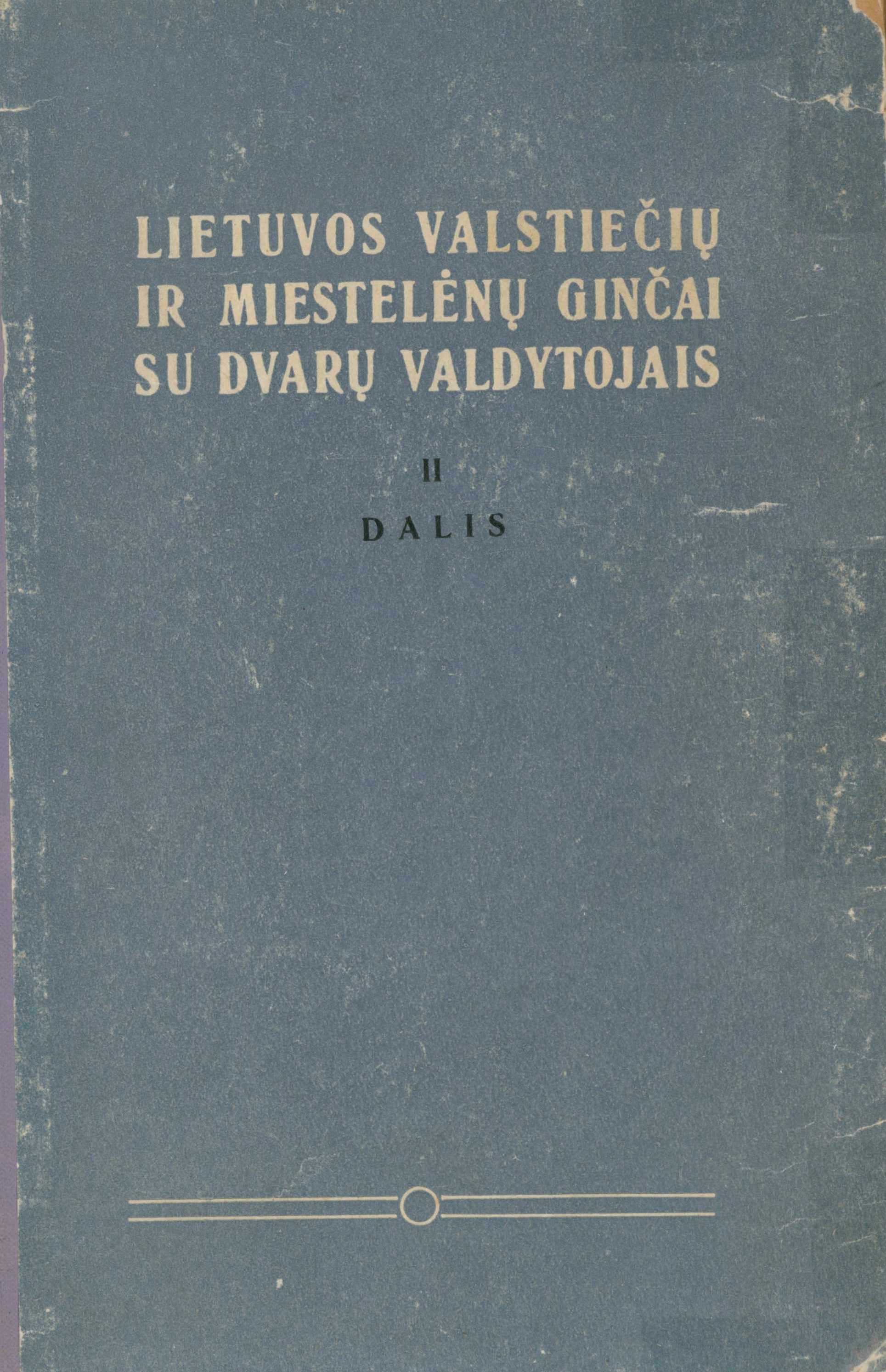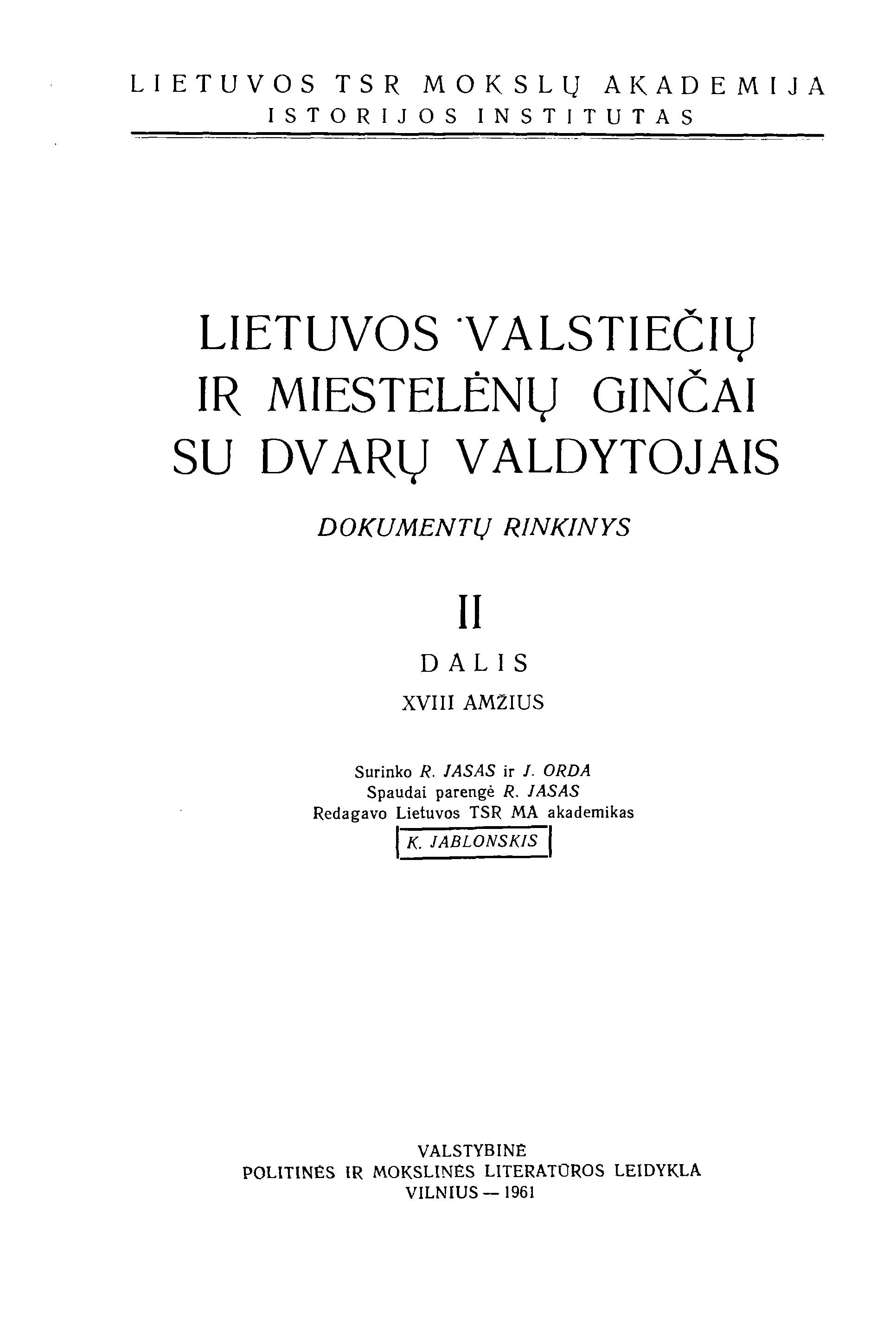 | Antraštė | Lietuvos valstiečių ir miestelėnų ginčai su dvarų valdytojais: dokumentų rinkinys = Тяжбы литовских крестьян и жителей местечек с управителями имений: сборник документов. D. 2: XVIII amžius / surinko Rimantas Jasas ir Jerzy Orda; spaudai parengė Rimantas Jasas; redagavo Konstantinas Jablonskis. – Vilnius: Valstybinė politinės ir mokslinės literatūros leidykla, 1961. – 590, [2] p. [lt] |