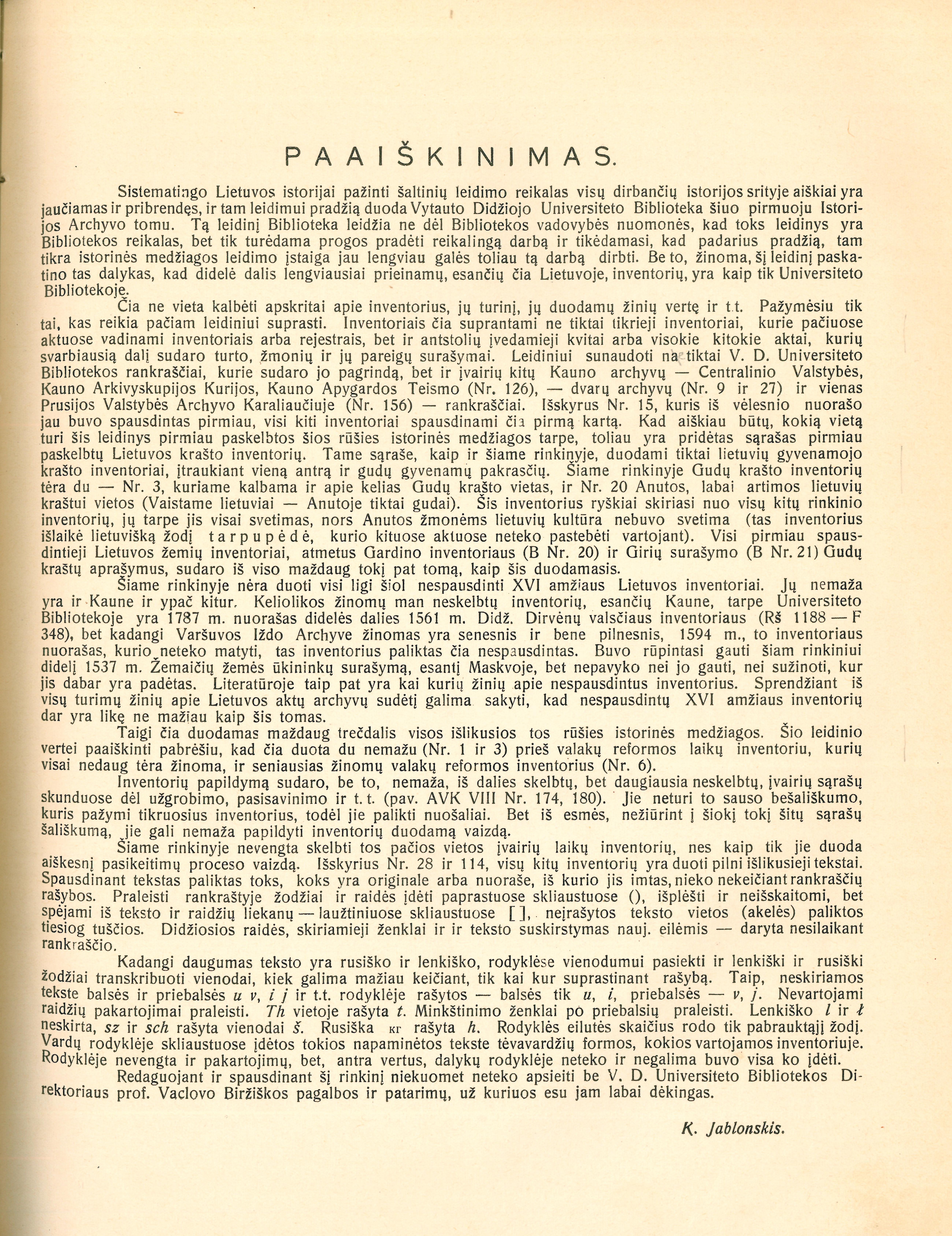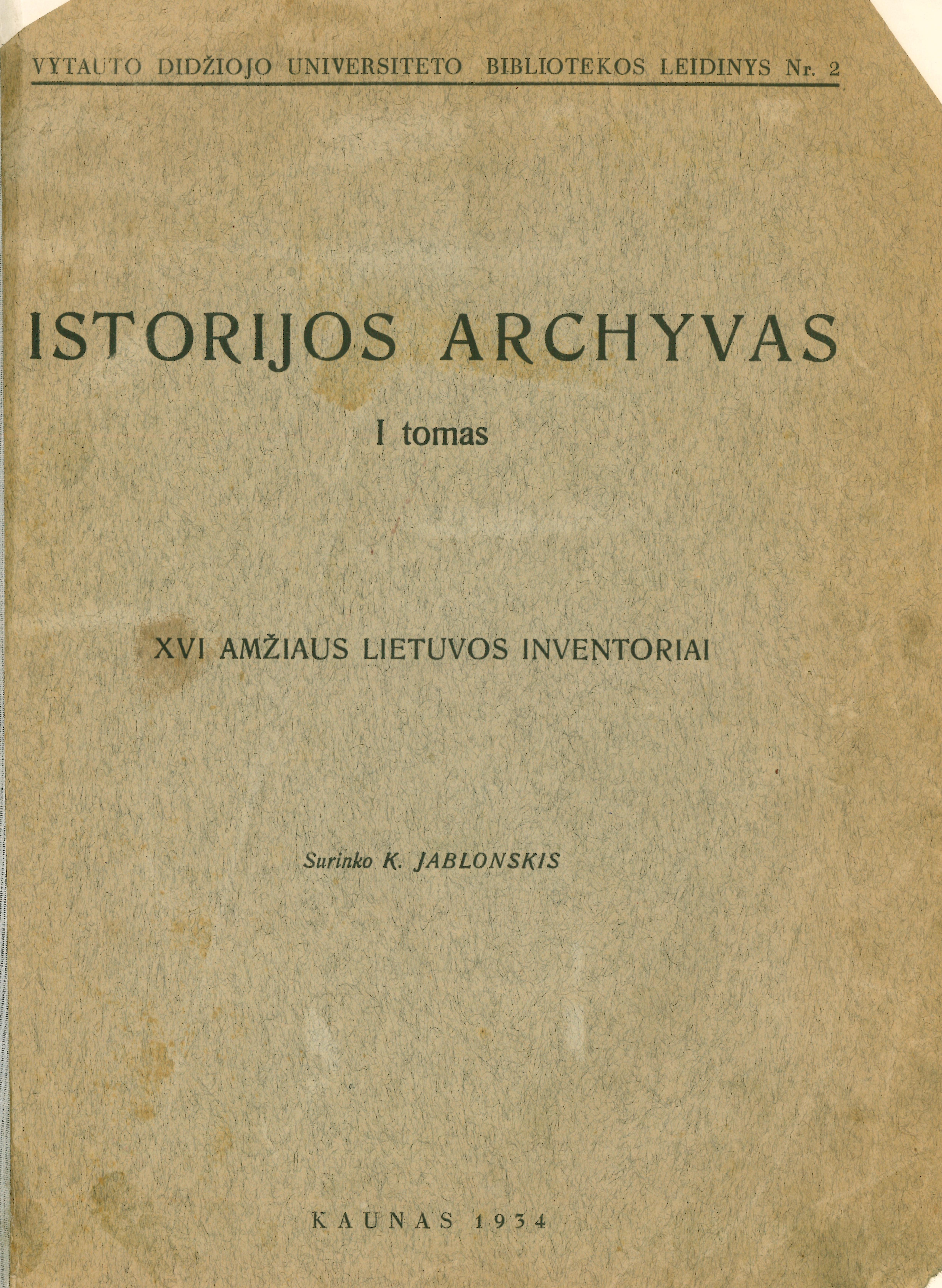 | Antraštė | Istorijos archyvas. T. 1: XVI amžiaus Lietuvos inventoriai / parengė Konstantinas Jablonskis. – Kaunas: Vytauto Didžiojo universiteto biblioteka, 1934. – XII p., 680 sklt., 131 p. [lt] |
