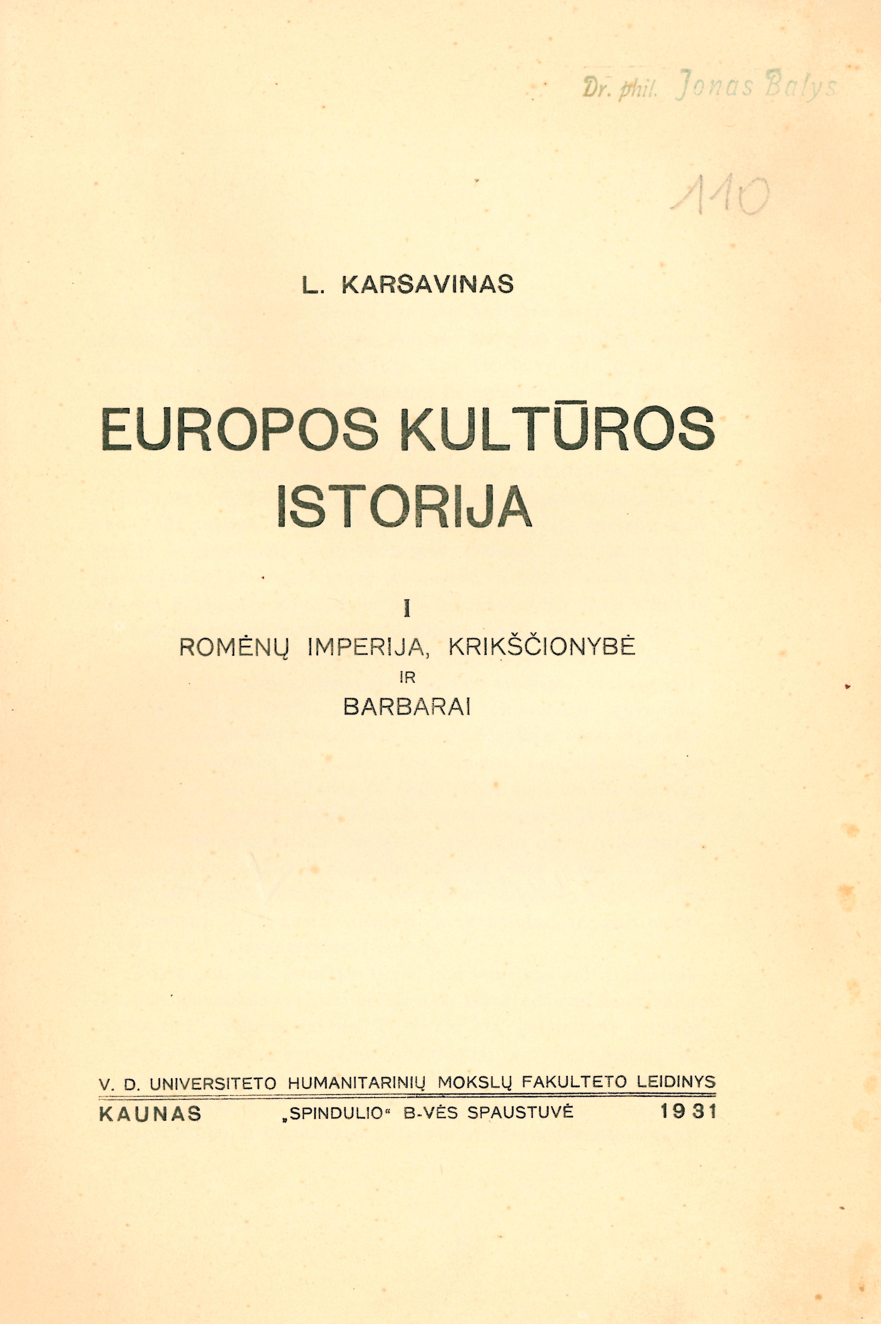 Antraštė Europos kultūros istorija. T. 1 (1931)