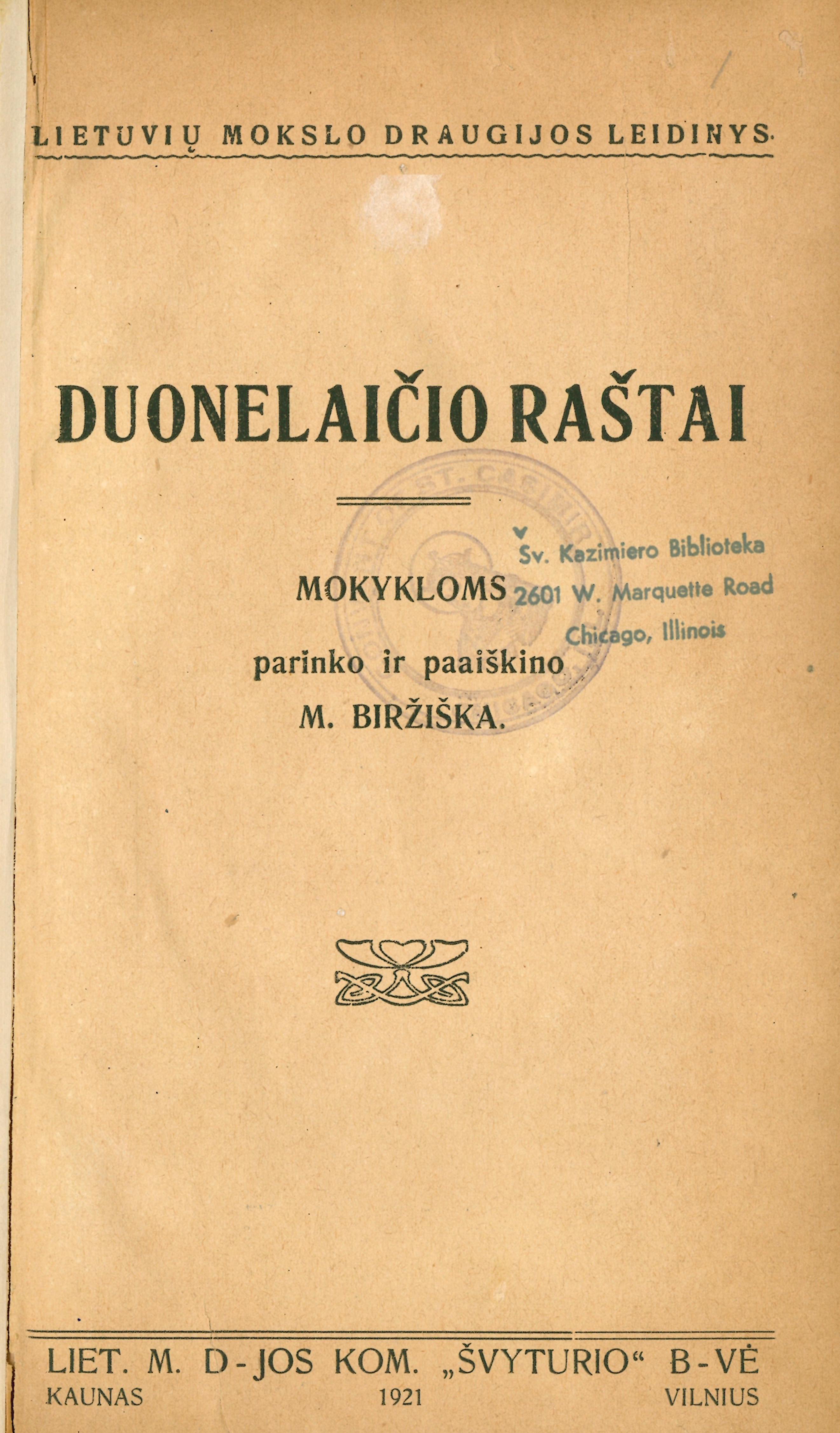 Duonelaičio raštai / mokykloms parinko ir paaiškino M. Biržiška. – Kaunas ; Vilnius : Švyturys, 1921. – (Lietuvių mokslo draugijos leidinys)