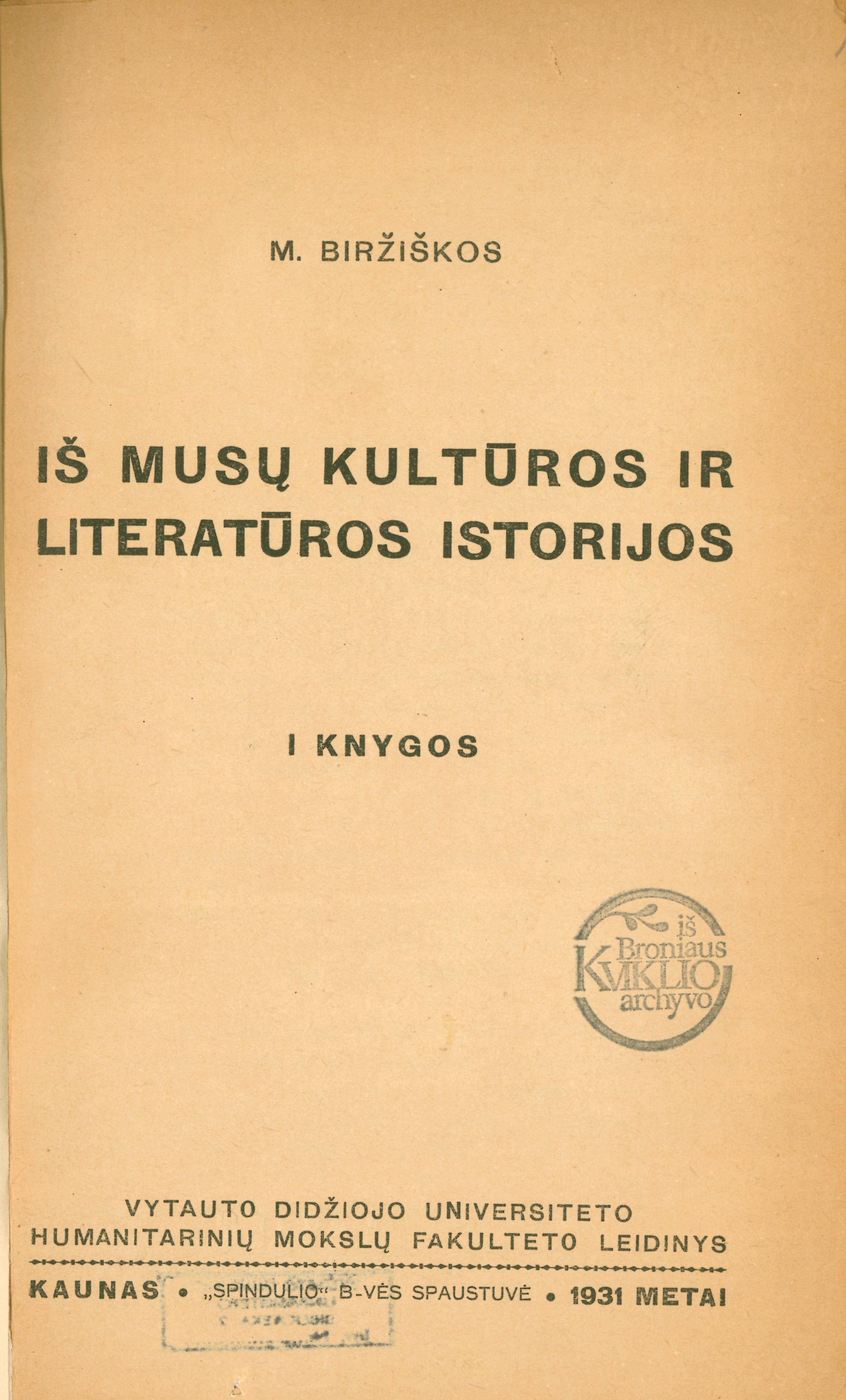 Antraštė Iš musų kultūros ir literatūros istorijos. Kn. 1 / M. Biržiškos. – Kaunas: Vytauto Didžiojo universiteto Humanitarinių mokslų fakulteto leidinys, 1931. – 418, 85 p. [lt]