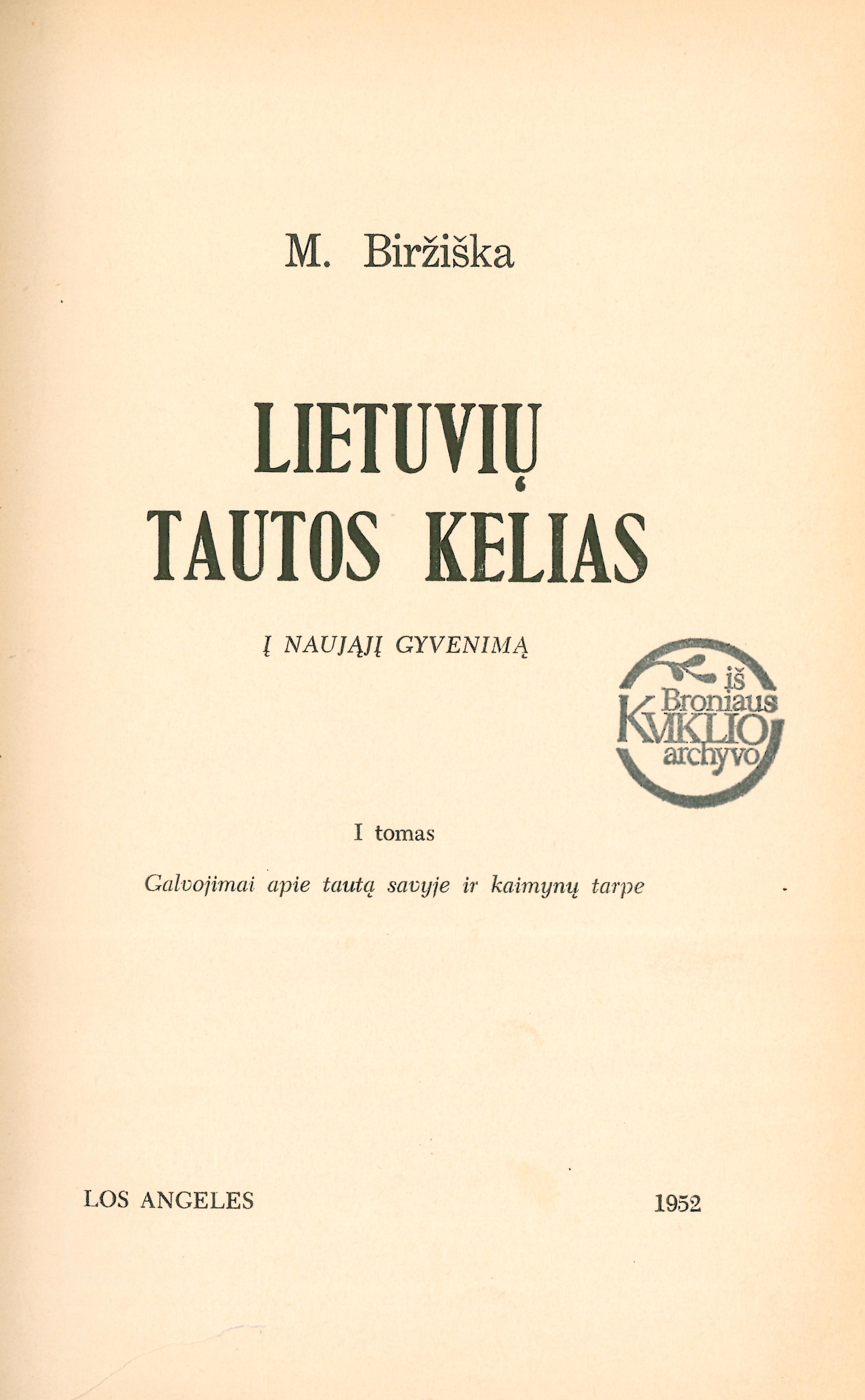 | Antraštė | Lietuvių tautos kelias į naująjį gyvenimą. T. 1 : Galvojimai apie tautą savyje ir kaimynų tarpe/ M. Biržiška. – Los Angeles: Lietuvių dienos, 1952. – XII, 240 p. [lt] |