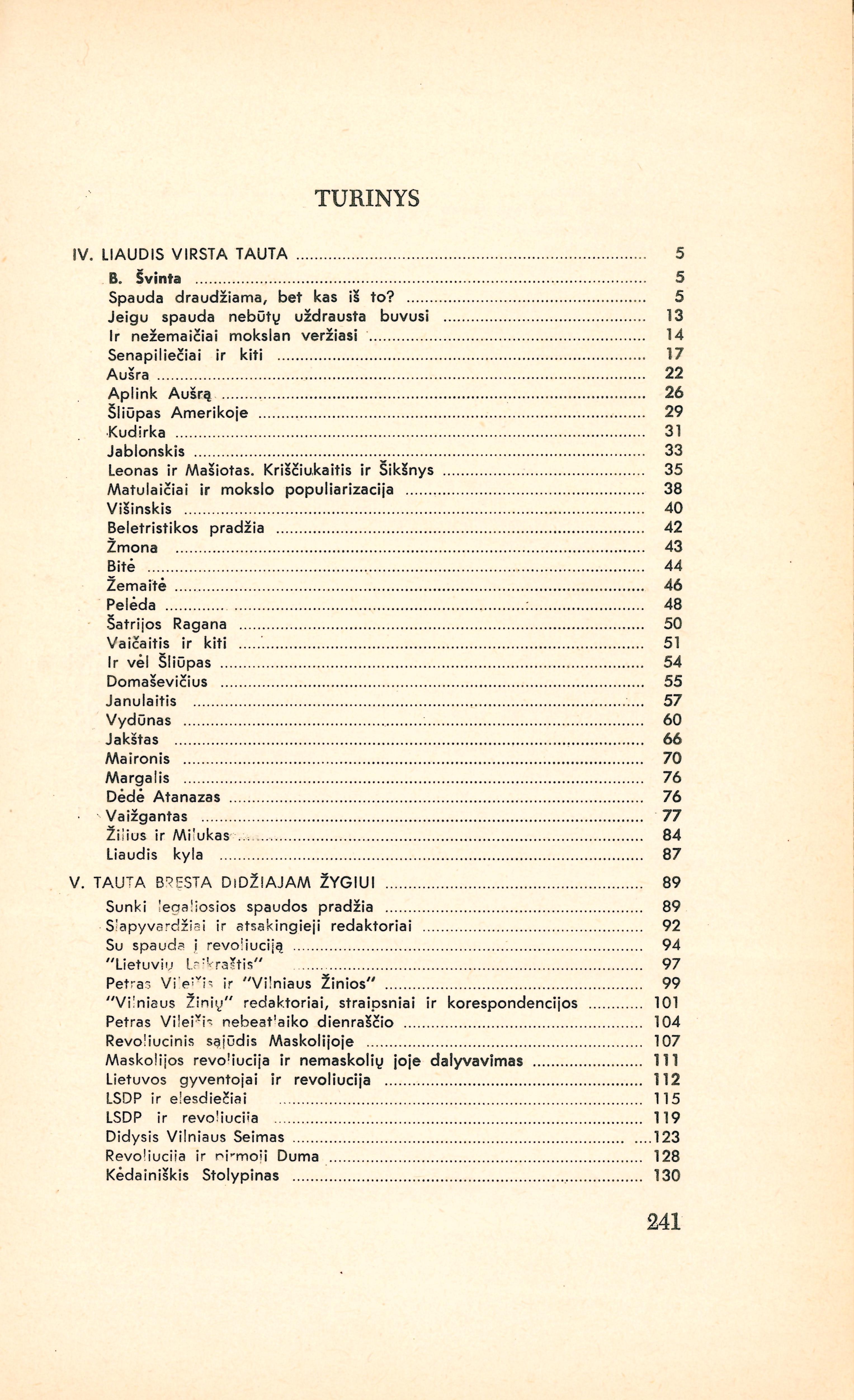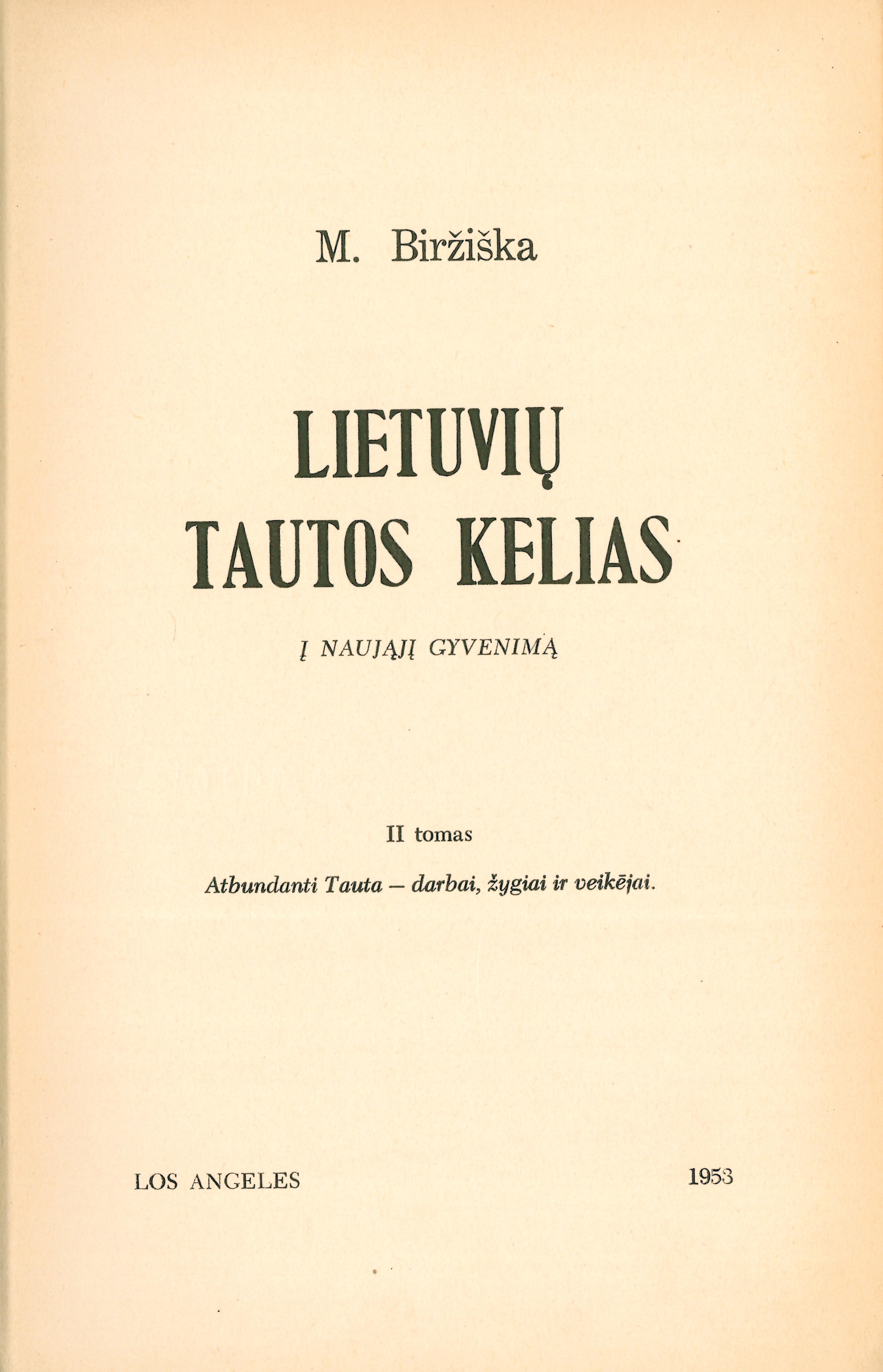 | Lietuvių tautos kelias į naująjį gyvenimą. T. 2: Atbundanti Tauta – darbai, žygiai ir veikėjai / M. Biržiška. – Los Angeles: Lietuvių dienos, 1953. – 245 p. [lt] | |
