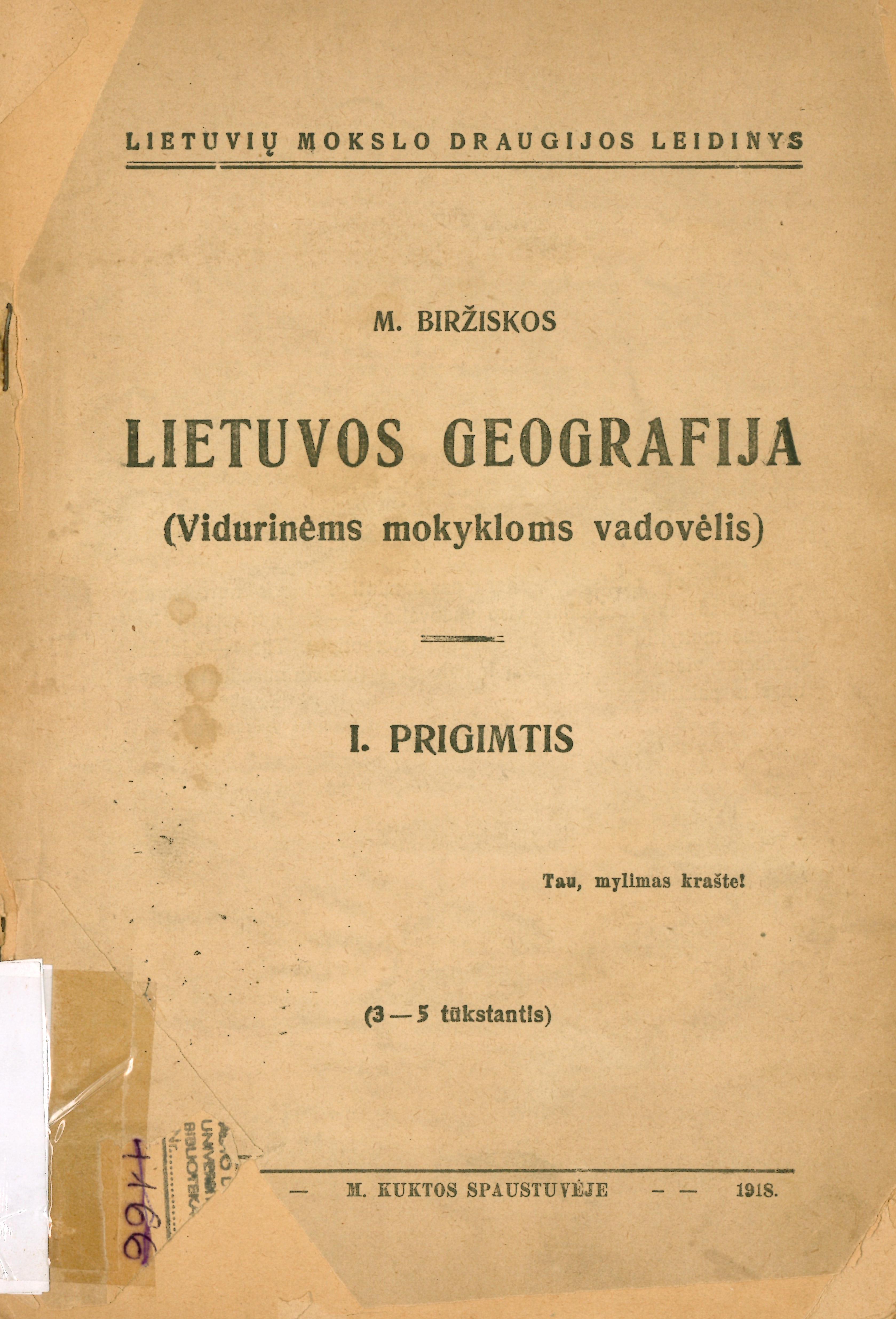 | Antraštė | Lietuvos geografija: (vidurinėms mokykloms vadovėlis). D. 1: Prigimtis / M. Biržiškos. – [2–as leidimas]. – Vilnius: Lietuvių mokslo draugijos leidinys, 1918. – 145 p. [lt] |