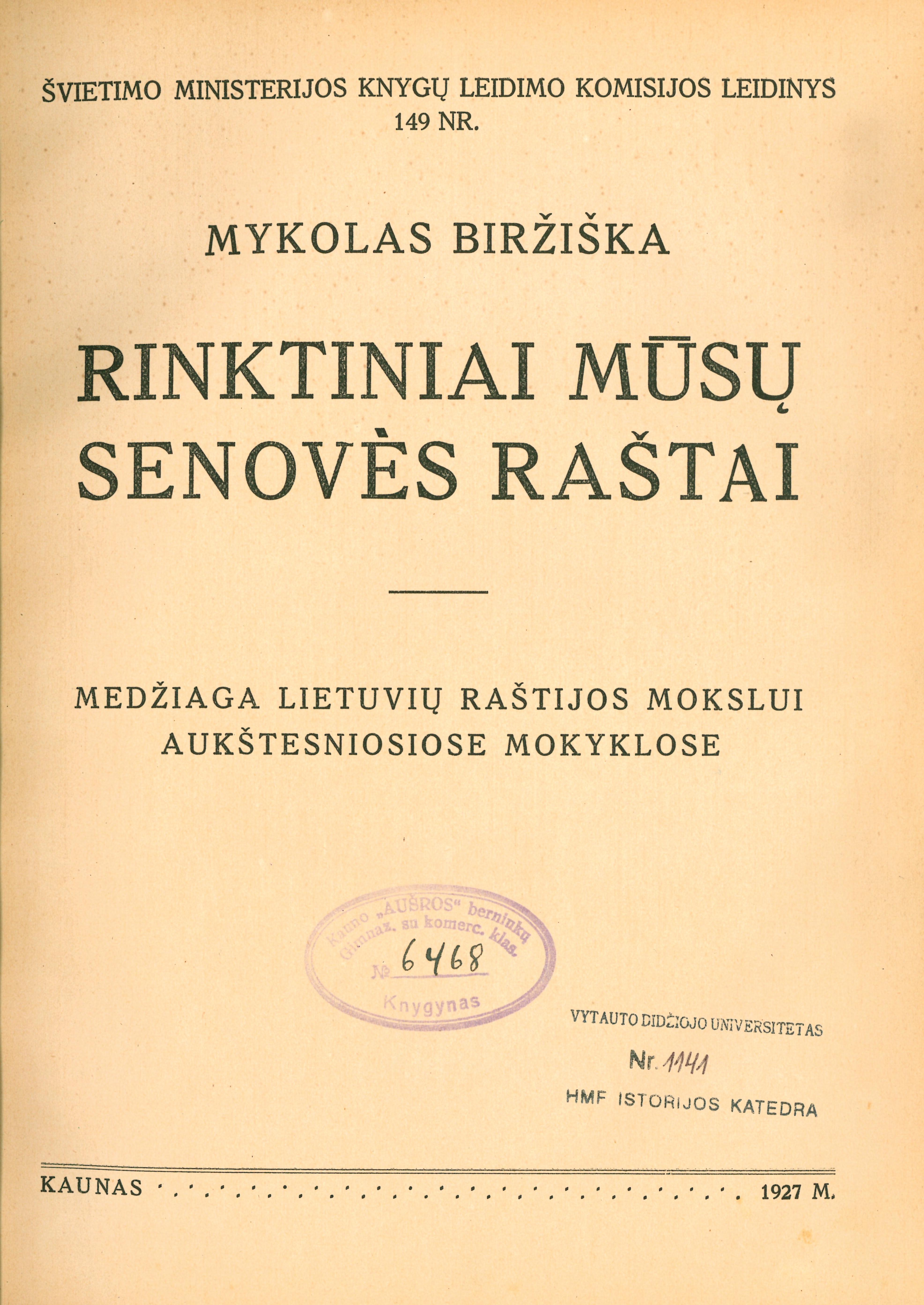 | Antraštė | Rinktiniai mūsų senovės raštai : medžiaga lietuvių raštijos mokslui aukštesniosiose mokyklose / [parengė] Mykolas Biržiška. – Kaunas : Švietimo ministerijos Knygų leidimo komisija, 1927. – 254 p., 11 faks. lap. – (Švietimo ministerijos Knygų leidimo komisijos leidinys Nr. 149) [lt] |
