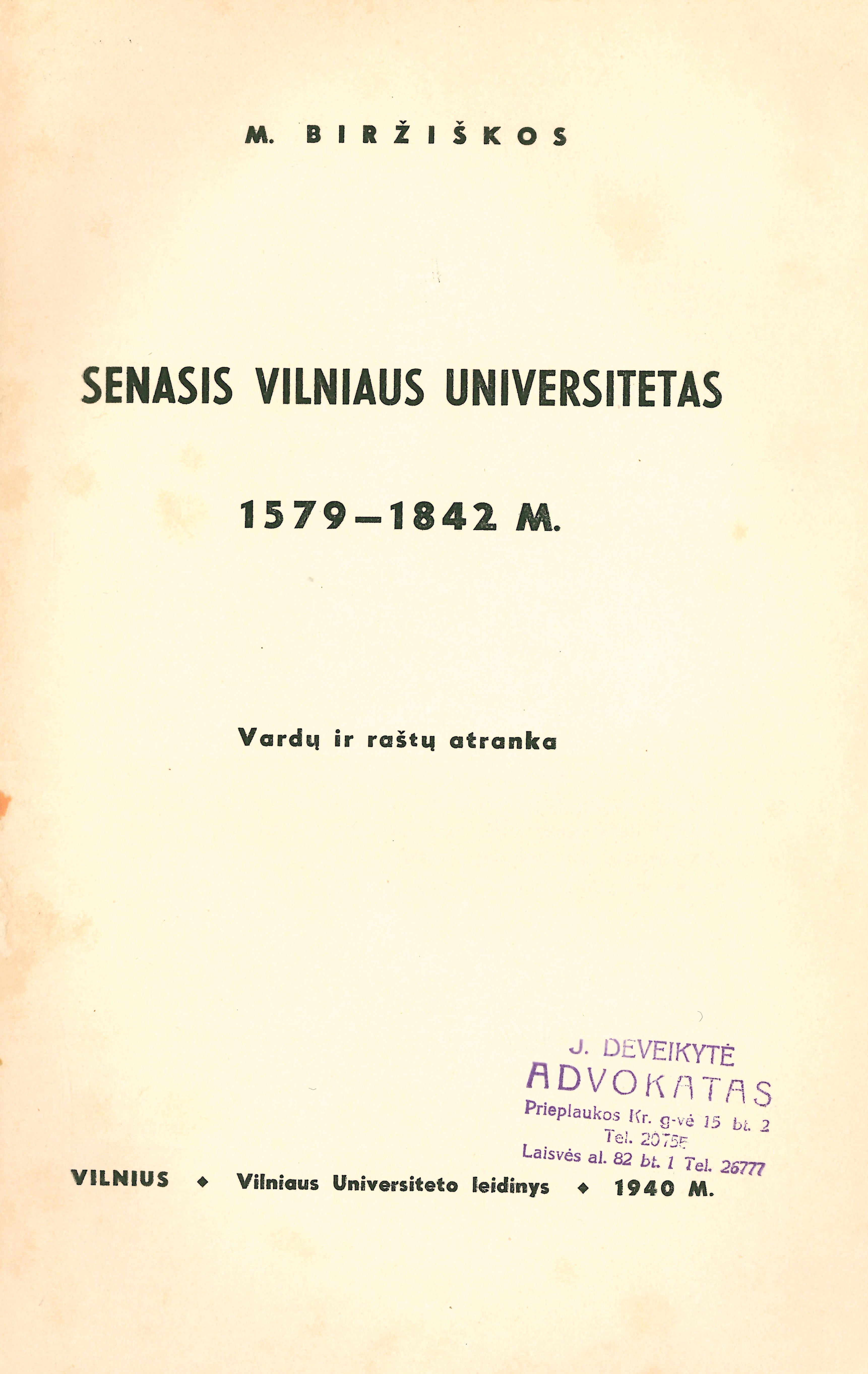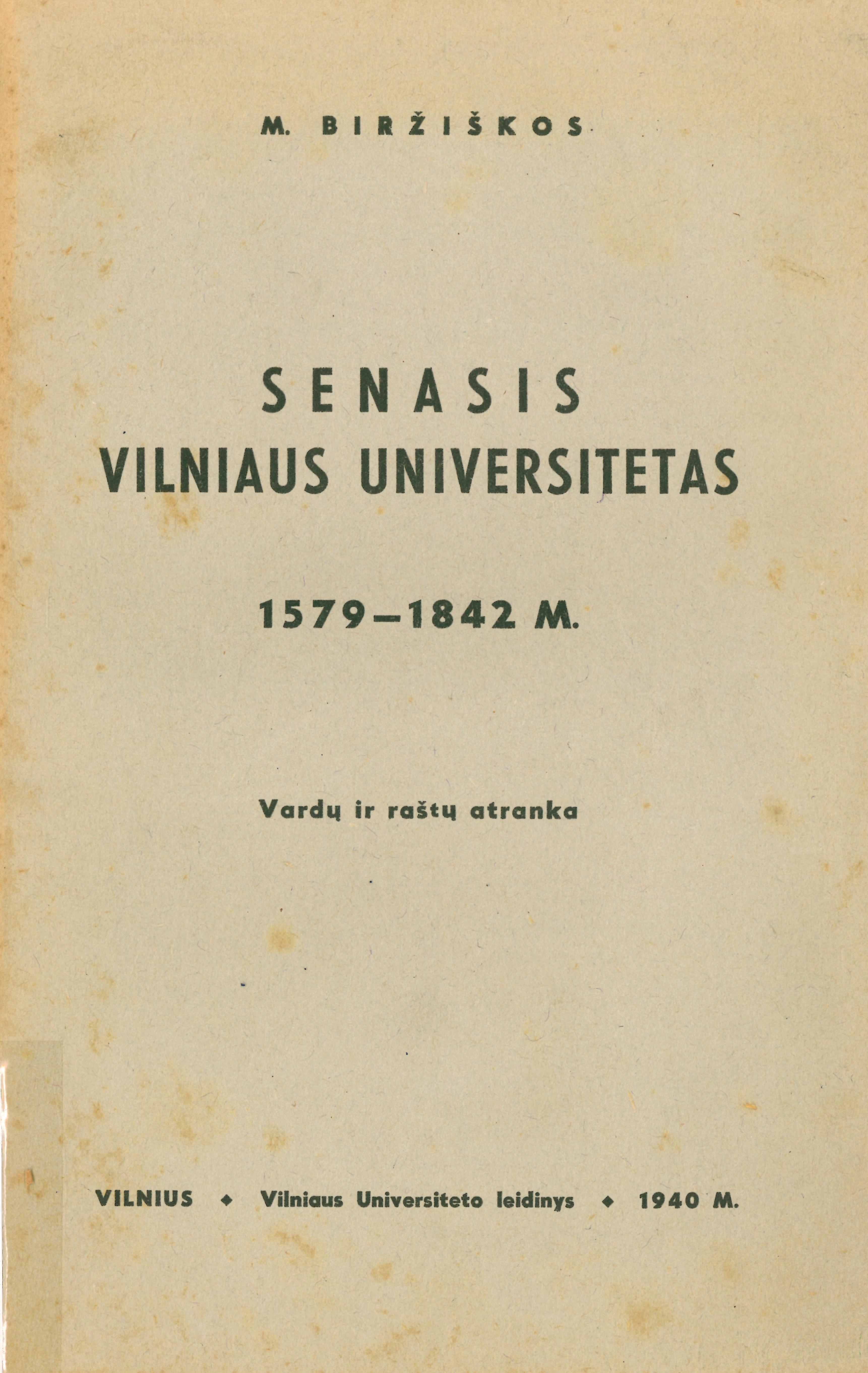 | Antraštė | Senasis Vilniaus universitetas 1579-1842 m. : vardų ir raštų atranka / M. Biržiškos. – Vilnius : Vilniaus universitetas, 1940. – 116 p. [lt] |
