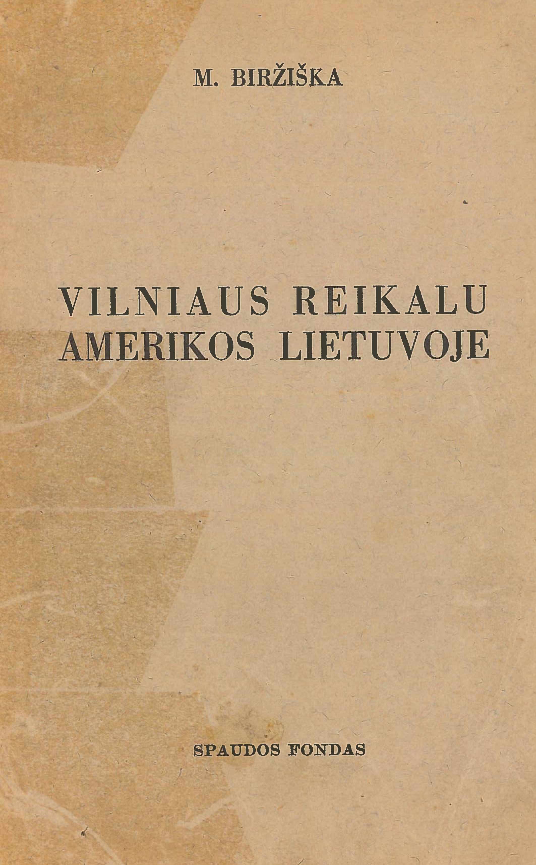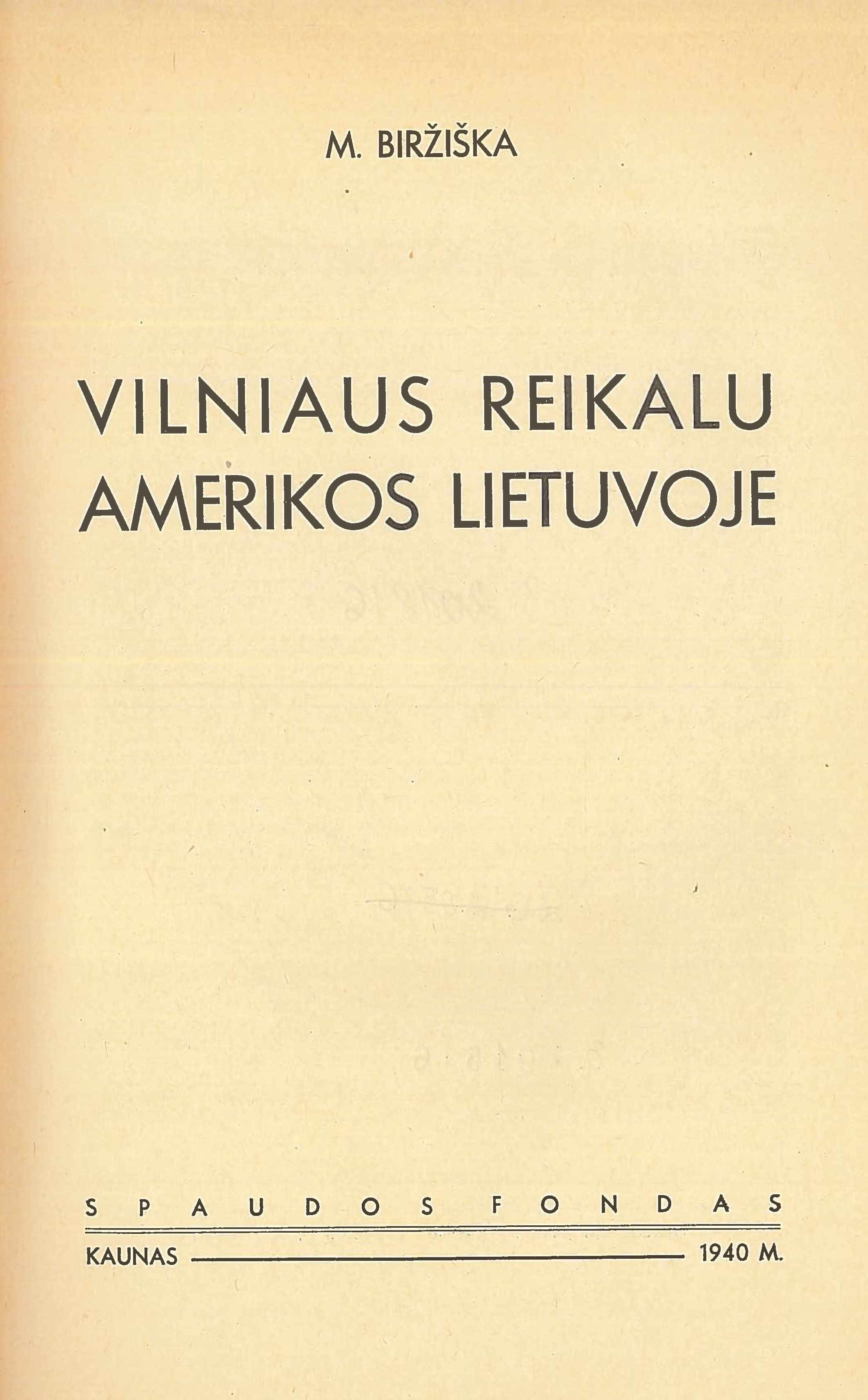 | Antraštė | Vilniaus reikalu Amerikos Lietuvoje / M. Biržiška. – Kaunas: Spaudos fondas, 1940. – 384 p. [lt] |