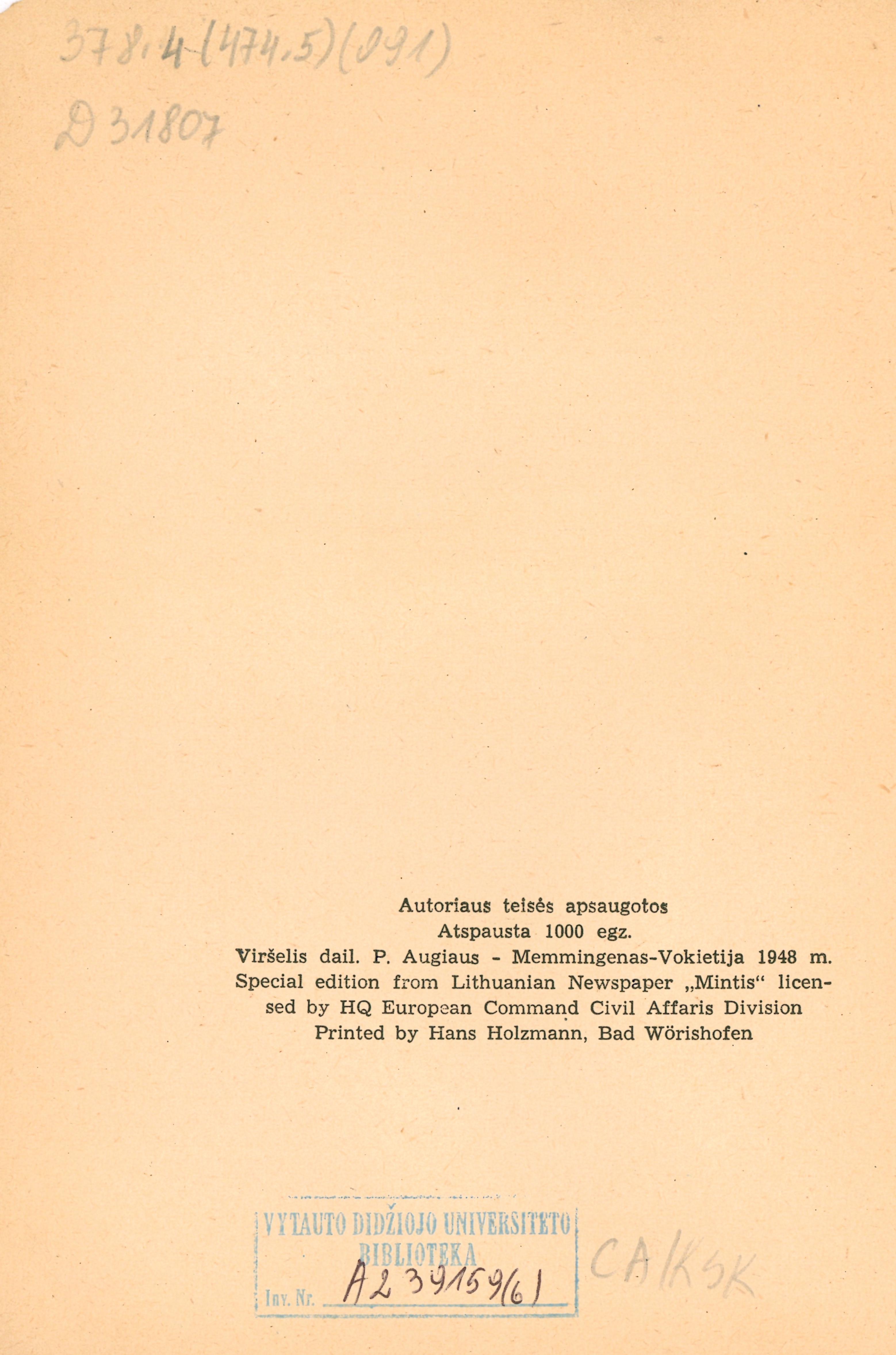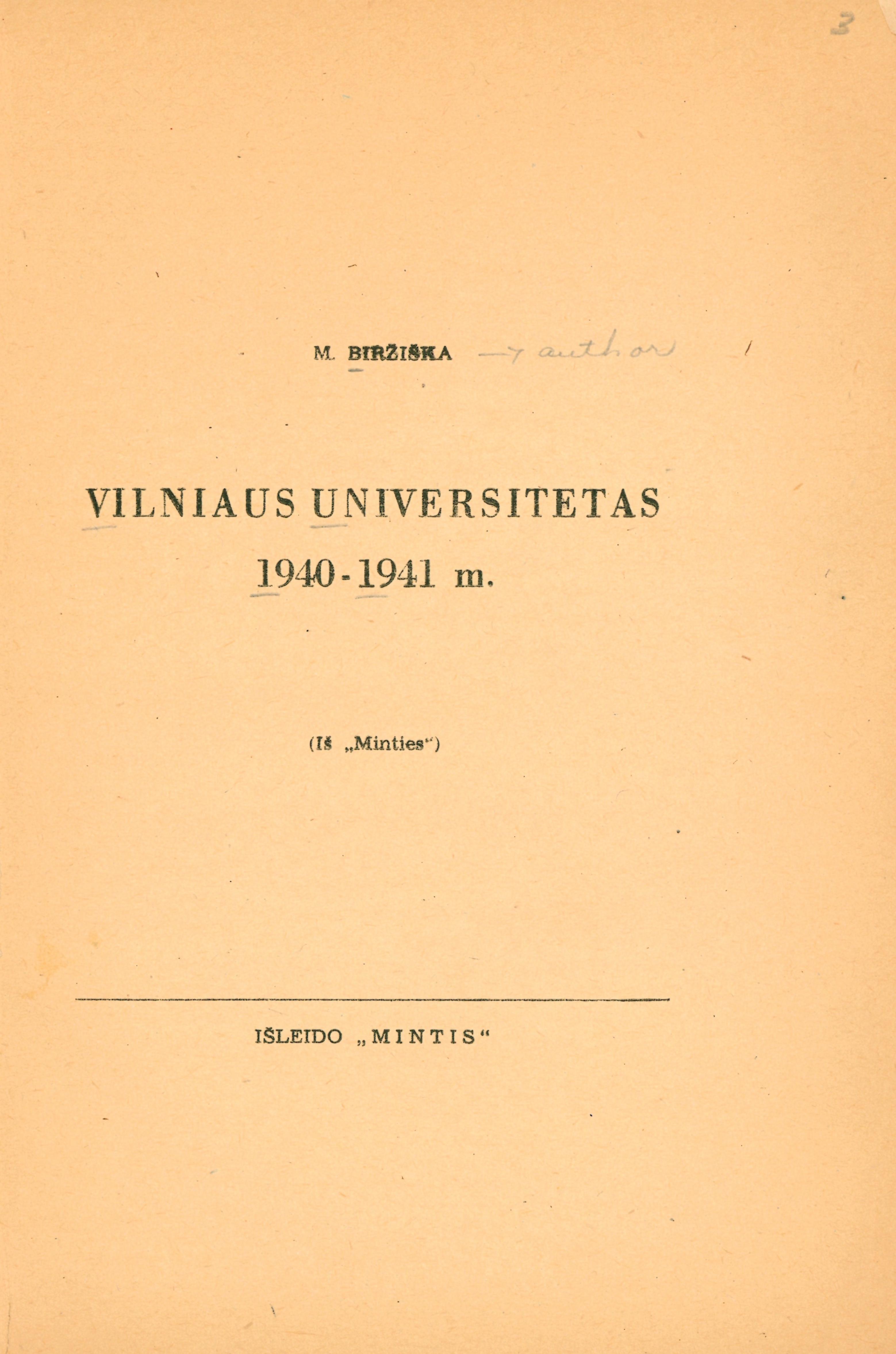 | Antraštė | Vilniaus universitetas 1940-1941 m. / M. Biržiška. – Memmingenas : Mintis, 1948. – 64 p. [lt] |