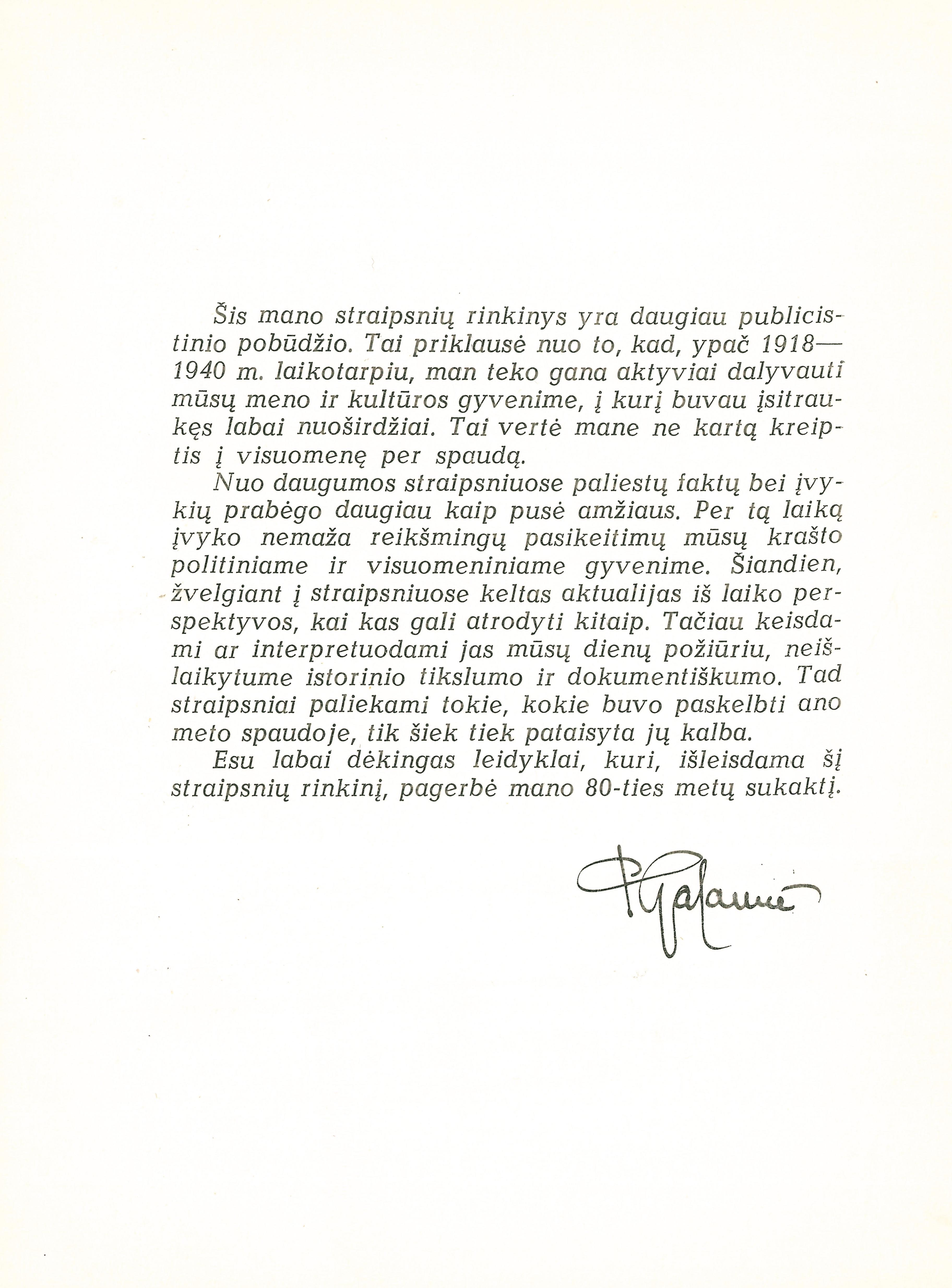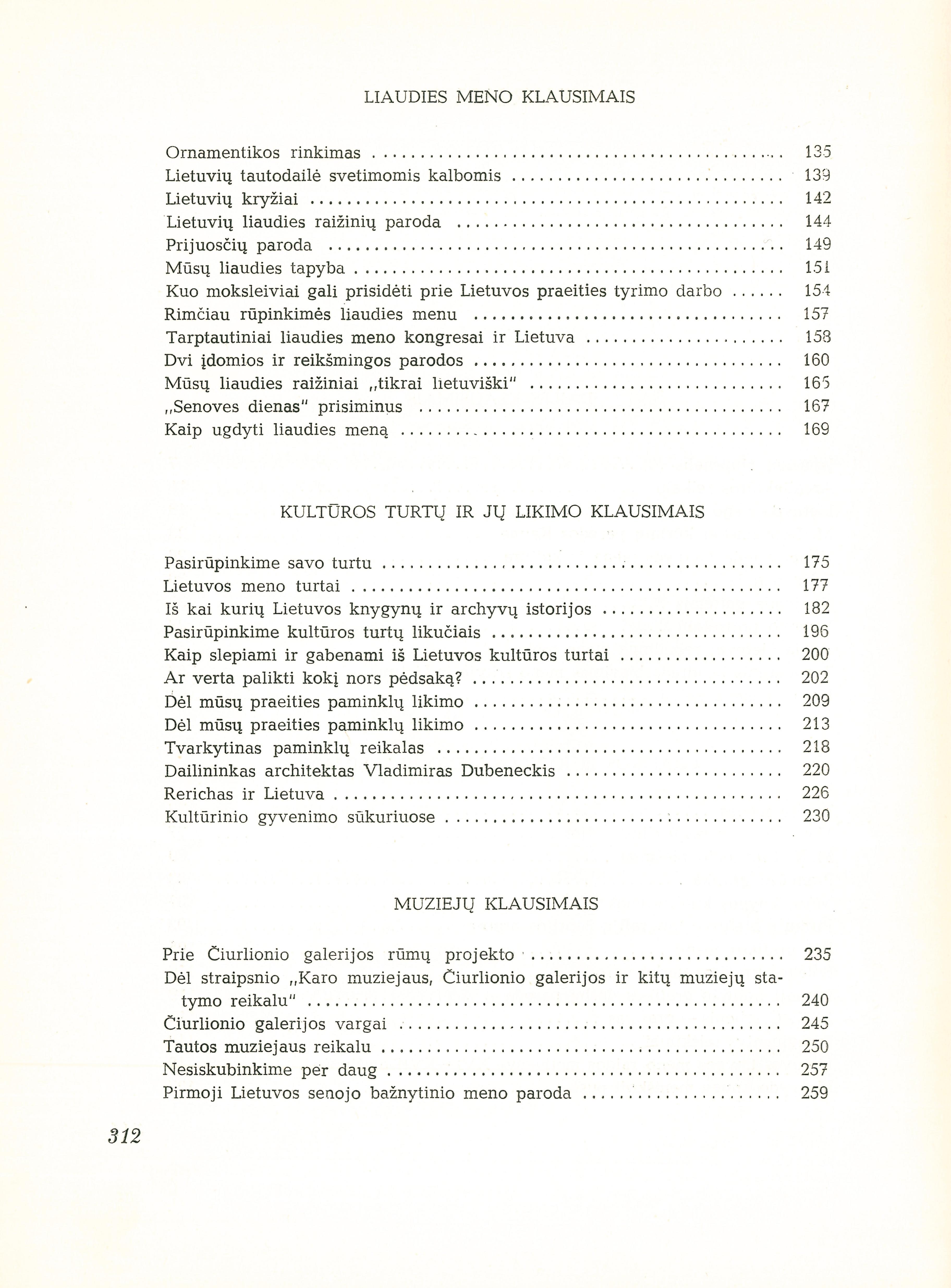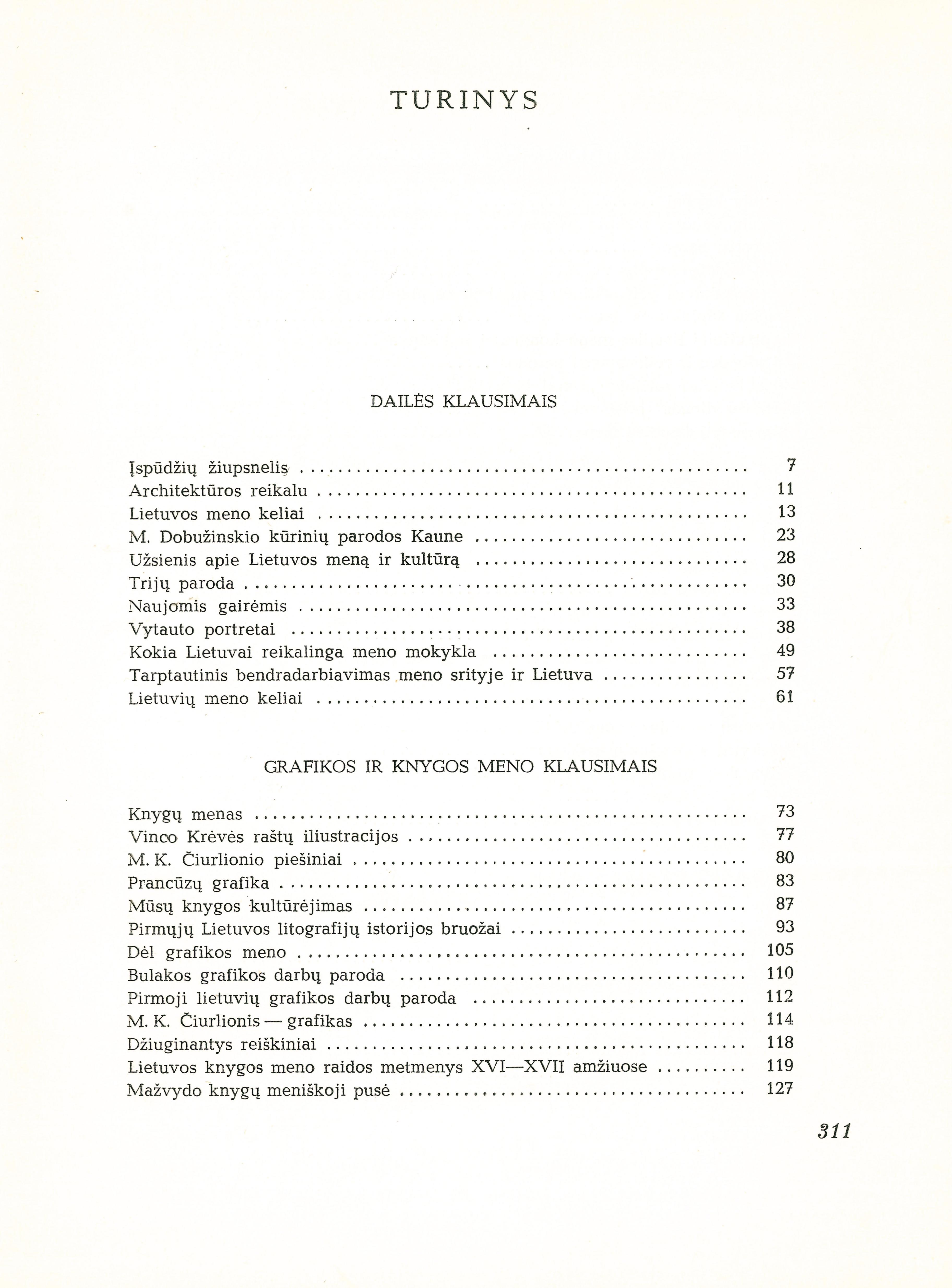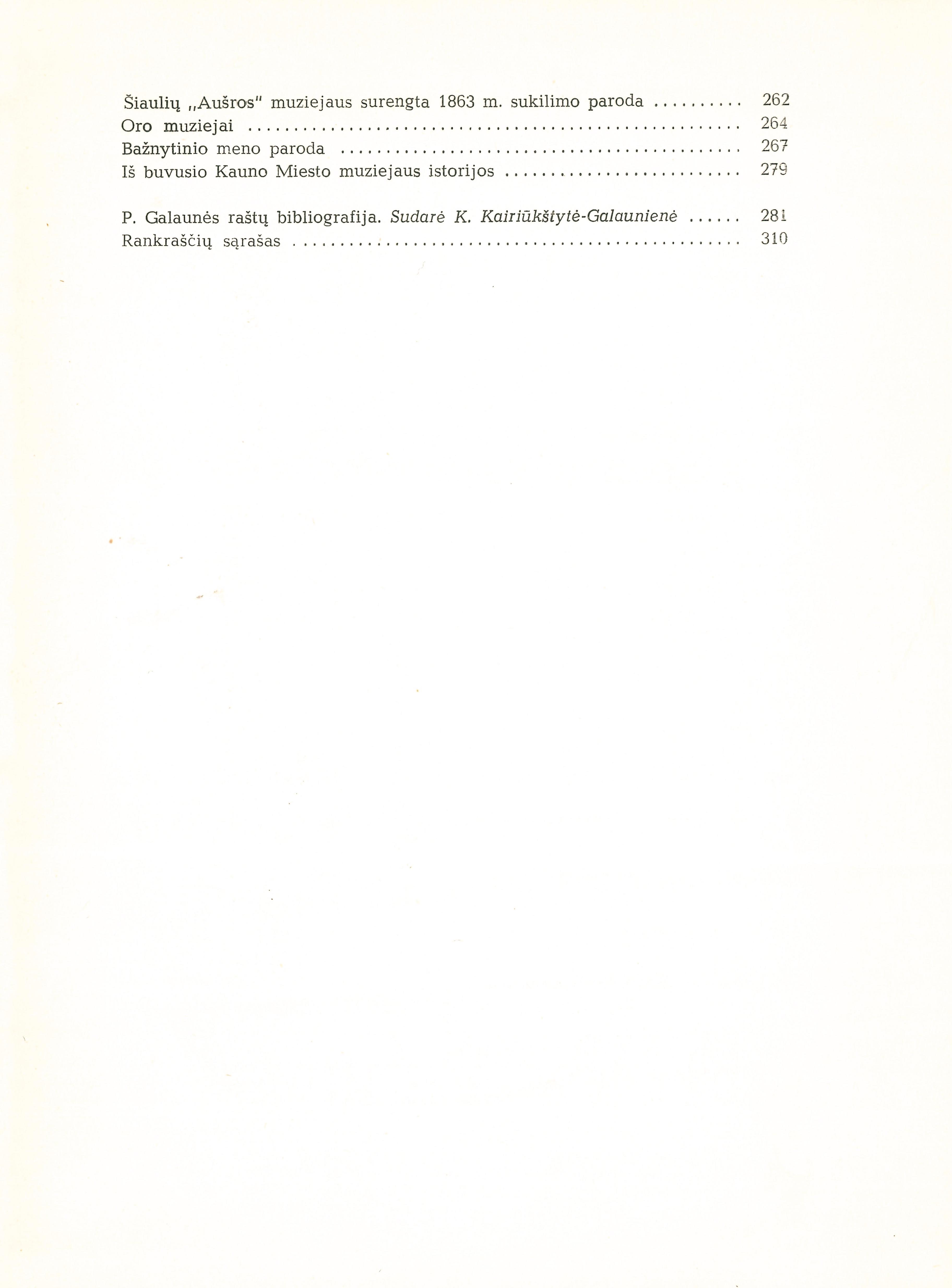 | Turinys: Įspūdžių žiupsnelis (1912); Architektūros reikalu (1918); Lietuvos meno keliai (1925); M. Dobužinskio kūrinių parodos Kaune (1925); Užsienis apie Lietuvos meną ir kultūrą (1927); Trijų paroda (1928); Naujomis gairėmis (1932); Vytauto portretai (1933); Kokia Lietuvai reikalinga meno mokykla (1934); Tarptautinis bendradarbiavimas meno srityje ir Lietuva (1935); Lietuvių meno keliai (1935); Knygų menas (1925); Vinco Krėvės raštų iliustracijos (1926); M. K. Čiurlionio piešiniai (1929); Prancūzų grafika (1930); Mūsų knygos kultūrėjimas (1933); Pirmųjų Lietuvos litografijų istorijos bruožai (1933); Dėl grafikos meno (1934); Bulakos grafikos darbų paroda (1937); Pirmoji lietuvių grafikos darbų paroda (1937); M. K. Čiurlionis - grafikas (1937); Džiuginantys reiškiniai (1937); Lietuvos knygos meno raidos metmenys XVI—XVII amžiuose (1941); Mažvydo knygų meniškoji pusė (1947); Ornamentikos rinkimas (1920); Lietuvių tautodailė svetimomis kalbomis (1926); Lietuvių kryžiai (1926); Lietuvių liaudies raižinių paroda (1927); Prijuosčių paroda (1927); Mūsų liaudies tapyba (1928); Kuo moksleiviai gali prisidėti prie Lietuvos praeities tyrimo darbo (1931); Rimčiau rūpinkimės liaudies menu (1932); Tarptautiniai liaudies meno kongresai ir Lietuva (1932); Dvi įdomios ir reikšmingos parodos (1932); Mūsų liaudies raižiniai „tikrai lietuviški" (1934); ,,Senovės dienas" prisiminus (1937); Kaip ugdyti liaudies meną (1964); Pasirūpinkime savo turtu (1912); Lietuvos meno turtai (1920); Iš kai kurių Lietuvos knygynų ir archyvų istorijos (1920); Pasirūpinkime kultūros turtų likučiais (1923); Kaip slepiami ir gabenami iš Lietuvos kultūros turtai (1923); Ar verta palikti kokį nors pėdsaką? (1924); Dėl mūsų praeities paminklų likimo (1926); Dėl mūsų praeities paminklų likimo (1926); Tvarkytinas paminklų reikalas (1932); Dailininkas architektas Vladimiras Dubeneckis (1937); Rerichas ir Lietuva (1966); Kultūrinio gyvenimo sūkuriuose (1968); Prie Čiurlionio galerijos rūmų projekto (1924); Dėl straipsnio „Karo muziejaus, Čiurlionio galerijos ir kitų muziejų statymo reikalu" (1924); Čiurlionio galerijos vargai (1927); Tautos muziejaus reikalu (1927); Nesiskubinkime per daug (1929); Pirmoji Lietuvos senojo bažnytinio meno paroda (1931); Šiaulių „Aušros" muziejaus surengta 1863 m. sukilimo paroda (1933); Oro muziejai (1934); Bažnytinio meno paroda (1939); Iš buvusio Kauno Miesto muziejaus istorijos (1959); P. Galaunės raštų bibliografija. Sudarė K. Kairiūkštytė-Galaunienė (p. 281-209). [lt] | |
