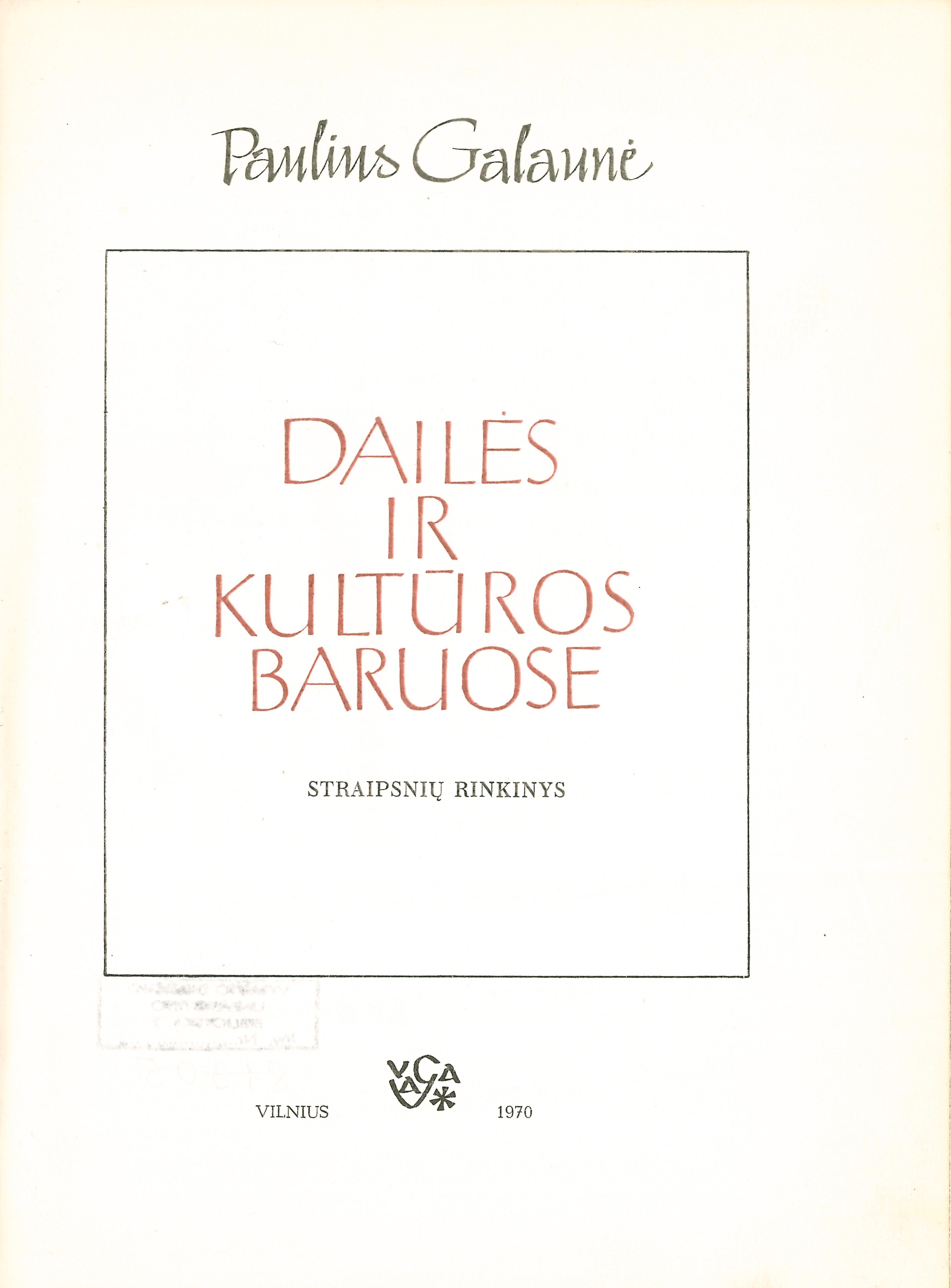| Antraštė | Dailės ir kultūros baruose: straipsnių rinkinys / Paulius Galaunė. – Vilnius: Vaga, 1970. – 313 p. [lt] |