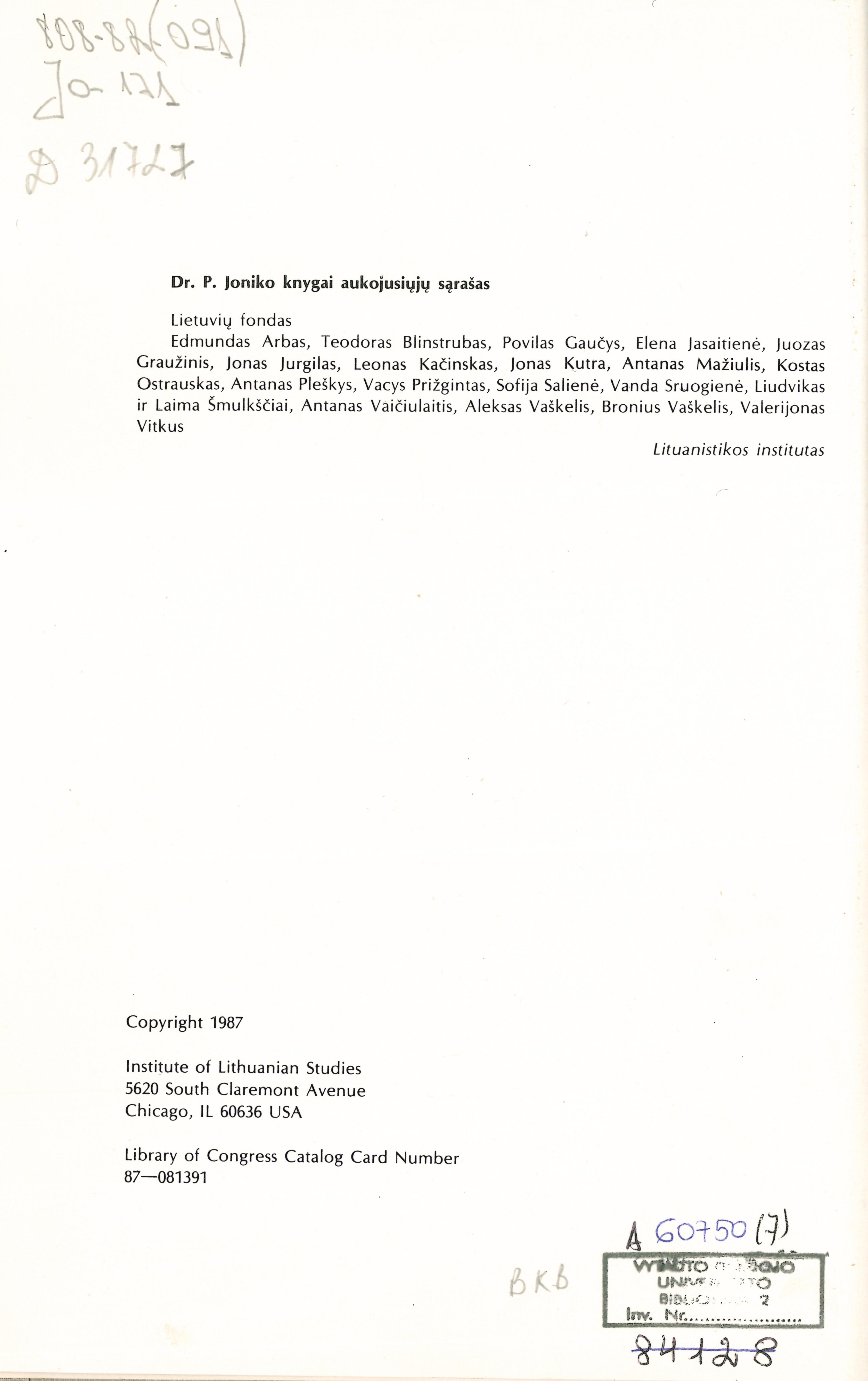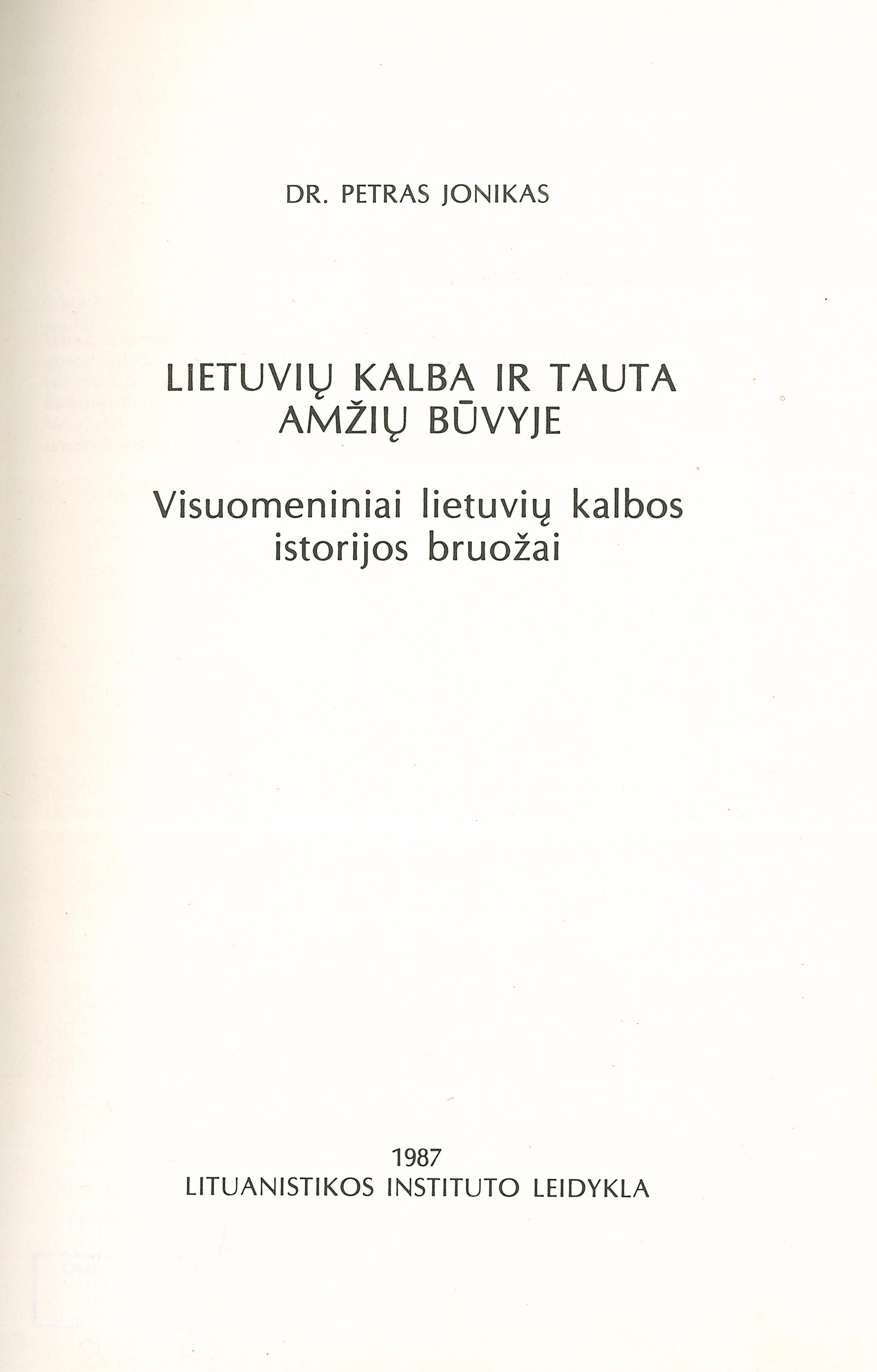 Lietuvių kalba ir tauta amžių būvyje : visuomeniniai lietuvių kalbos istorijos bruožai = The Lithuanian language and nation through the ages : outline of a history of Lithuanian in its social context / Petras Jonikas. – Chicago (Ill.) : Lituanistikos instituto leidykla, 1987. – 454 p. : faks.