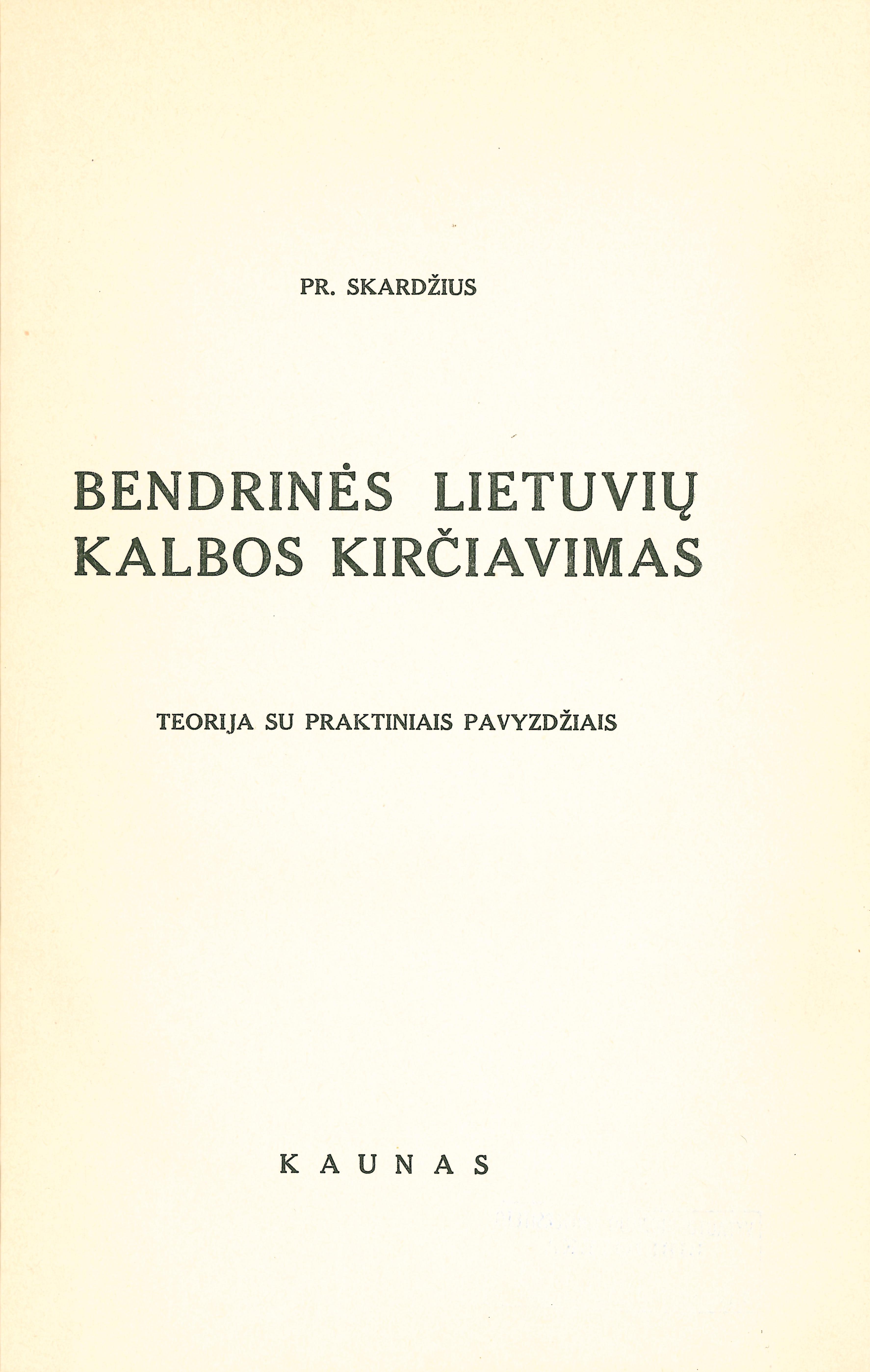 Bendrinės lietuvių kalbos kirčiavimas : teorija su praktiniais pavyzdžiais / Pr. Skardžius. – Kaunas, 1936. – 95 p.