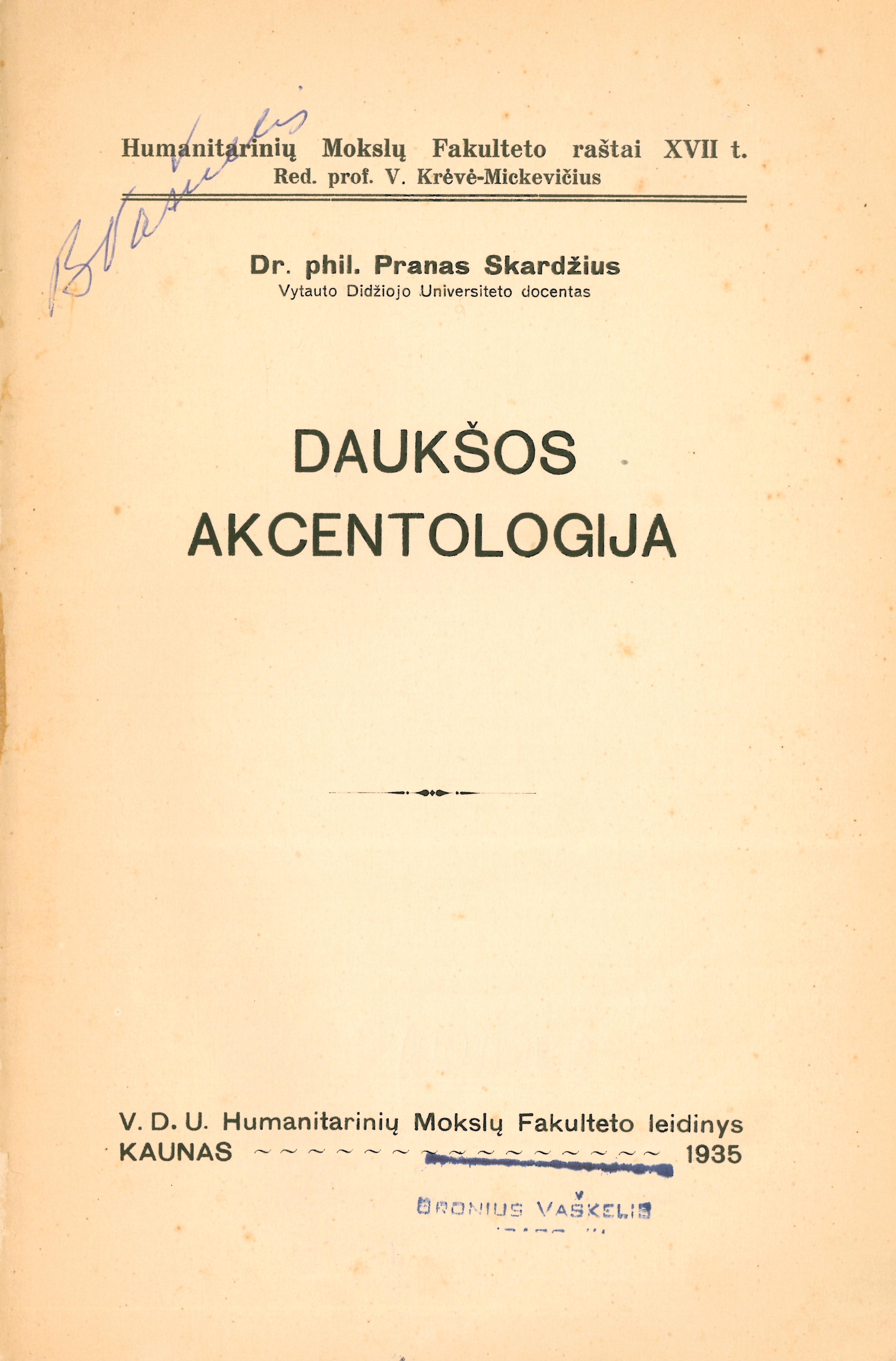 Daukšos akcentologija / Pranas Skardžius. – Kaunas : Humanitarinių mokslų fakultetas, 1935. – 311 p. : iliustr. – (Humanitarinių mokslų fakulteto raštai ; T. XVII)