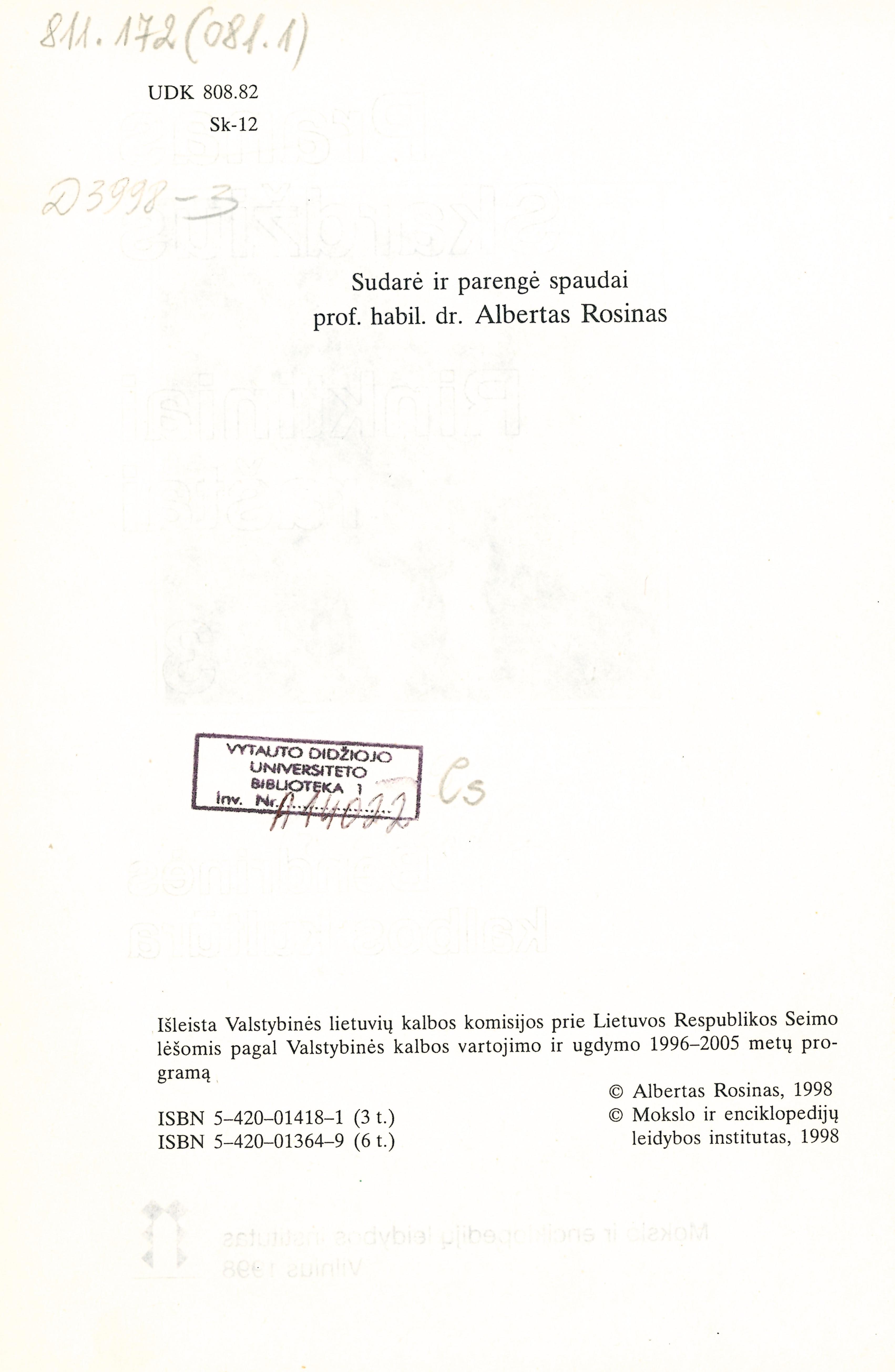 Rinktiniai raštai / Pranas Skardžius ; sudarė ir parengė Albertas Rosinas. – Fotografuotas leidimas. – Vilnius : Mokslo ir enciklopedijų leidykla, 1996-2014. – 6 tomai. – (Kalbos ugdymo programa)