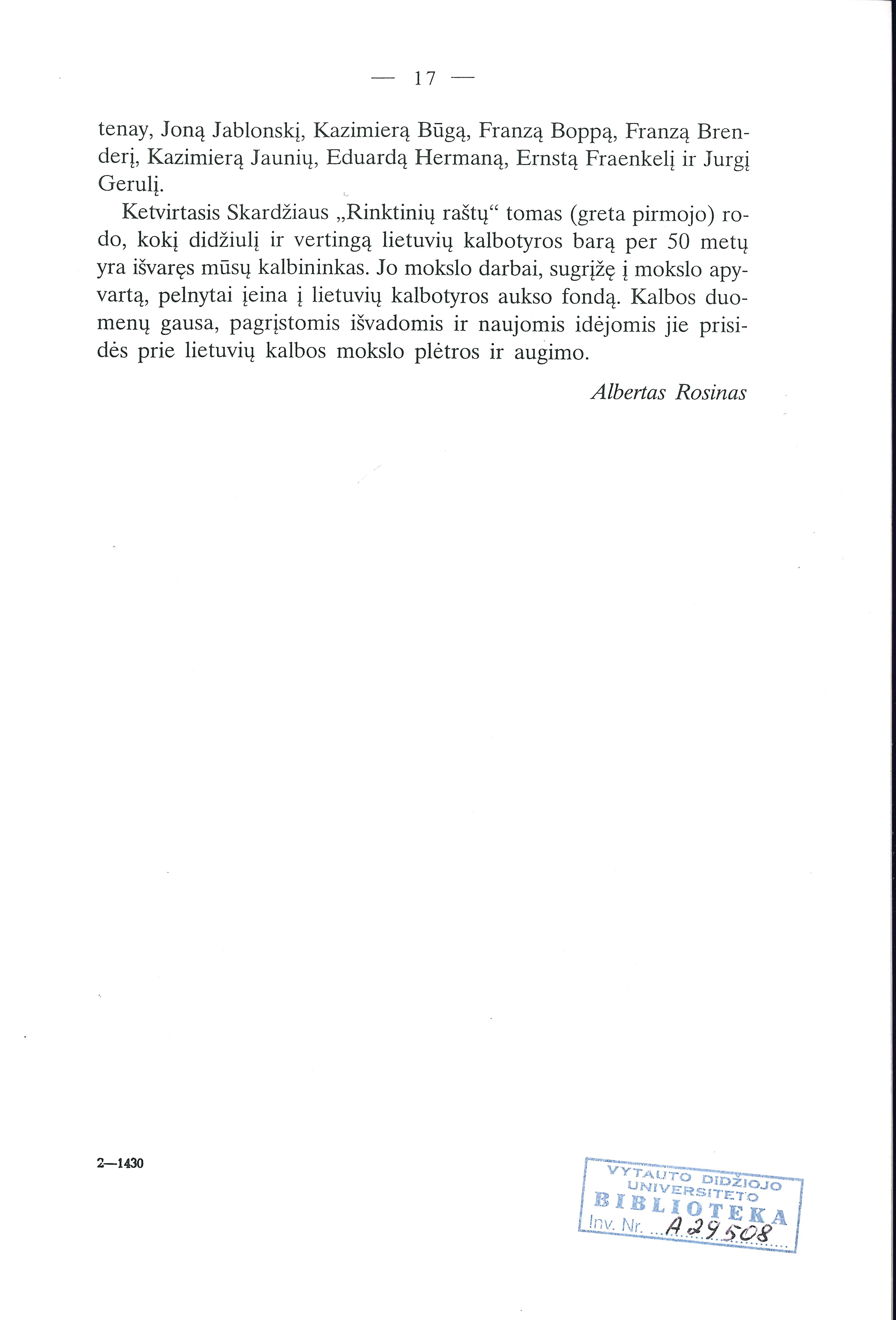 Rinktiniai raštai / Pranas Skardžius ; sudarė ir parengė Albertas Rosinas. – Fotografuotas leidimas. – Vilnius : Mokslo ir enciklopedijų leidykla, 1996-2014. – 6 tomai. – (Kalbos ugdymo programa)