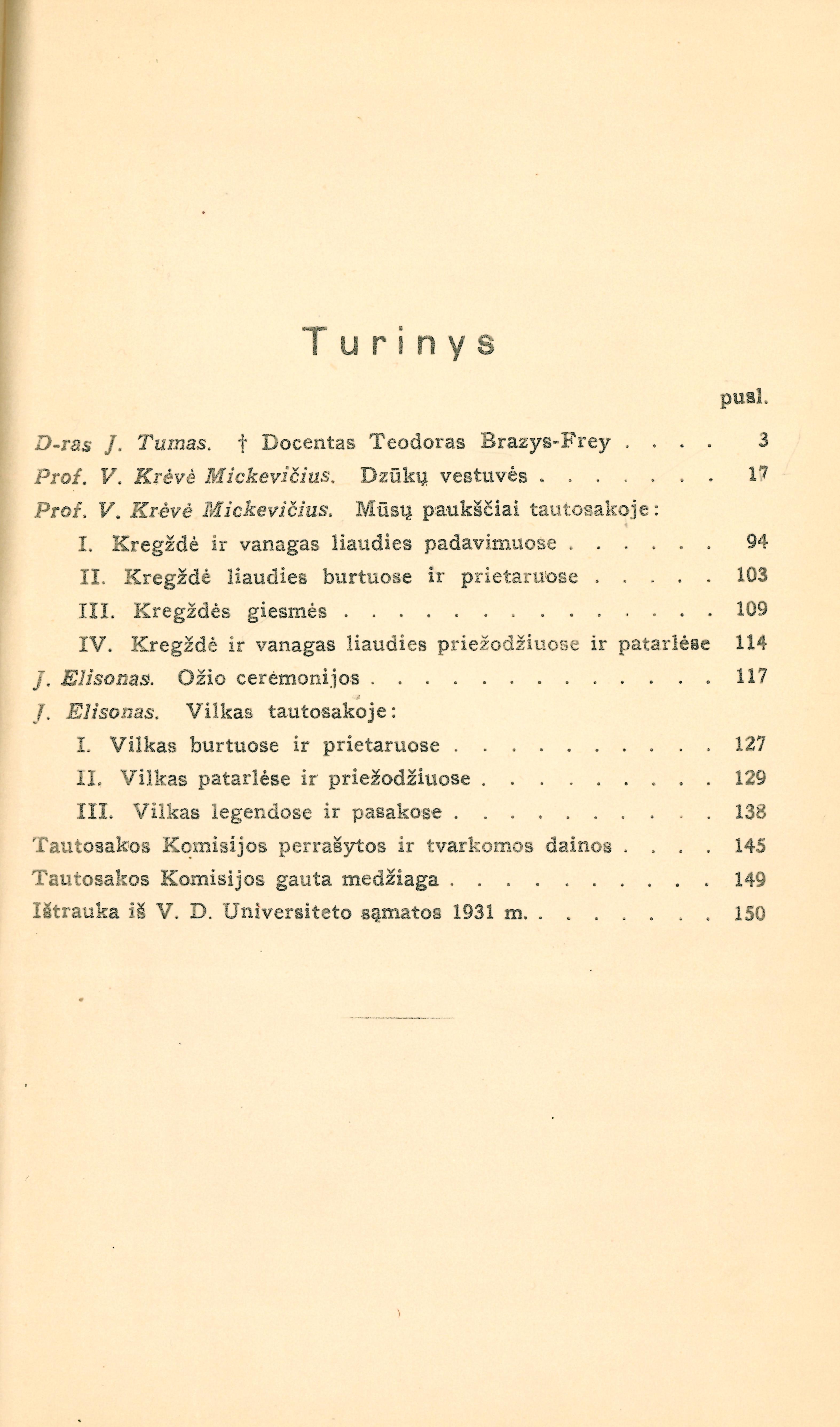 | Tumas Juozas. Docentas Teodoras Brazys-Frey (p. 3-16); Dzūkų vestuvės / parengė Vincas Krėvė-Mickevičius (p. 17-93); Mūsų paukščiai tautosakoje / parengė Vincas Krėvė-Mickevičius. D. 2 (p. 94-116); Ožio ceremonijos / parengė Jurgis Elisonas (p. 117-126); Vilkas tautosakoje / parengė Jurgis Elisonas (p. 127-144) | |
