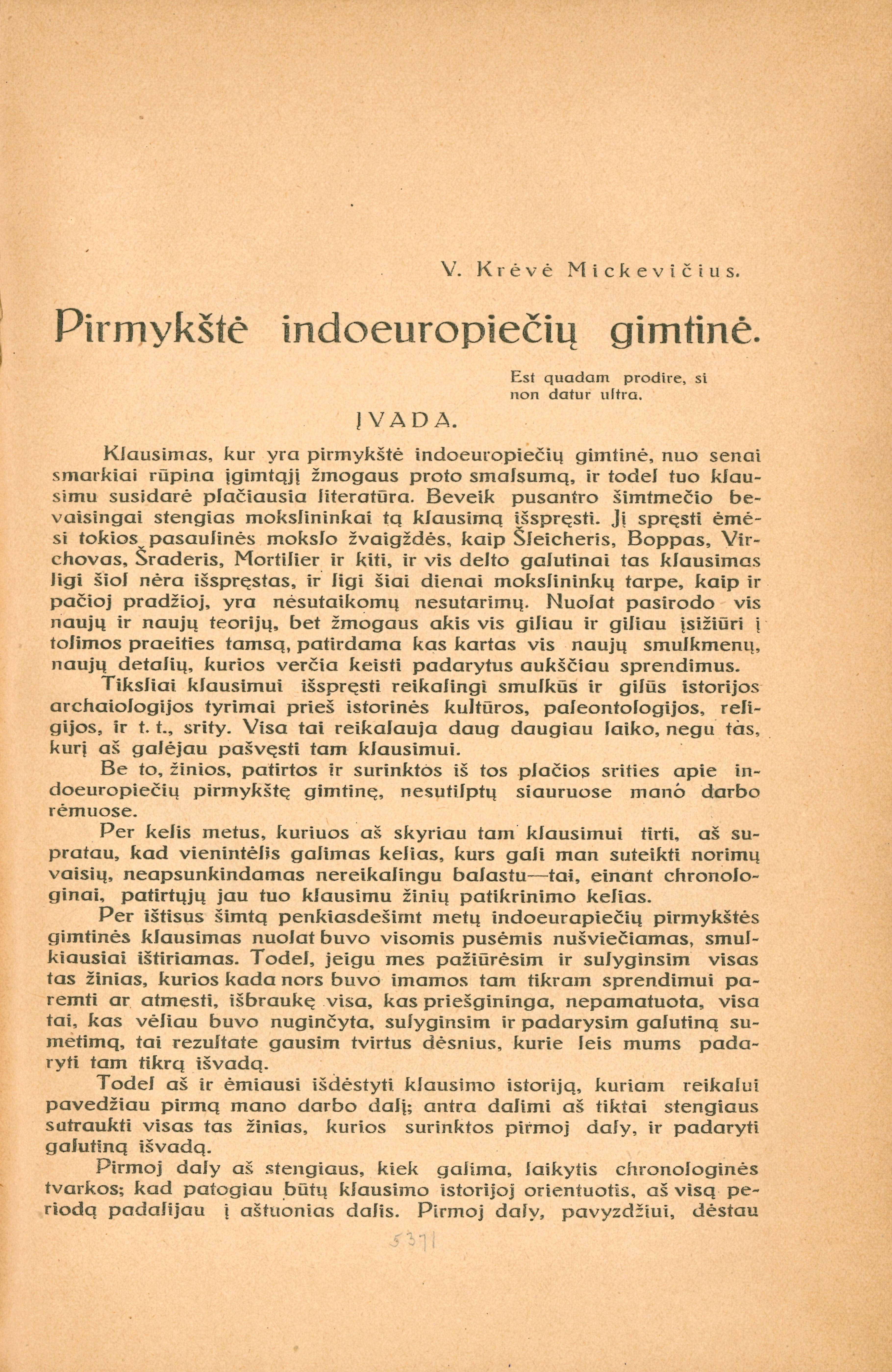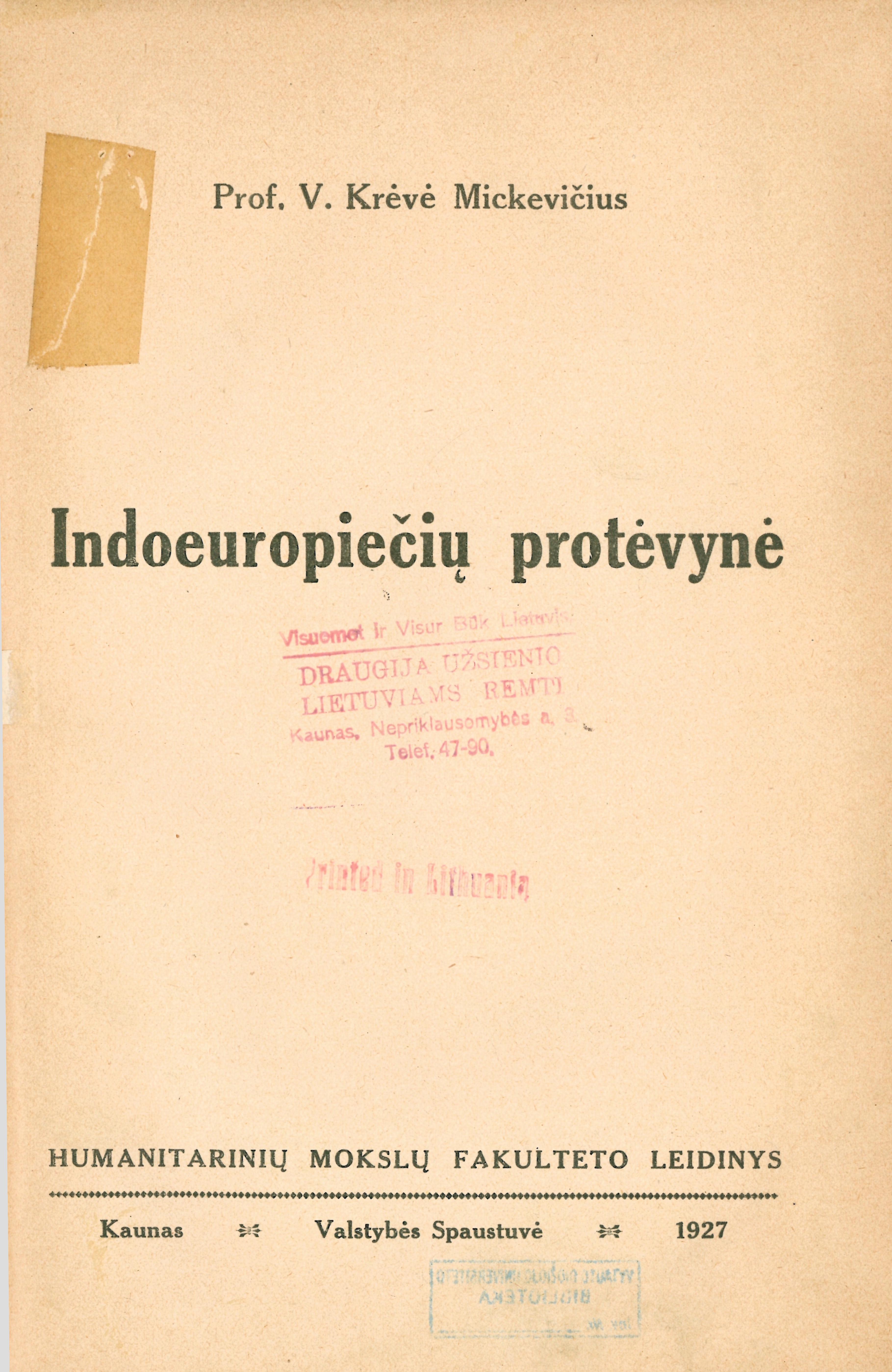 Indoeuropiečių protėvynė / V. Krėvė Mickevičius. – Kaunas : Humanitarinių mokslų fakulteto leidinys, 1927. – 146 p.