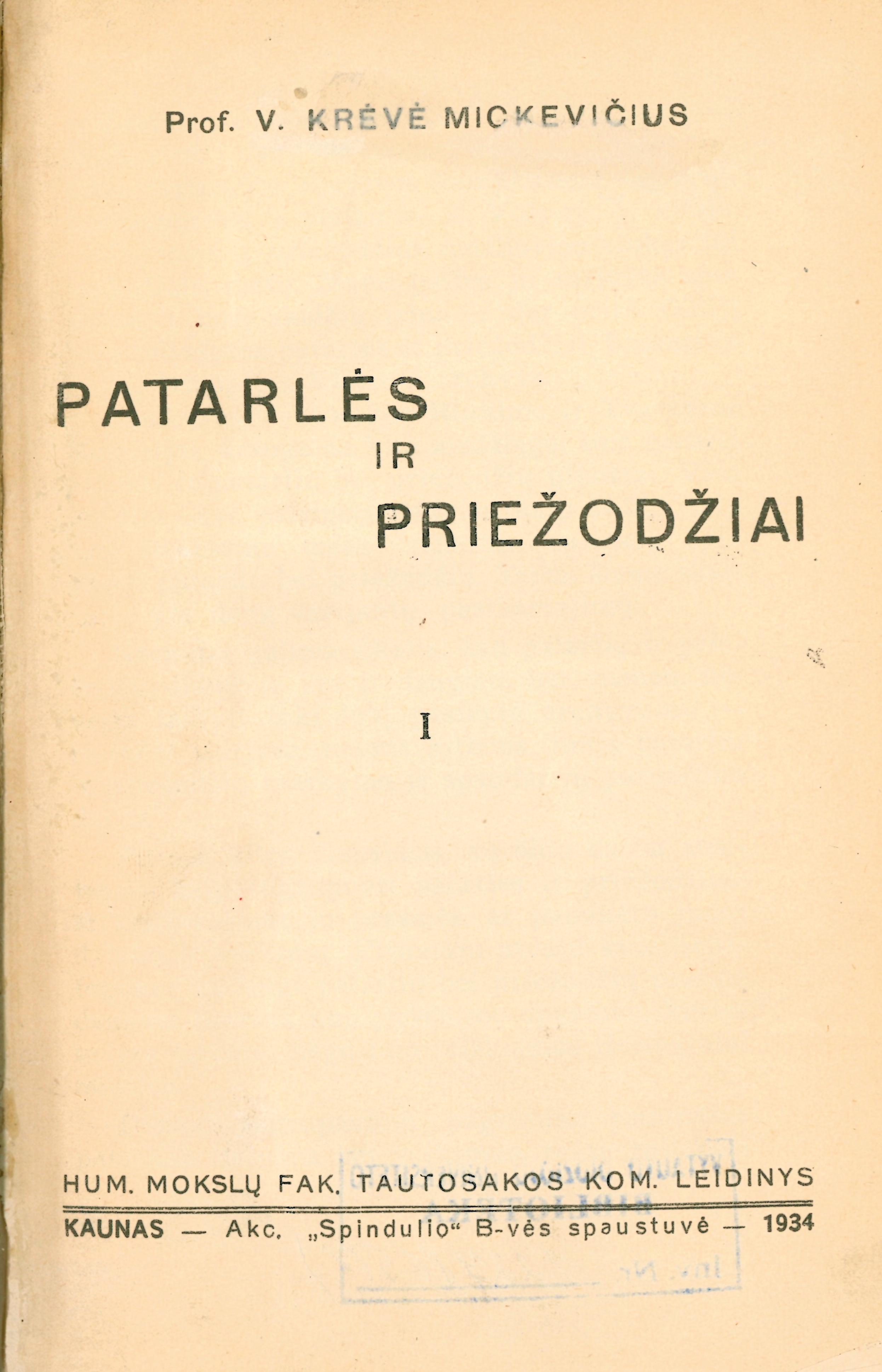 Patarlės ir priežodžiai / V. Krėvė Mickevičius. – Kaunas : Humanitarinių mokslų fakulteto Tautosakos komisija, 1934-1937. – 4 dalys.