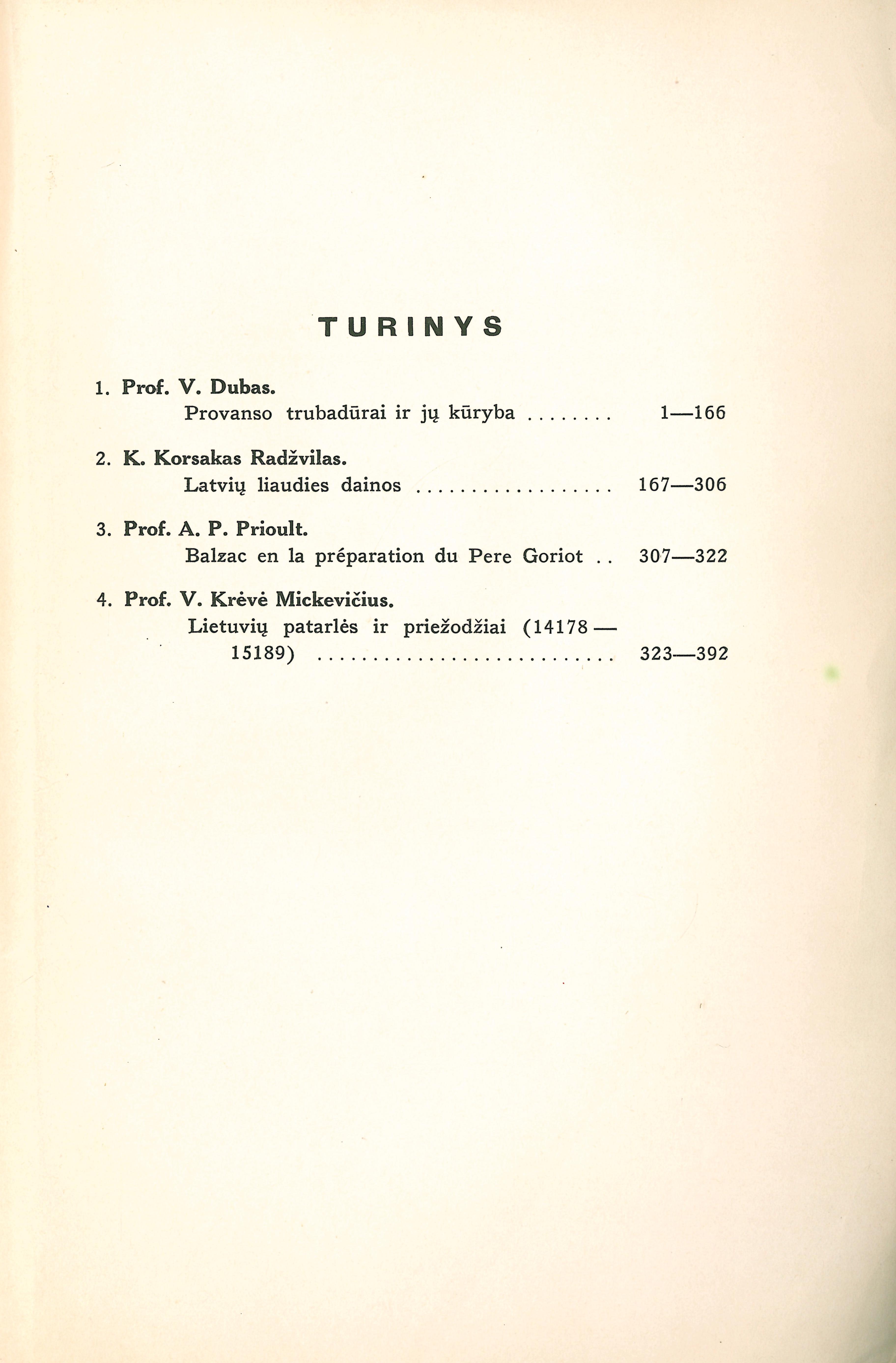 | Darbai ir dienos: Humanitarinių mokslų fakulteto Filologijos skyriaus leidinys = Acta et commentationes ordinis philologorum V. M. UniversitatisDubas Vladas. Provanso trubadūrai ir jų kūryba (p. 1-166); Korsakas-Radžvilas Kostas. Latvių liaudies dainos (p. 167-306); Prioult Albert. Balzac en 1834 et la preparation du Pere Goriot (p. 307-322); Lietuvių patarlės ir priežodžiai (14178 - 15189). D. 4 / parengė Vincas Krėvė-Mickevičius (p. 323-392) | |