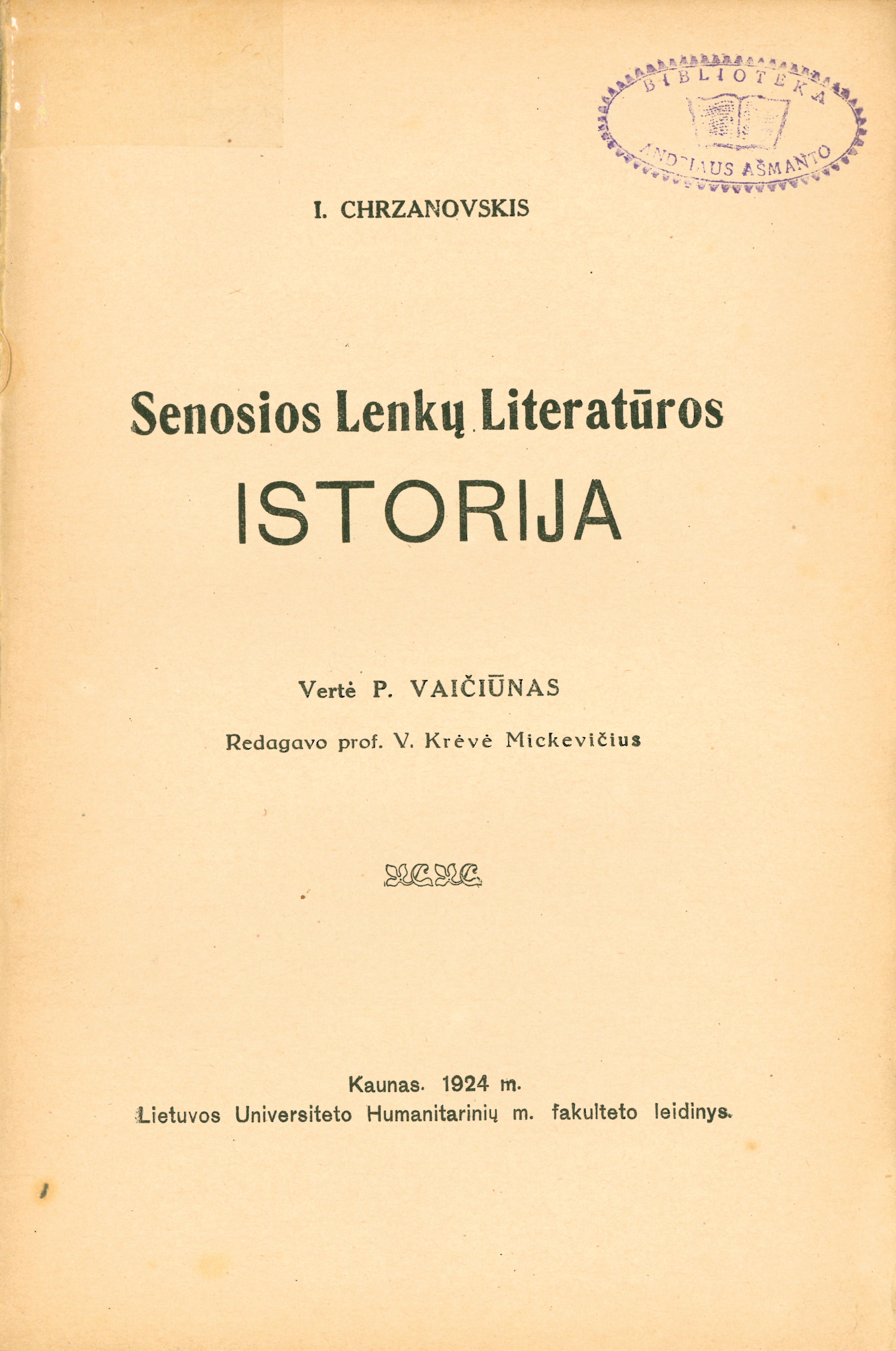 | Published | Kaunas: Lietuvos universiteto Humanitarinių m. fakulteto leidinys, 1924 |