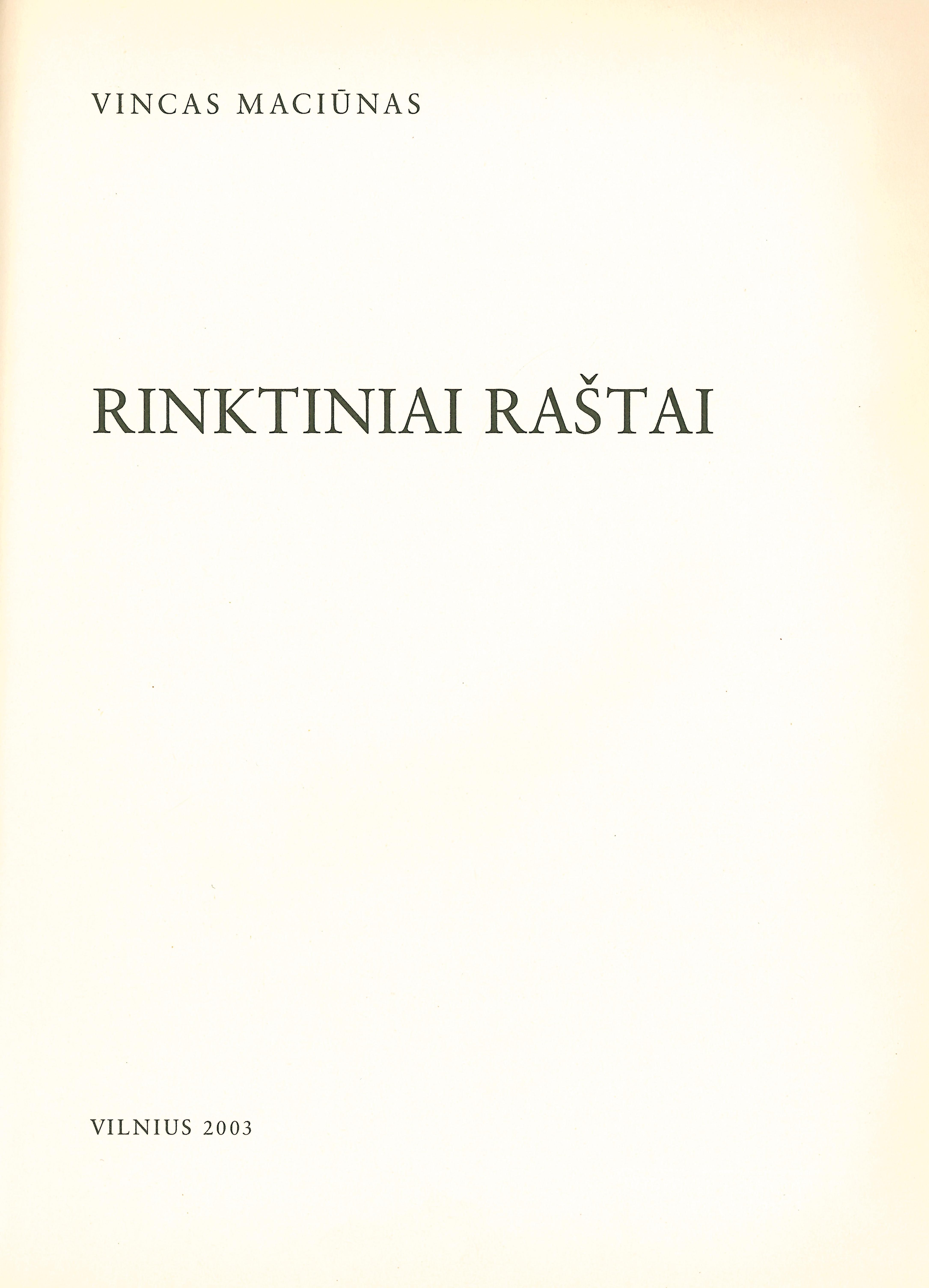 Rinktiniai raštai / Vincas Maciūnas ; sudarytojas ir baigiamojo straipsnio autorius Jonas Šlekys ; Lietuvių literatūros ir tautosakos institutas. – Vilnius : Lietuvių literatūros ir tautosakos institutas, 2003. – IX, 998 p. – (Senoji Lietuvos literatūra ; Kn. 14). – ISBN 9955475439.