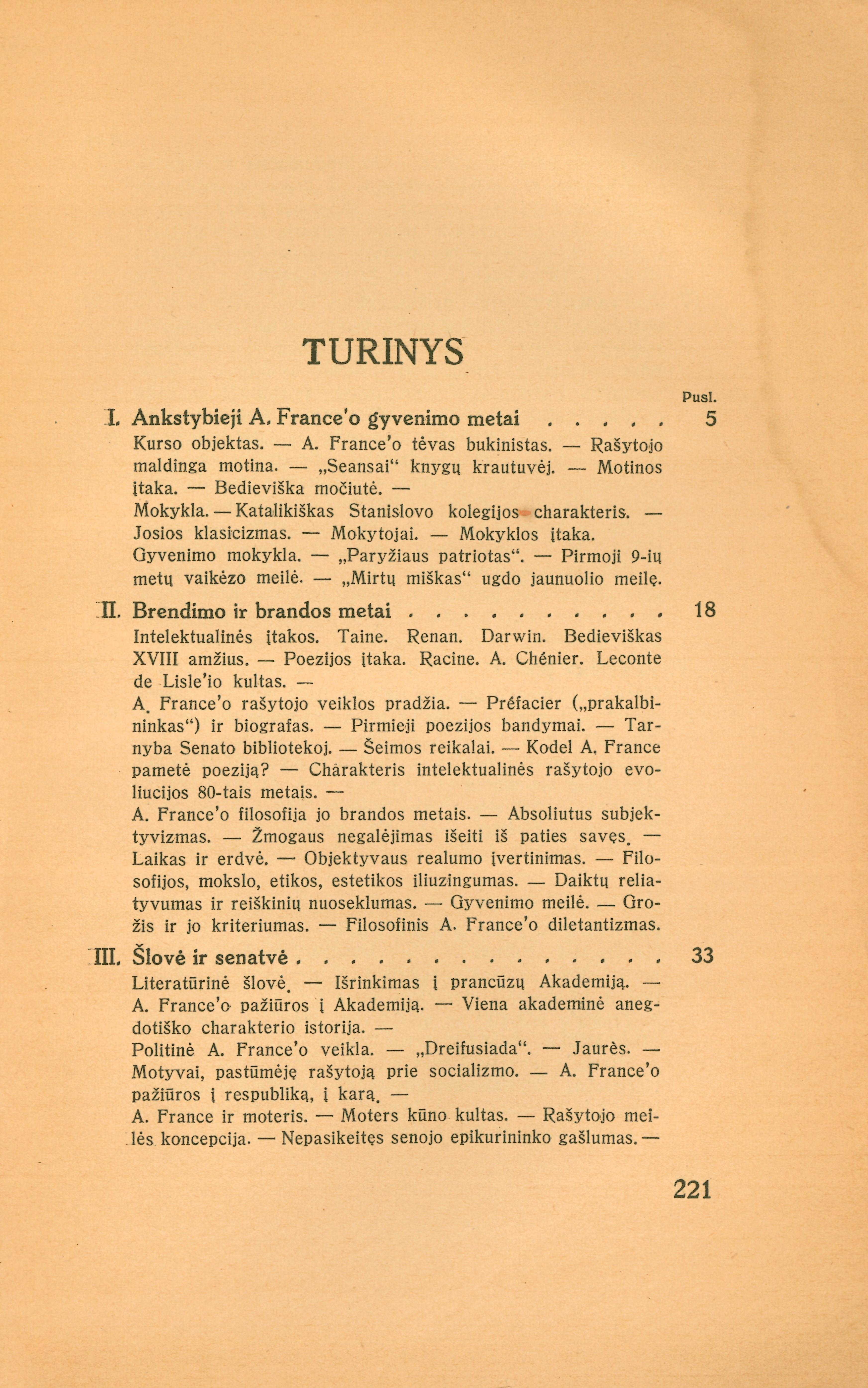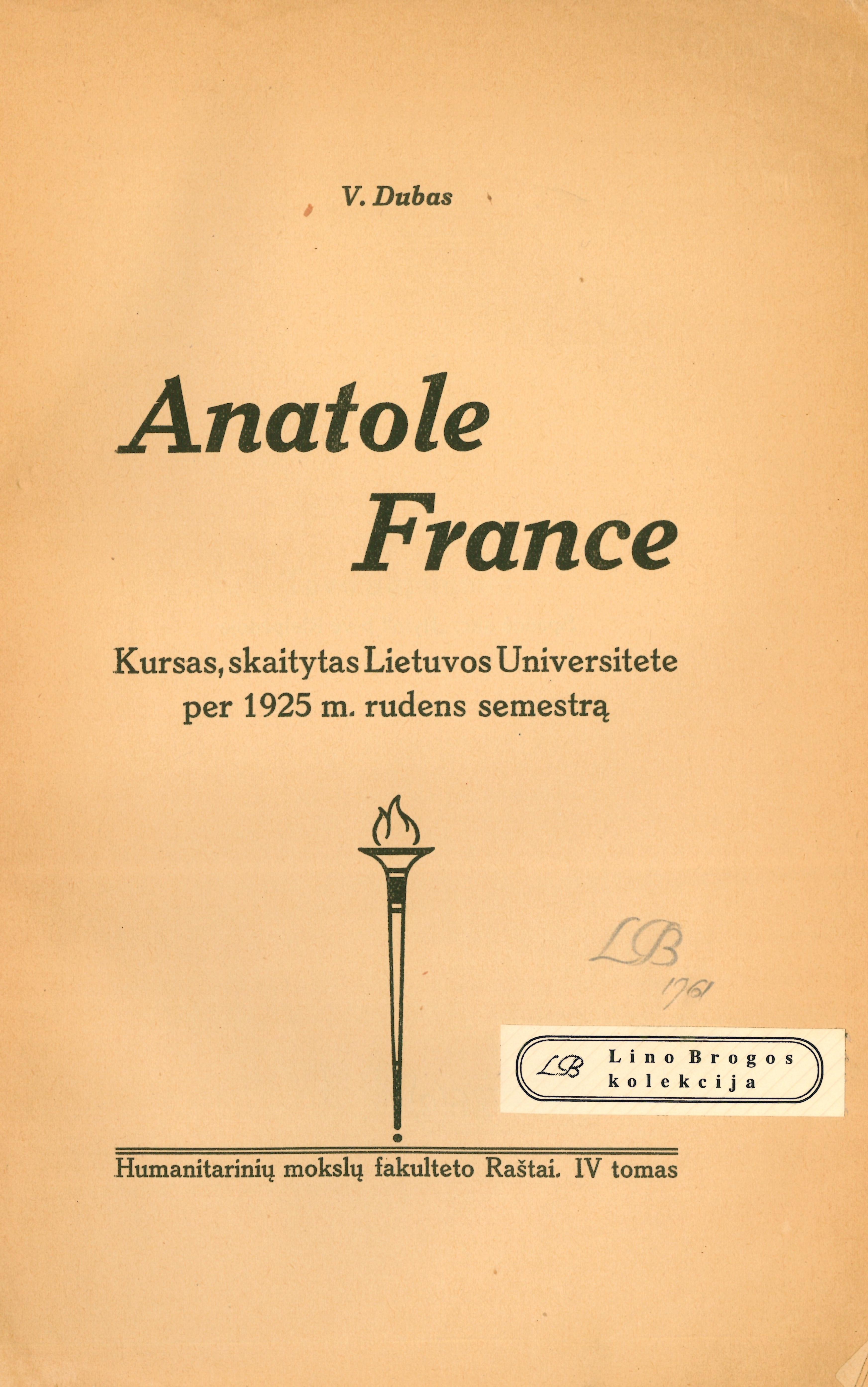 | Anatole France : kursas, skaitytas Lietuvos universitete per 1925 m. rudens semestrą / V. Dubas. – Kaunas : Humanitarinių mokslų fakultetas, [1928]. – 224 p. (Humanitarinių mokslų fakulteto raštai; t. 4) [lt] | |
