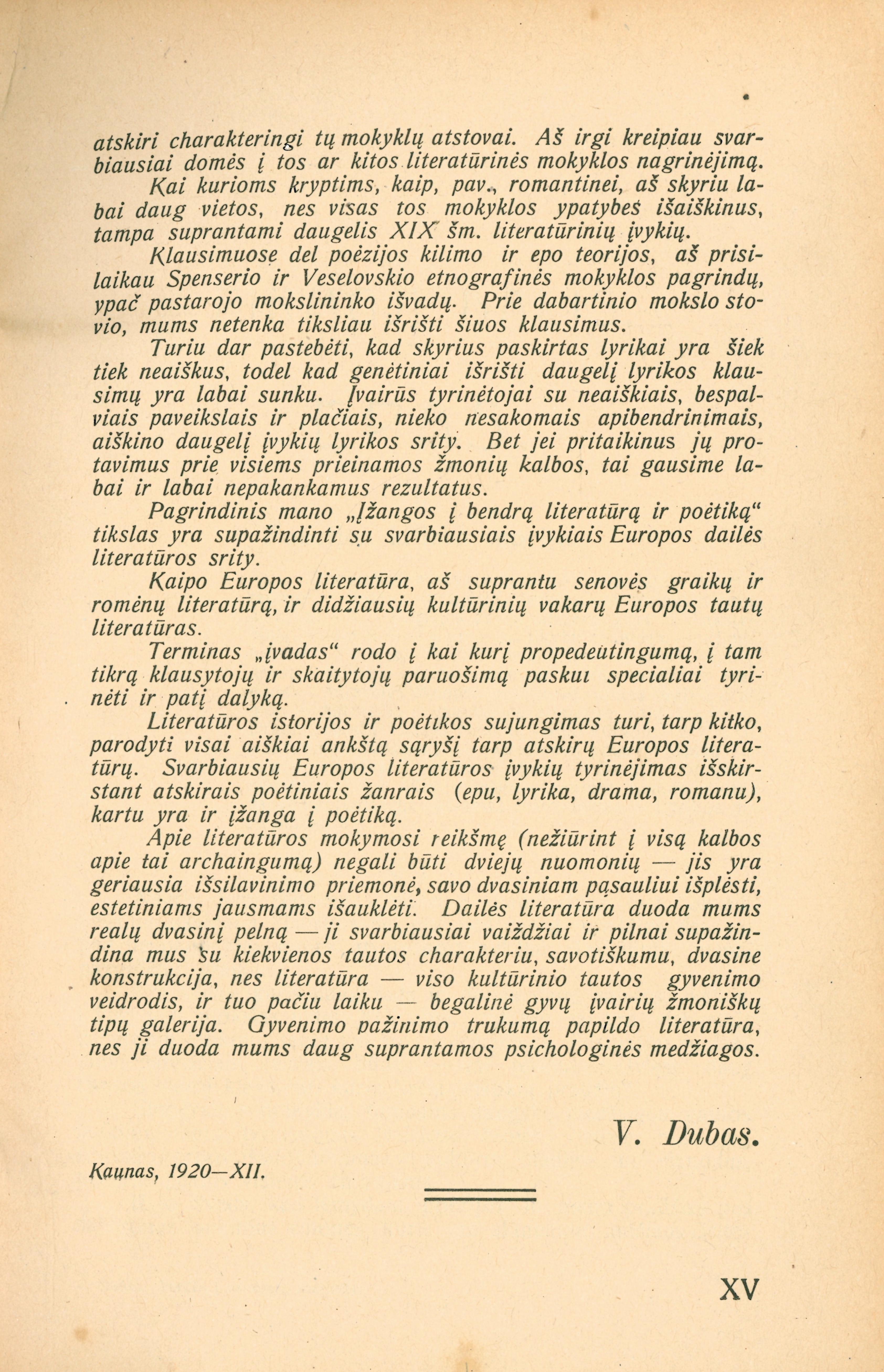| Įvadas į bendrąją literatūrą : kursas paskaitų, laikytų Kaune Aukštuosiuose Kursuose per 1920 m. pavasario semestrą / V. Dubas. – Kaunas ; Marijampolė : Dirva, 1923. – XV, 266 p. [lt] | |