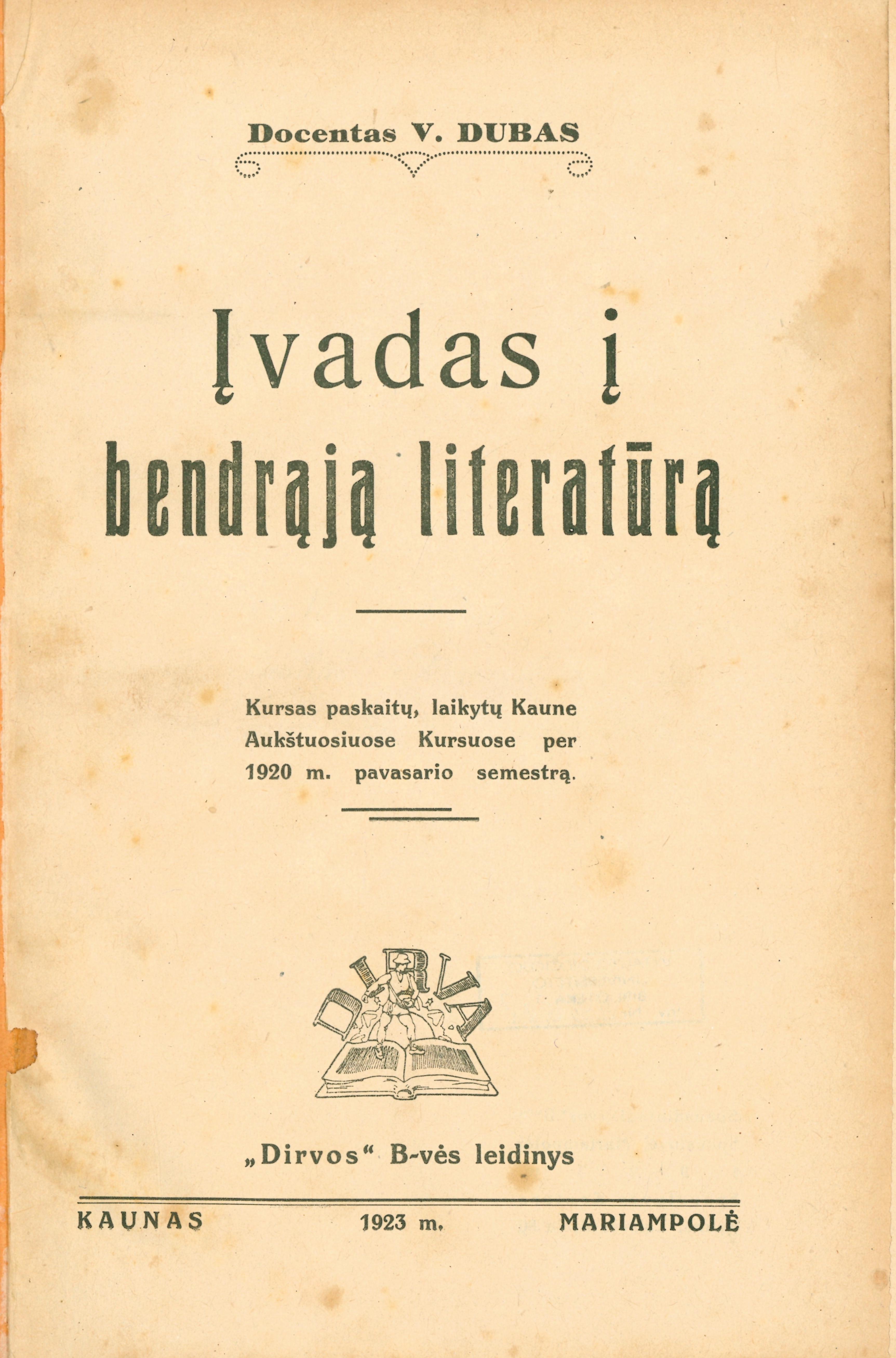| Antraštė | Įvadas į bendrąją literatūrą : kursas paskaitų, laikytų Kaune Aukštuosiuose Kursuose per 1920 m. pavasario semestrą / V. Dubas. – Kaunas ; Marijampolė : Dirva, 1923. – XV, 266 p. [lt] |