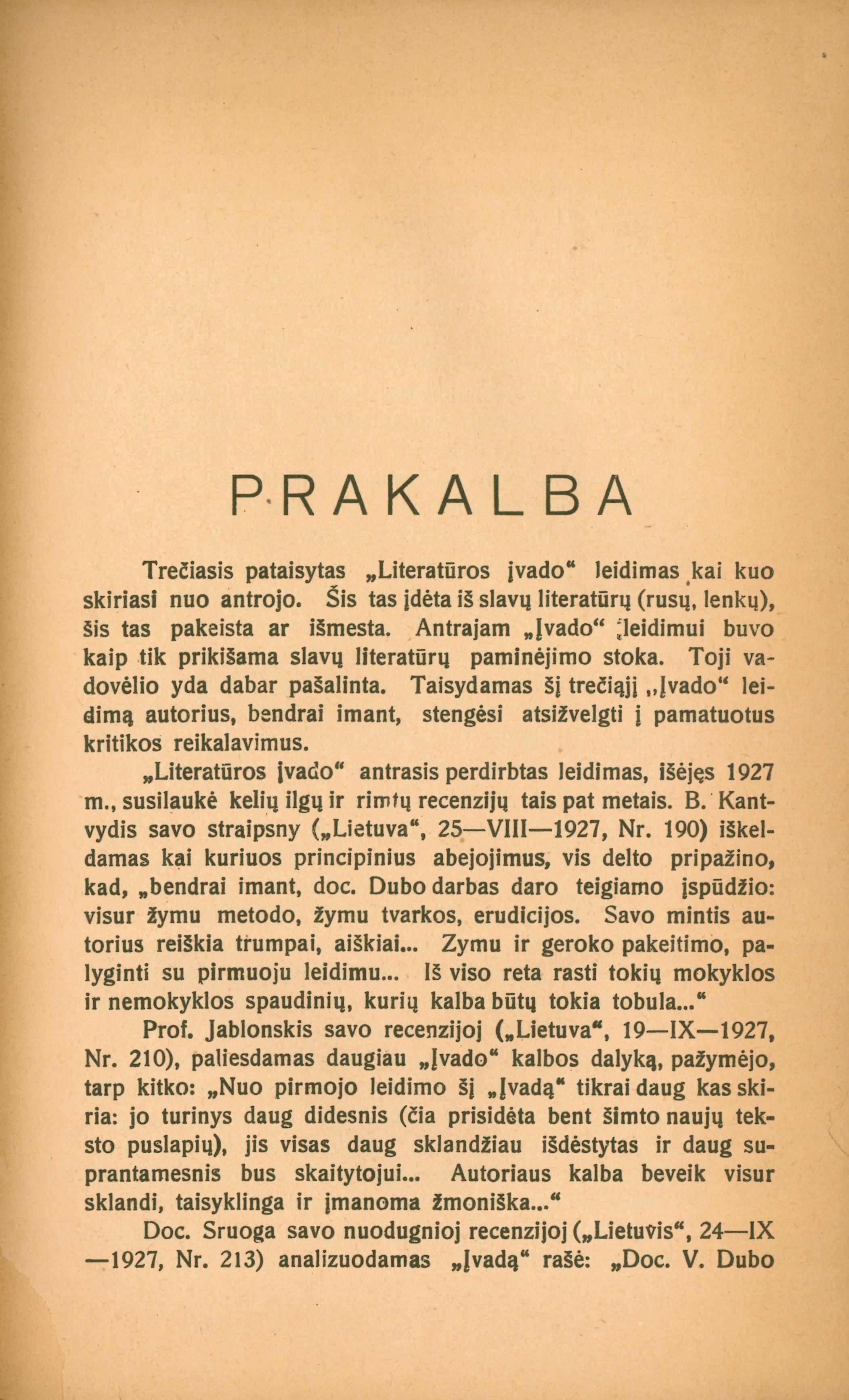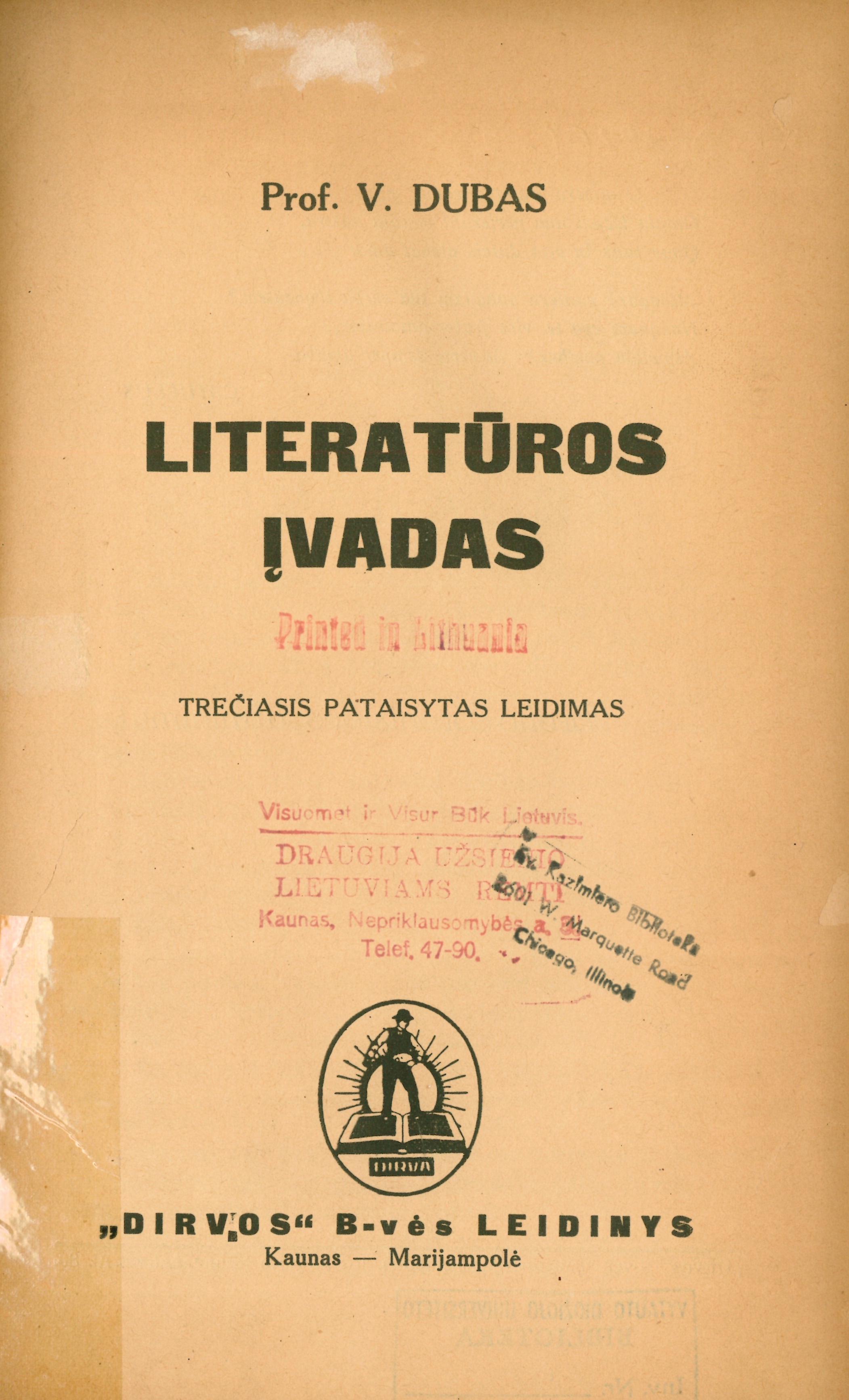 | Antraštė | Literatūros įvadas / V. Dubas. – 3-asis pataisytas leidimas. – Kaunas; Marijampolė : „Dirvos“ bendrovė, 1931. – 407 p. [lt] |